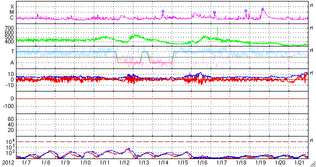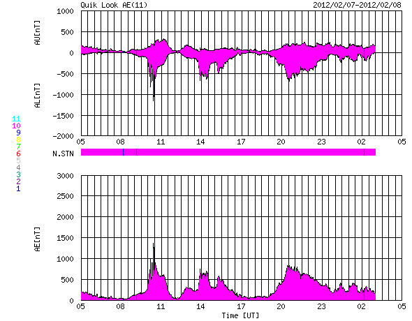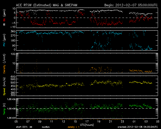 2012/ 2/ 8 13:06 更新 フレアを起こしていた1410黒点群は太陽の西に没しました。太陽風は500km/秒の高速状態です。 担当 篠原 一昨日から活発化した1410黒点群は、 深夜、8日1時(世界時7日16時)と、早朝の8日5時(世界時7日20時)に、 同じC6.8の小規模フレアを2回起こしています。 現在、太陽の西の端に没しつつあります。 1つめのフレアは短い時間変化、 2つめはゆっくりした時間変化のフレアになっています。 CME(太陽ガスの放出現象)も起きていそうなのですが、 SOHO衛星のLASCOの写真では、まだ良く分かりません。 1410黒点群が没すると、太陽は無黒点になりそうだったのですが、 西の端近くに小さな黒点が出現しています。 番号はまだ付いていませんが、どうなるでしょうか。 ちなみに、SIDCのデータによると、 もし黒点数が0になれば、昨年の8月14日以来です。 太陽風は、速度が450km/秒から500km/秒へ上昇し、 高速の太陽風に変わっています。 27日周期の図で、前周期の1月11日に見えていた小さな速度の山が、 今回も残っていたということでしょうか。 今後、速度の高まりはすぐ終わるのか、更に強まるのか注目してください。 SDO衛星AIA193によると、太陽の南半球のコロナホールは、 まだ中心線を通過した程度で、 影響がやって来るには、もう2日くらいかかりそうです。 太陽風の磁場は、強度は5nT前後でだいたい安定しています。 南北成分が、南側に振れる傾向が続いていて、 半日以上-5nTになっています。 この影響で、オーロラの活動も活発に続き、 AE指数のグラフは、800nTくらいの中規模の変化が断続的に発生しています。 GOES-15のX線カメラによる、太陽の西の端で発生したC6.8のフレア。 (c) NOAA/SWPC 、(動画加工 : 宇宙天気ニュース) ![]() SDO衛星のAIA193カメラによる太陽コロナの様子 (c) SDO (NASA) ![]() SDO衛星による太陽の可視光写真。マウスの矢印を写真に重ねると、黒点番号付きの写真に切り替わります。 (c) SDO (NASA) ![]() GOES衛星の太陽X線データ (c) NOAA/SWPC ![]() ACEが観測した太陽風の磁場(1番上の枠、白線は全体の強度、赤線は南北成分) および、太陽風の密度(3番目の橙線)、速度(4番目の黄線) (c) NOAA/SWPC ![]() リアルタイムAE指数 下段のAEグラフの値が高くなると、オーロラ活動が活発化しています。 (c) 京都大学, NICT ![]() 27日の太陽周期に合わせたデータプロット 太陽が同じ面を地球に向けていた27日前の変化から、今後を予想することができます。 (c) 作図:宇宙天気ニュース