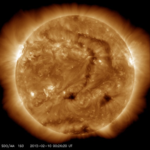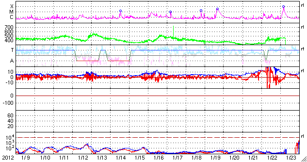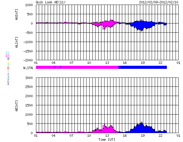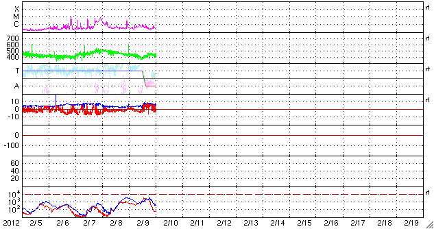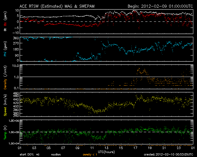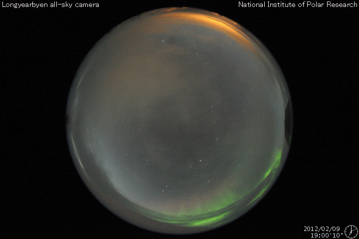 2012/ 2/10 09:53 更新 スバールバル島のオーロラ動画をどうぞ。太陽は小さな活動が続いています。 担当 篠原 ノルウェーのスバールバル島Longyearbyenで美しいオーロラが撮影されています。 全天カメラによる動画をご覧ください。 世界時9日19〜20時のオーロラです。 今日のAE指数のグラフには2つの中規模の変化が記録されています。 このうちの、後の変化を見ていることになります。 背景の澄んだ星空や、月に照らされた雲も印象的な写真です。 写真の中央左寄りには北斗七星が見えています。 ひしゃくの2つの星を伸ばすと、北極星は写真中央の少し左上に見えています。 昨日440km/秒に下がってきた太陽風の速度は、 一旦400km/秒近くまで下がったものの、 その後また上がって、現在も440km/秒になっています。 しかし、27日周期の図のセクターを見ると、 ここで「T」から「A」に切り替わっている様で、 太陽風としては違う領域に入った様です。 これは、前周期にも1月12〜14日頃に見られた変化です。 そして、コロナホールの影響は、既にやって来たのか、 まだこれからなのか、しばらく様子を見て下さい。 太陽は、南東(左下)寄りに新しくできた1416黒点群が少し大きくなっています。 また、北東(左上)の端からは、新しい黒点が顔を出しています。 X線のグラフは、Bクラスの後半からC1にかけて、 小さな活動が頻繁に見られています。 GOES衛星X線カメラを見ると、1416群もこの小さな活動を度々起こしています。 北東端の新しい活動領域も含めて、今後の活動に注目してください。 ノルウェーのスバールバル島Longyearbyenで全天カメラによって撮影されたオーロラ。 (c) 国立極地研究所、(動画加工 : 宇宙天気ニュース) ![]() SDO衛星のAIA193カメラによる太陽コロナの様子 (c) SDO (NASA) ![]() SDO衛星による太陽の可視光写真。マウスの矢印を写真に重ねると、黒点番号付きの写真に切り替わります。 (c) SDO (NASA) ![]() ACEが観測した太陽風の磁場(1番上の枠、白線は全体の強度、赤線は南北成分) および、太陽風の密度(3番目の橙線)、速度(4番目の黄線) (c) NOAA/SWPC ![]() リアルタイムAE指数 下段のAEグラフの値が高くなると、オーロラ活動が活発化しています。 (c) 京都大学, NICT ![]() 27日の太陽周期に合わせたデータプロット 太陽が同じ面を地球に向けていた27日前の変化から、今後を予想することができます。 (c) 作図:宇宙天気ニュース