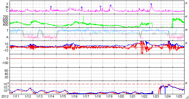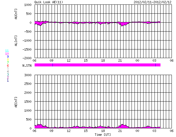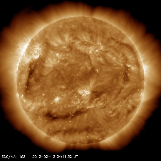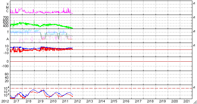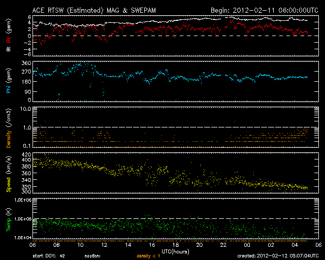 2012/ 2/12 14:08 更新 太陽の東端でCクラスのフレアが活発に発生しています。太陽風は低速の風になっています。 担当 篠原 太陽の東端、1417黒点群の更に左側で、 大きめのCクラスフレアが発生しています。 11日19時(世界時11日10時)にC7.9、 12日4時(世界時11日19時)にC7.7と、続いてすぐにC5.3です。 この他にも、C1.4、C2.7、C2.7、C2.7などの小規模フレアが発生しています。 SDO衛星の可視光写真では、まだ黒点の姿は見えていない様です。 どんな活動領域が顔を見せるのか、注目してください。 一方、太陽の中央に見えている1416黒点群は、 C1.5の小規模フレアを起こした程度で、特に活発ではありません。 太陽風は、速度がどんどん下がって、 320km/秒の低速風になっています。 27日周期の図で前周期の変化と比べると、 1月14〜15日の速度低下に対応しているのでしょう。 すると、1月16日の様にこの後からコロナホールの影響で 速度が再び高まるかもしれません。 ここまでの変化としては、前周期よりも1日程度遅れている印象なので、 速度の高まりは明日くらいになるかもしれません。 現在の磁気圏は概ね静穏で、 AE指数のグラフは小さな変化が見られる程度です。 太陽風の速度低下という要素もありますが、 磁場の南北成分が北寄りに振れるようになってしまったことが 影響しているのでしょう。 昨日お知らせしたように、 14〜15日には、CMEによる小規模の乱れが発生する可能性もあります。 太陽風速度の変化はあまりないと思います。 磁場強度がどれだけ強まるか、そして、どれだけ南向きに振れるかです。 SDO衛星のAIA193カメラによる太陽コロナの様子 (c) SDO (NASA) ![]() SDO衛星による太陽の可視光写真。マウスの矢印を写真に重ねると、黒点番号付きの写真に切り替わります。 (c) SDO (NASA) ![]() GOES衛星の太陽X線データ (c) NOAA/SWPC ![]() ACEが観測した太陽風の磁場(1番上の枠、白線は全体の強度、赤線は南北成分) および、太陽風の密度(3番目の橙線)、速度(4番目の黄線) (c) NOAA/SWPC ![]() リアルタイムAE指数 下段のAEグラフの値が高くなると、オーロラ活動が活発化しています。 (c) 京都大学, NICT ![]() 27日の太陽周期に合わせたデータプロット 太陽が同じ面を地球に向けていた27日前の変化から、今後を予想することができます。 (c) 作図:宇宙天気ニュース