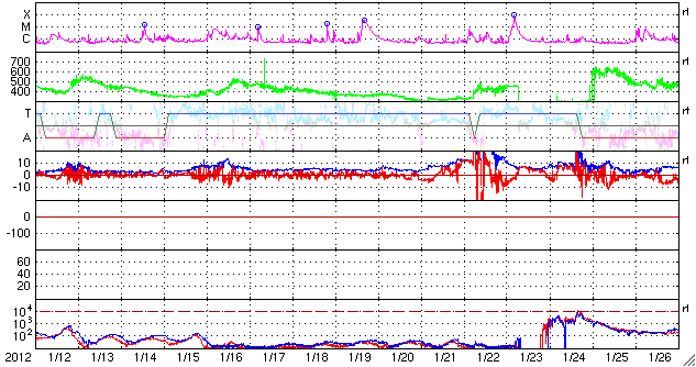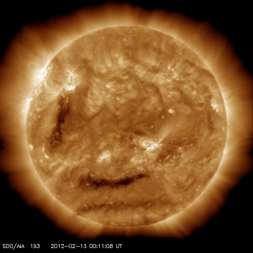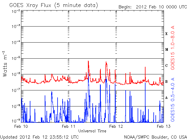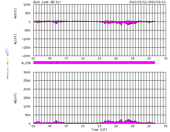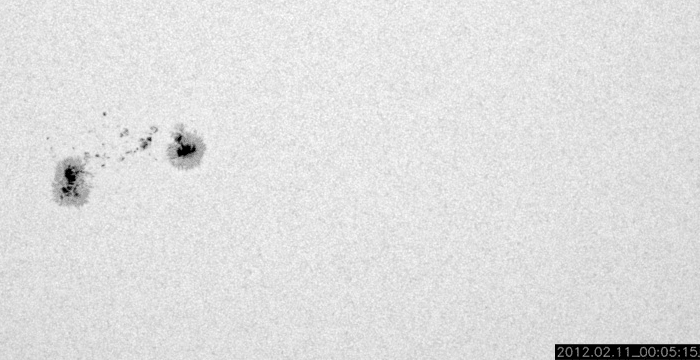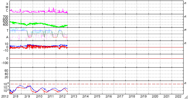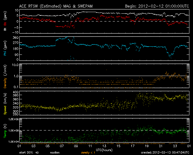 2012/ 2/13 09:47 更新 太陽風はやや低速です。これからコロナホールの影響が始まる可能性があります。 担当 篠原 太陽の東端から、1419、1420と2つの黒点群が顔を出しました。 黒点の規模は、特に大きくはない様です。 高緯度側の1419黒点群は、昨日の昼から深夜にかけて、 C1.3、C1.6、C3.9などの小規模フレアを起こしています。 X線グラフの変化は、一昨日の活動に比べるとやや弱まっているようですが、 引き続き注目してください。 中央付近の1416黒点群の形の変化が目立っていたので、 11〜12日の2日間の様子を動画で紹介します。 小さな黒点が大きな黒点に吸い込まれるような動きをしています。 太陽風は、少し速度が上がって、370km/秒とやや低速の状態です。 磁場強度は5〜7nTとやや強まっています。 27日周期の図を参考にすると、 これからコロナホールの影響が始まるところでしょうか。 前周期は500km/秒まで上昇しましたが、 今回も同じくらいに上がるかもしれません。 そして、14〜15日には、 CMEに関係した太陽風の変化がやって来る可能性があります。 磁気圏のオーロラ活動は穏やかで、AE指数は小さな変化が見られる程度です。 今後、コロナホールやCMEによる太陽風の変化がやって来ると、 ある程度活発なオーロラも期待できるでしょう。 SDO衛星の可視光写真による、1416黒点群の2日間の変化。 (c) SDO (NASA)、 (動画加工 : 宇宙天気ニュース) ![]() SDO衛星のAIA193カメラによる太陽コロナの様子 (c) SDO (NASA) ![]() SDO衛星による太陽の可視光写真。マウスの矢印を写真に重ねると、黒点番号付きの写真に切り替わります。 (c) SDO (NASA) ![]() GOES衛星の太陽X線データ (c) NOAA/SWPC ![]() ACEが観測した太陽風の磁場(1番上の枠、白線は全体の強度、赤線は南北成分) および、太陽風の密度(3番目の橙線)、速度(4番目の黄線) (c) NOAA/SWPC ![]() リアルタイムAE指数 下段のAEグラフの値が高くなると、オーロラ活動が活発化しています。 (c) 京都大学, NICT ![]() 27日の太陽周期に合わせたデータプロット 太陽が同じ面を地球に向けていた27日前の変化から、今後を予想することができます。 (c) 作図:宇宙天気ニュース
