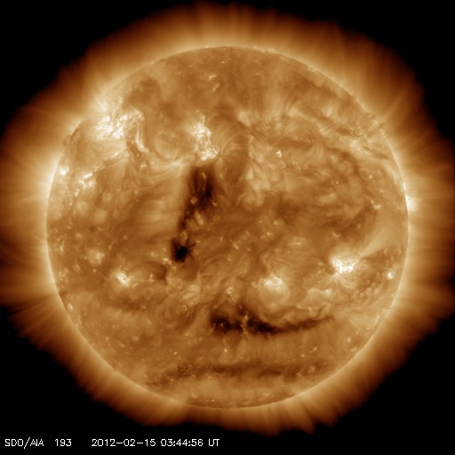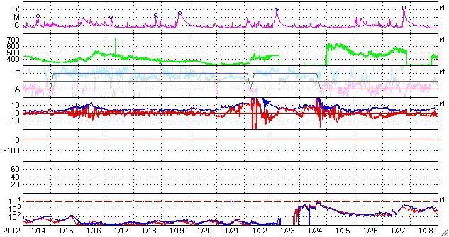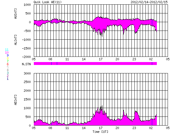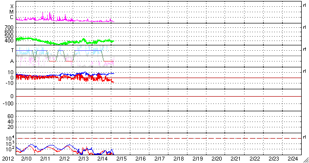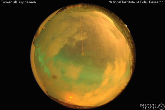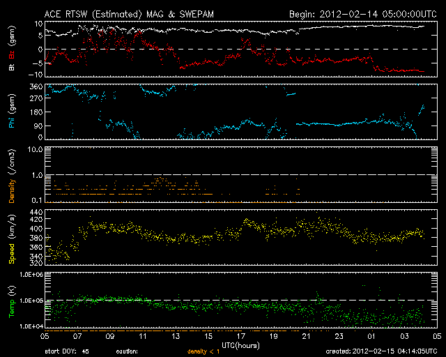2012/ 2/15 13:14 更新 太陽風磁場の南向きが強まって、活発なオーロラが発生しています。 担当 篠原 太陽風磁場の強まった状態が続いています。 昨日以降も磁場強度は8nT前後で安定しています。 磁場の南北成分も南寄りの傾向が続いていて、 昨夜以降は-5nTの南向きが半日以上続いています。 特に今朝15日10時(世界時15日1時)以降は、 現在にかけて、-8nTと更に強い南向きになっています。 これだけまとまった南向きが続いているのは、 11日に発生したCMEの影響がやって来たためかもしれません。 太陽風の速度は、400km/秒と平均的なレベルです。 太陽風磁場南向きの影響で、磁気圏のオーロラ活動が活発になっています。 AE指数のグラフは、800〜1000nTに及ぶ変化が半日続いています。 現在(世界時15日3時前後)のノルウェー・トロムソのオーロラの様子を動画で掲載します。 AE指数のグラフで最後に変化が強まっているあたりのオーロラです。 太陽風磁場の強まりは、今日、明日くらいまででしょう。 その後、太陽風は一旦静かになって、 以降は、SDO衛星AIA193に見えているコロナホールの影響がどの程度やって来るかです。 太陽の活動は静かで、目立ったフレア活動は発生していません。 黒点にも特に変化は見られません。 ノルウェー・トロムソの全天カメラにより撮影された、活発なオーロラの活動。 (c) 国立極地研究所、(動画加工 : 宇宙天気ニュース) ![]() SDO衛星のAIA193カメラによる太陽コロナの様子 (c) SDO (NASA) ![]() SDO衛星による太陽の可視光写真。マウスの矢印を写真に重ねると、黒点番号付きの写真に切り替わります。 (c) SDO (NASA) ![]() ACEが観測した太陽風の磁場(1番上の枠、白線は全体の強度、赤線は南北成分) および、太陽風の密度(3番目の橙線)、速度(4番目の黄線) (c) NOAA/SWPC ![]() リアルタイムAE指数 下段のAEグラフの値が高くなると、オーロラ活動が活発化しています。 (c) 京都大学, NICT ![]() 27日の太陽周期に合わせたデータプロット 太陽が同じ面を地球に向けていた27日前の変化から、今後を予想することができます。 (c) 作図:宇宙天気ニュース