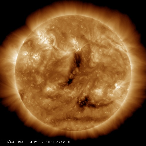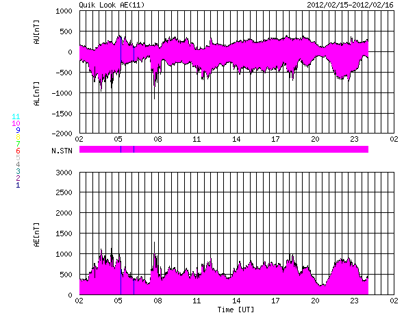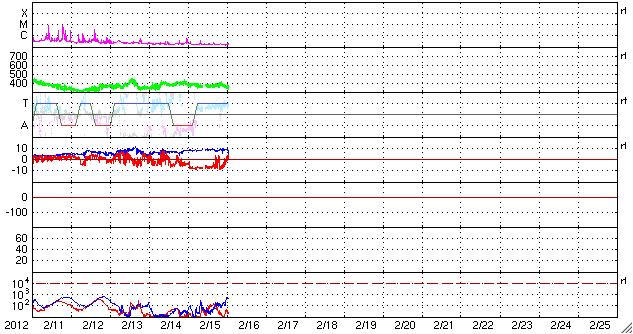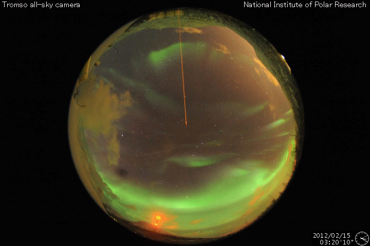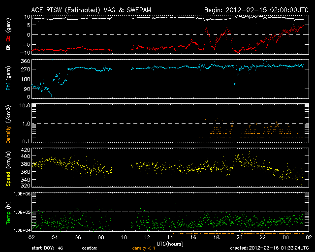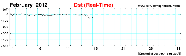 2012/ 2/16 10:32 更新 太陽風磁場の南向きが長時間続き、活発なオーロラ活動が1日にわたって発生しました。 担当 篠原 昨日の朝に、太陽風の磁場の南向きは -5nTから -8nTへ強まりましたが、 その状態は今朝までほぼ1日にわたって続き、 この間、磁気圏の活動が強められて、活発なオーロラ活動が長時間発生しました。 ノルウェー・トロムソで撮影された、オーロラの様子を紹介します。 昨日の動画にそのまま続く時間帯に見られた、にぎやかなオーロラです。 AE指数のグラフは、ずっと600〜1000nTの中規模の変動が続いています。 昨日は、世界中をぐるっと一周する様に、 天候さえ良ければ極域ではどこでもオーロラが楽しめたでしょう。 また、今回の磁気圏活動の強まりによって、Dst指数は-60nTまで低下していて、 弱い磁気嵐が発生しています。 この間、太陽風は380km/秒と平均よりもやや遅めの風でした。 速度が遅かった分、CMEによる乱れの通過に時間がかかり、 長時間強い南向き磁場が続いたとも言えそうです。 現在の太陽風磁場の南北成分は、南から北向きに変わって+3nTほどです。 オーロラの活動は、ここまでで一段落でしょう。 太陽風の速度は350km/秒に少し下がって、より低速風になっています。 そして、今後はSDO衛星AIA193の南半球に見える小さめのコロナホールの 弱い影響がやって来るかもしれません。 放射線帯の高エネルギー電子は、現在は低いままで、特に増加は見られません。 もうしばらく変化に注目してください。 太陽のフレア活動は静かです。 黒点にも変化は見られません。 ノルウェー・トロムソの全天カメラにより撮影された、活発なオーロラの活動。 (c) 国立極地研究所、(動画加工 : 宇宙天気ニュース) ![]() Dst指数(速報値)は、-60nT程度まで下がりました。Dst指数の変化は、マイナス方向に強まります。 (c) 京都大学WDC ![]() SDO衛星のAIA193カメラによる太陽コロナの様子 (c) SDO (NASA) ![]() SDO衛星による太陽の可視光写真。マウスの矢印を写真に重ねると、黒点番号付きの写真に切り替わります。 (c) SDO (NASA) ![]() ACEが観測した太陽風の磁場(1番上の枠、白線は全体の強度、赤線は南北成分) および、太陽風の密度(3番目の橙線)、速度(4番目の黄線) (c) NOAA/SWPC ![]() リアルタイムAE指数 下段のAEグラフの値が高くなると、オーロラ活動が活発化しています。 (c) 京都大学, NICT ![]() 27日の太陽周期に合わせたデータプロット 太陽が同じ面を地球に向けていた27日前の変化から、今後を予想することができます。 (c) 作図:宇宙天気ニュース