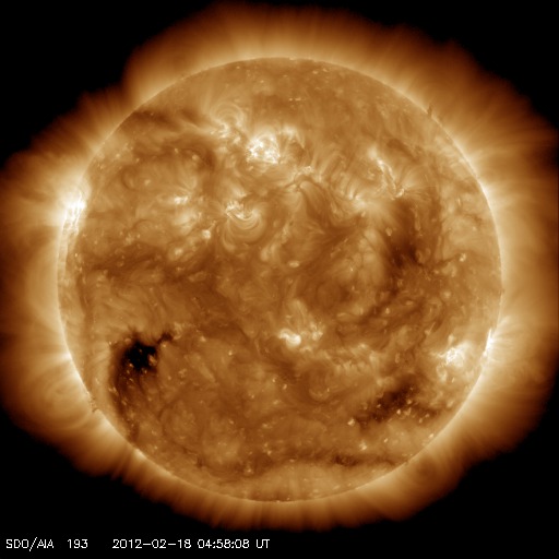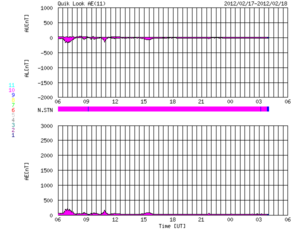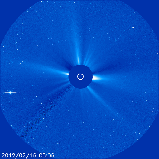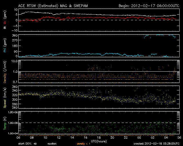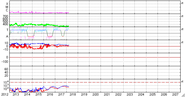 2012/ 2/18 14:28 更新 太陽風の速度はとても遅くなり、磁気圏も静かです。 担当 篠原 今日の宇宙天気は、とても静かです。 太陽風の速度は、更に下がって300km/秒を割りつつあります。 かなり遅い太陽風になっています。 磁場強度は、5nTを前後する程度で、平均的な状態です。 27日周期の図を見ると、前周期の1月21日も同様にかなり遅い状態で、 その分布がそのまま回帰した様な変化です。 コロナホールが発生していましたが、ここまでは特に影響は及んでいません。 27日周期の図によると、 前周期は1月22日から速度や、特に磁場が大きく乱れています。 これはCMEによる突発性の変化で、回帰することはありません。 これからしばらくは参考にできないので注意してください。 その今後ですが、SDO衛星AIA193で太陽の中心に見えていたコロナホールが、 だいぶ西半球に移動しています。 今後は、こちらからの影響がやって来る可能性があります。 規模は小さかったですが、赤道付近にあったため、 噴き出した太陽風が地球へ向かってくる可能性は高くなります。 小規模の太陽風の乱れくらいはやって来るのではないでしょうか。 太陽は、1418黒点群が復活しています。 しかし、他の群も含めて、黒点はどれも小さく、活動も静かです。 X線グラフはほとんど変化していません。 その一方、一昨日、16日夕方の現象ですが、 太陽の裏側でフレアが発生し、CME(太陽ガスの放出現象)が起きています。 SOHO衛星のLASCO C3では、太陽全体を包むように白いガスが広がって行く、 フルハロー型のCMEとして見えています(1枚目の動画をどうぞ)。 ただし、この写真だけでは、地球側に噴き出したのか、 反対側に噴き出したのか分かりません。 そこで、STEREO Behind衛星のデータを見ると、 EUVI 195では、地球とは反対側にあたる太陽の左端でフレアが発生し、 COR2では、その後CMEが噴き出して行く様子を見ることができます。 地球側はおとなしく見えている太陽も、 裏でこんな活動を起こしたりしている訳です。 SOHO衛星LASCO C3による、太陽の裏側で発生したCME。太陽全体を包むように広がるフルハロー型に見えています。 (c) SOHO (ESA & NASA)、 (動画加工 : 宇宙天気ニュース) ![]() STEREO Behindから見たCME。地球とは反対の左側に噴き出しています。 (c) STEREO (NASA)、 (動画加工 : 宇宙天気ニュース) ![]() SDO衛星のAIA193カメラによる太陽コロナの様子 (c) SDO (NASA) ![]() SDO衛星による太陽の可視光写真。マウスの矢印を写真に重ねると、黒点番号付きの写真に切り替わります。 (c) SDO (NASA) ![]() ACEが観測した太陽風の磁場(1番上の枠、白線は全体の強度、赤線は南北成分) および、太陽風の密度(3番目の橙線)、速度(4番目の黄線) (c) NOAA/SWPC ![]() リアルタイムAE指数 下段のAEグラフの値が高くなると、オーロラ活動が活発化しています。 (c) 京都大学, NICT ![]() 27日の太陽周期に合わせたデータプロット 太陽が同じ面を地球に向けていた27日前の変化から、今後を予想することができます。 (c) 作図:宇宙天気ニュース