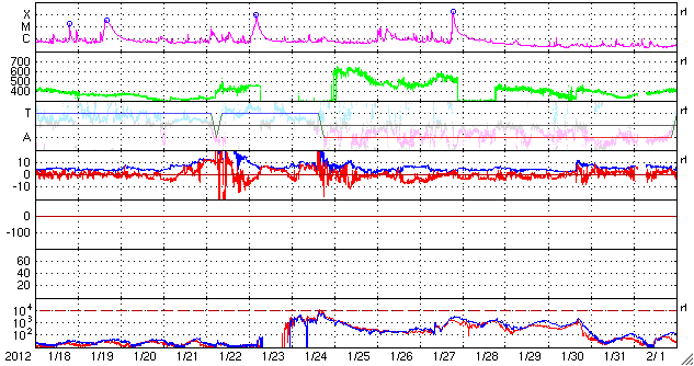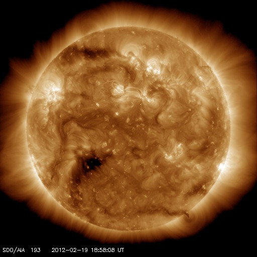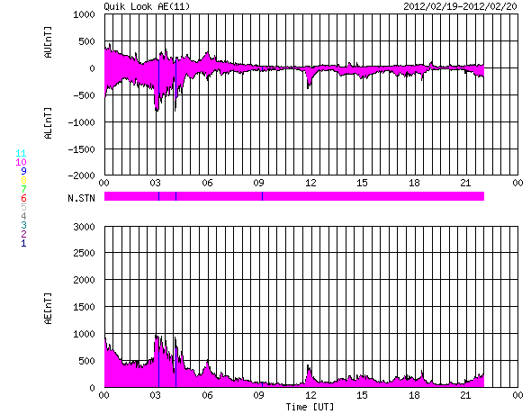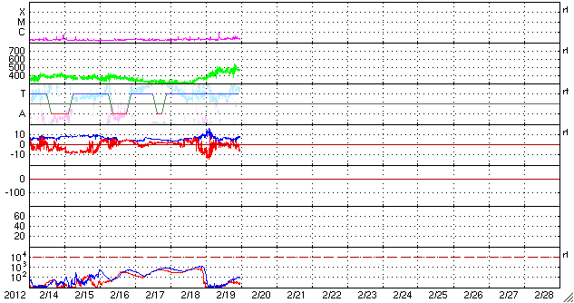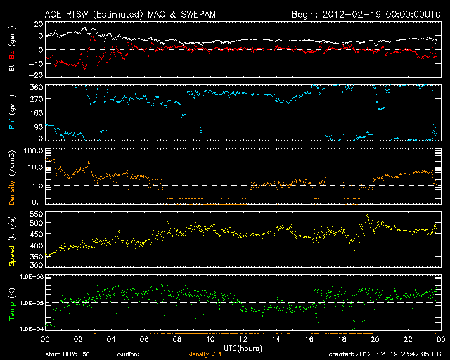 2012/ 2/20 08:47 更新 太陽風がやや高速になっています。磁場の南向きの強まりが終わり、オーロラの活動は弱まっています。 担当 篠原 コロナホールによる太陽風の変動は、 磁場強度の強まりから、速度の高まりへと変化しています。 昨日10nTに強まっていた磁場強度は、 19日13時(世界時19日4時)頃からゆっくりと下がり始め、 19日16時(世界時19日7時)には、5nTと平均的な強度に下がりました。 一方、速度はゆっくり上がり続けて、 磁場が弱まるのと反対に、470km/秒とやや高速の風に変わりました。 その後も現在まで450〜500km/秒の範囲で安定した速度が続いています。 昨日活発なオーロラをもたらした、磁場の強い南向きは、 磁場強度が下がるとともに弱くなり、 やがて0nT付近で停滞するようになりました。 このため、磁気圏の活動は弱まり、 AE指数500〜1000nTの活発な磁気圏活動は、 19日15時(世界時19日6時)頃で終わり、 その後は、小さな変動が発生している程度です。 現在の太陽風速度の高まりは、 2月16日頃に太陽の中心付近に見えていたコロナホールの影響と考えられます。 コロナホールの規模を考えると、太陽風の乱れはあまり長く続きそうにありません。 今日いっぱいくらいで速度も弱まって行くのではないかと思います。 その後は、穏やかな太陽風に戻り、 次は、SDO衛星AIA193の南東(左下)のコロナホールの影響が予想されます。 太陽は、中央部に現れた1422黒点群が発達しています。 (昨日のニュースの黒点写真で、こちらの黒点群を1421黒点群と紹介してしまいました。 しかし、1421群は東端の小さな黒点で、こちらはその後に現れた黒点群でした。 訂正致します。申し訳ありません。) C1.0の小規模フレアを起こしていますが、 GOES衛星の動画を見ると、それほど活動度が高いようでもありません。 引き続き注目が必要ですが、現時点ではX線のグラフも穏やかです。 SDO衛星の可視光写真による、1422黒点群の変化。 (c) SDO (NASA)、 (動画加工 : 宇宙天気ニュース) ![]() SDO衛星のAIA193カメラによる太陽コロナの様子 (c) SDO (NASA) ![]() SDO衛星による太陽の可視光写真。マウスの矢印を写真に重ねると、黒点番号付きの写真に切り替わります。 (c) SDO (NASA) ![]() ACEが観測した太陽風の磁場(1番上の枠、白線は全体の強度、赤線は南北成分) および、太陽風の密度(3番目の橙線)、速度(4番目の黄線) (c) NOAA/SWPC ![]() リアルタイムAE指数 下段のAEグラフの値が高くなると、オーロラ活動が活発化しています。 (c) 京都大学, NICT ![]() 27日の太陽周期に合わせたデータプロット 太陽が同じ面を地球に向けていた27日前の変化から、今後を予想することができます。 (c) 作図:宇宙天気ニュース