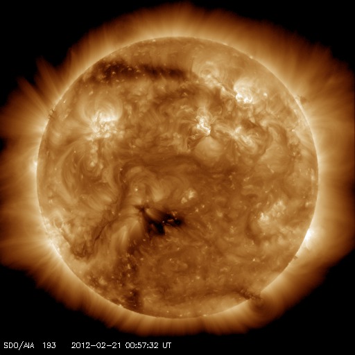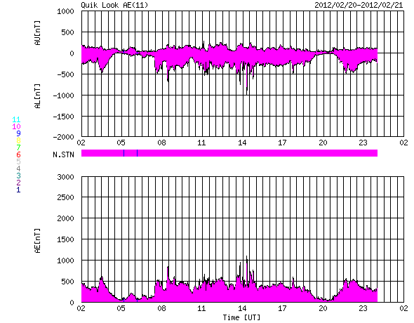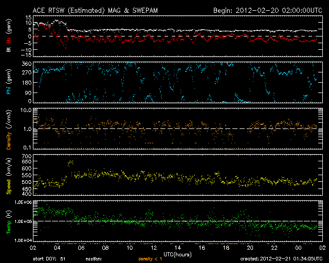 2012/ 2/21 10:34 更新 500km/秒の高速太陽風が続いています。南向き磁場の影響で、オーロラも活発に続いています。 担当 篠原 太陽風は、500km/秒の高速状態が続き、 磁場が -2〜 -3nTの南向きになっている影響で、 活発なオーロラ活動が続いています。 ACE衛星の観測によると、20日14時(世界時20日5時)に、 太陽風の速度は470km/秒から550km/秒に上昇し、 以降、多少下がりながらも500km/秒近い高速状態が続いています。 速度の上昇とともに、10nTに強まっていた磁場強度は4nTへ下がりますが、 磁場の南北成分は南寄りの状態が継続し、 その影響で、AE指数は500nT前後の中規模の変動が1日にわたって発生しています。 その中で、世界時20日18時台のオーロラの様子を、 ノルウェー、スバールバル島の全天カメラの観測から紹介します。 現地は曇りがちで、前半は雲越しにオーロラの光を見ています。 後半晴れてきて、オーロラもはっきりと見えるようになりました。 太陽風は、思ったよりも立派な高速風になりました。 現在は低下傾向にある様ですが、もうしばらくはある程度高速の風が続きそうです。 今夜もアラスカのライブカメラなどで楽しめそうです。 今回の太陽風の乱れの影響で、放射線帯の高エネルギー電子が増え始めています。 今日は3000くらいまでですが、明日、更に高まっている可能性もあります。 太陽では、昨日、20日13時半(世界時20日4時半)に、 1421黒点群でC4.1の小規模フレアが発生しています。 しかし、1421黒点群は、今日の写真ではほとんど見えなくなっています。 また、大きくなっている1422黒点群でもC1前後の小さなフレアが3回程度発生しています。 今後、フレアの規模が大きくなったりするのでしょうか。 ノルウェーのスバールバル島Longyearbyenで全天カメラによって撮影されたオーロラ。 (c) 国立極地研究所、(動画加工 : 宇宙天気ニュース) ![]() SDO衛星のAIA193カメラによる太陽コロナの様子 (c) SDO (NASA) ![]() SDO衛星による太陽の可視光写真。マウスの矢印を写真に重ねると、黒点番号付きの写真に切り替わります。 (c) SDO (NASA) ![]() ACEが観測した太陽風の磁場(1番上の枠、白線は全体の強度、赤線は南北成分) および、太陽風の密度(3番目の橙線)、速度(4番目の黄線) (c) NOAA/SWPC ![]() リアルタイムAE指数 下段のAEグラフの値が高くなると、オーロラ活動が活発化しています。 (c) 京都大学, NICT ![]() 27日の太陽周期に合わせたデータプロット 太陽が同じ面を地球に向けていた27日前の変化から、今後を予想することができます。 (c) 作図:宇宙天気ニュース