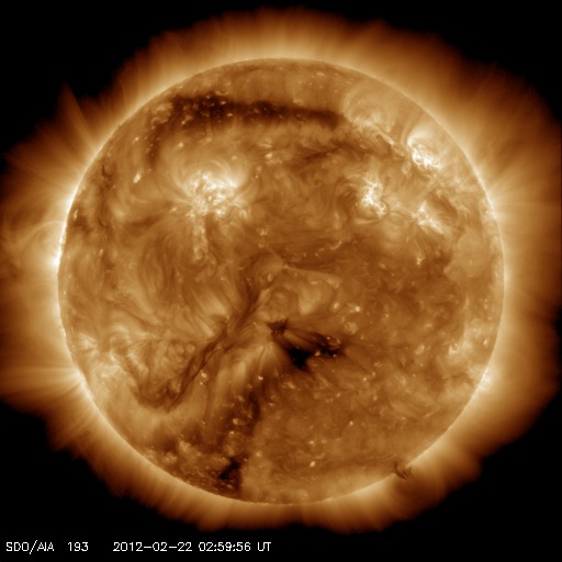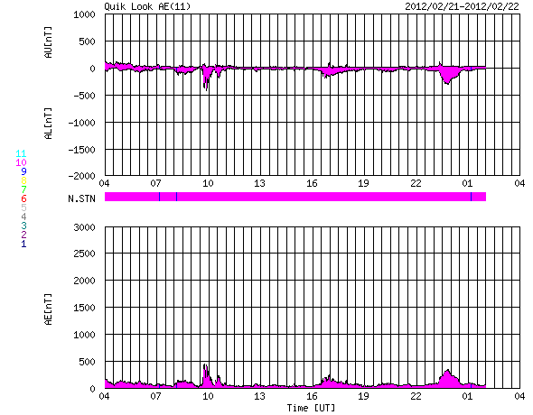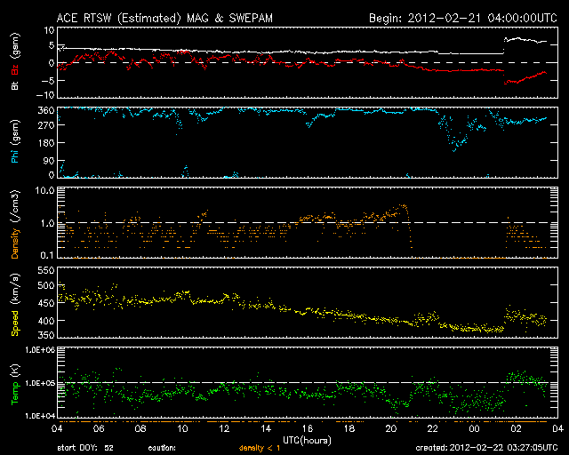 2012/ 2/22 12:28 更新 太陽風の速度は低速風に変わりつつあります。アラスカのオーロラの写真をどうぞ。 担当 篠原 アラスカにお住まいの脇谷 厚思さんより、 現地18日の夜に撮影されたオーロラの写真をいただきました。 フェアバンクスの北東250kmのサークルという村の近くで撮影されたそうです。 カメラはCanon 5D Mark-II、レンズはCanon Fisheye 15mm F2.8とのことです。 空が暗くなる前の19時と、21時に大きなオーロラの活動が見られたとのことで、 記事をたどると、2月19日と20日のニュースに載っている、 -10nTに達した強い南向き磁場に関係して発生したオーロラの活動です。 空全体を覆って、オーロラのカーテンが幾重にも重なる美しい写真です。 雪景色や、背景の星空も一緒にお楽しみ下さい。 空に薄明かりが残っている時のオーロラも素敵ですね。 素晴らしい写真をどうもありがとうございます。 太陽風は、昨夜からゆっくりと速度が下がって、 今朝には370km/秒と低速風に変わりました。 磁場強度も一緒に下がって、2nTほどに弱まっていました。 そして、22日10時半(世界時22日1時半)に、小さな太陽風の乱れが到来して、 速度は420km/秒に、磁場強度は7nTに急に強まっています。 変動の規模としては小さな変化です。 磁気圏のオーロラ活動は、昨日のニュースの後、 太陽風磁場の南北成分が北寄りに変わったため、静かになっていました。 速度の低下も重なって、AE指数のグラフは小さな変化が時々見られた程度です。 その後、今朝くらいから再び南向きに切り替わっています。 現在、弱いオーロラの活動は起きているのではないかと思います。 今後の推移ですが、SDO衛星AIA193の太陽コロナ写真では、 南半球でコロナホールが南北に伸びています。 この影響が明後日、24日くらいに到来する可能性があります。 27日周期の図では、前周期はCMEの影響があって分かりにくいのですが、 1月27日前後の太陽風の高まりがコロナホールに関係していたと思われます。 放射線帯の高エネルギー電子は、昨日よりももう少し上がっていますが、 1万のレベルには達していません。 上昇はこのくらいまでではないかと思います。 太陽は、1422黒点群でC1.0の小さな小規模フレアが発生した程度で、 全体的に穏やかです。 黒点もこの1422群が目立っている程度です。 脇谷 厚思氏によりアラスカで撮影された、現地18日夜のオーロラ。 (c) 脇谷 厚思氏 ![]() 脇谷 厚思氏によりアラスカで撮影された、現地18日夜のオーロラ。 (c) 脇谷 厚思氏 ![]() 脇谷 厚思氏によりアラスカで撮影された、現地18日夜のオーロラ。 (c) 脇谷 厚思氏 ![]() 脇谷 厚思氏によりアラスカで撮影された、現地18日夜のオーロラ。 (c) 脇谷 厚思氏 ![]() SDO衛星のAIA193カメラによる太陽コロナの様子 (c) SDO (NASA) ![]() SDO衛星による太陽の可視光写真。マウスの矢印を写真に重ねると、黒点番号付きの写真に切り替わります。 (c) SDO (NASA) ![]() ACEが観測した太陽風の磁場(1番上の枠、白線は全体の強度、赤線は南北成分) および、太陽風の密度(3番目の橙線)、速度(4番目の黄線) (c) NOAA/SWPC ![]() リアルタイムAE指数 下段のAEグラフの値が高くなると、オーロラ活動が活発化しています。 (c) 京都大学, NICT ![]() 27日の太陽周期に合わせたデータプロット 太陽が同じ面を地球に向けていた27日前の変化から、今後を予想することができます。 (c) 作図:宇宙天気ニュース