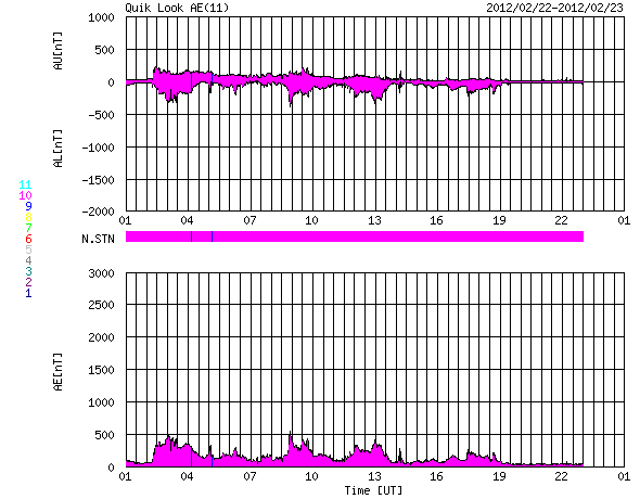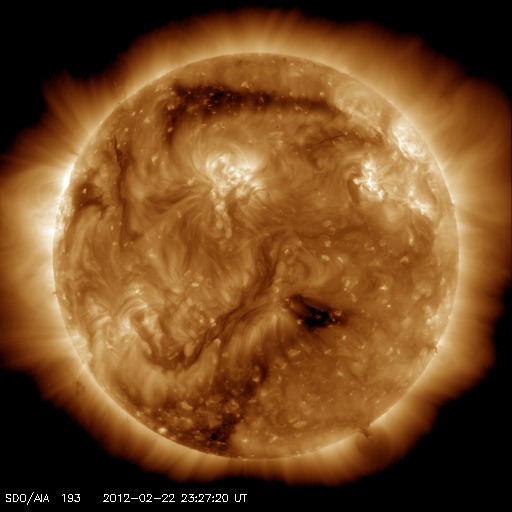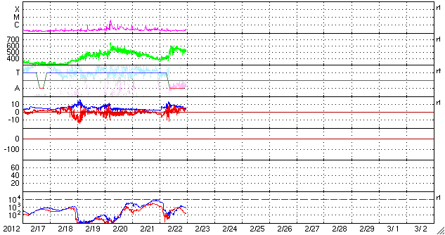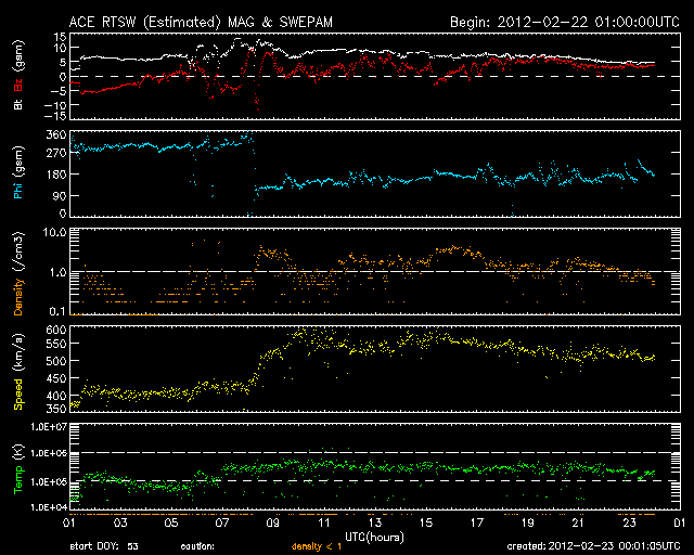 2012/ 2/23 09:01 更新 太陽風の速度は500km/秒台に上昇し、コロナホールによる高速風が始まった様子です。 担当 篠原 昨日の午後、22日15時(世界時22日6時)頃から、 太陽風の磁場がやや乱れて、10nTを超えるくらいに強度が高まり、 その後、速度の上昇が始まって、420km/秒から550km/秒の高速風に変わりました。 予想よりも早くコロナホールの影響が始まった様です。 磁場強度は強まりましたが、南北成分は0nTから北寄りに振れています。 このため、磁気圏への影響は限定的で、 AE指数は200〜500nTの小規模の変化が発生している程度です。 22日19時(世界時22日10時)頃に太陽風の速度が上がりきると、 以後は、磁場強度は下がり始め、 現在は5nTと平均的な強さに戻っています。 また、速度も520km/秒へ多少下がり気味で、速度の変化も止まっています。 一方、SDO衛星AIA193を見ると、南半球のコロナホールは、 まだ西半球に回ったばかりで、本格的な影響はまだこれからだと思われます。 この後、第二段の磁場、速度の変化がやって来る可能性もあります。 太陽は、X線強度の変化はなく、静かです。 中央部に小さく1421黒点群が復活しています。 SDO衛星のAIA193カメラによる太陽コロナの様子 (c) SDO (NASA) ![]() SDO衛星による太陽の可視光写真。マウスの矢印を写真に重ねると、黒点番号付きの写真に切り替わります。 (c) SDO (NASA) ![]() ACEが観測した太陽風の磁場(1番上の枠、白線は全体の強度、赤線は南北成分) および、太陽風の密度(3番目の橙線)、速度(4番目の黄線) (c) NOAA/SWPC ![]() リアルタイムAE指数 下段のAEグラフの値が高くなると、オーロラ活動が活発化しています。 (c) 京都大学, NICT ![]() 27日の太陽周期に合わせたデータプロット 太陽が同じ面を地球に向けていた27日前の変化から、今後を予想することができます。 (c) 作図:宇宙天気ニュース