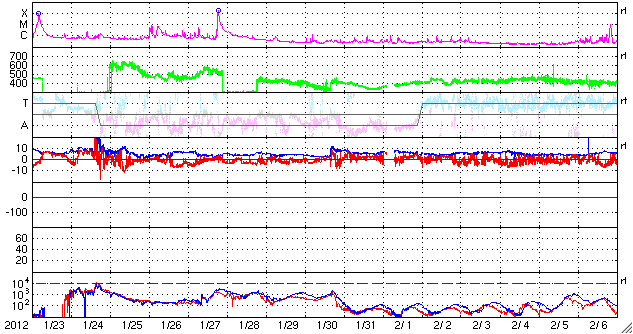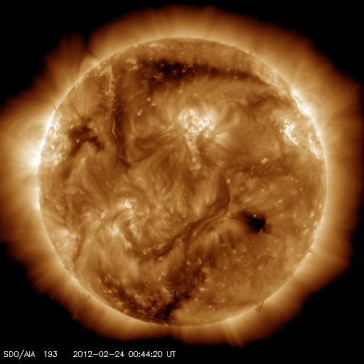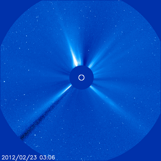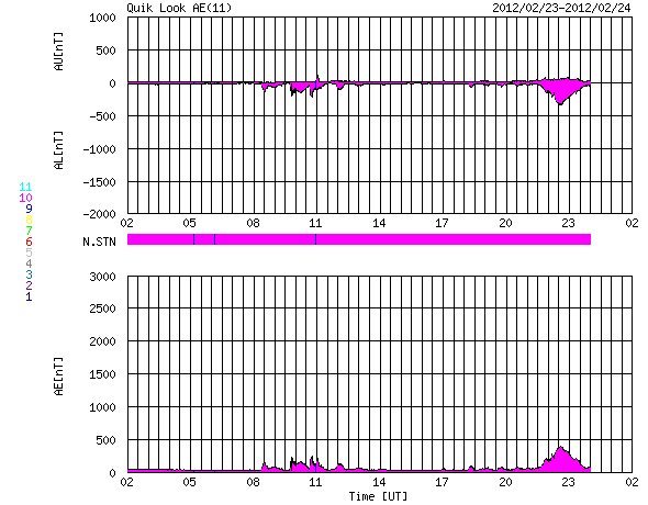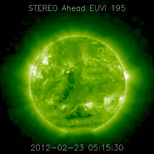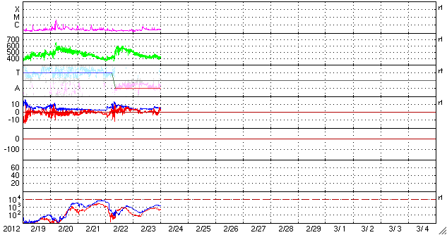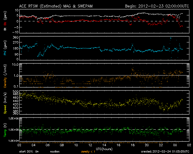 2012/ 2/24 10:06 更新 太陽風の速度は420km秒に下がって落ち着いています。太陽も穏やかです。 担当 篠原 太陽の西端の向こう側でフレアが発生しています。 地球への影響はありませんが、CMEの噴出がきれいでしたので、 SOHOによる動画と、STEREO Aheadによるフレアの様子を掲載します。 地球から見ると、北西(右上)に向かって、コロナのガスが噴き上がっています。 その前にも北東に向かって小さなCMEが起きています。 太陽の活動は穏やかで、X線のグラフはほとんど変化していません。 東の端から1423黒点群が上がってきましたが、 特に活動を起こしている様子はありません。 太陽風は、ゆっくりと速度が下がって、 昨夜のうちに420km/秒と平均的な状態に戻りました。 磁場強度は、5nT前後と平均的な状態で安定しています。 磁気圏も静穏で、AE指数はほとんど変化していません。 太陽風は落ち着いてしまいましたが、 コロナホールの影響は、ここまでなのでしょうか。 SOHO衛星LASCO C3による、太陽の西側で発生したCME。 (c) SOHO (ESA & NASA)、 (動画加工 : 宇宙天気ニュース) ![]() STEREO Ahead EUVI195による、太陽の西側で発生したフレアの様子。 (c) STEREO (NASA)、 (動画加工 : 宇宙天気ニュース) ![]() SDO衛星のAIA193カメラによる太陽コロナの様子 (c) SDO (NASA) ![]() SDO衛星による太陽の可視光写真。マウスの矢印を写真に重ねると、黒点番号付きの写真に切り替わります。 (c) SDO (NASA) ![]() GOES衛星の太陽X線データ (c) NOAA/SWPC ![]() ACEが観測した太陽風の磁場(1番上の枠、白線は全体の強度、赤線は南北成分) および、太陽風の密度(3番目の橙線)、速度(4番目の黄線) (c) NOAA/SWPC ![]() リアルタイムAE指数 下段のAEグラフの値が高くなると、オーロラ活動が活発化しています。 (c) 京都大学, NICT ![]() 27日の太陽周期に合わせたデータプロット 太陽が同じ面を地球に向けていた27日前の変化から、今後を予想することができます。 (c) 作図:宇宙天気ニュース