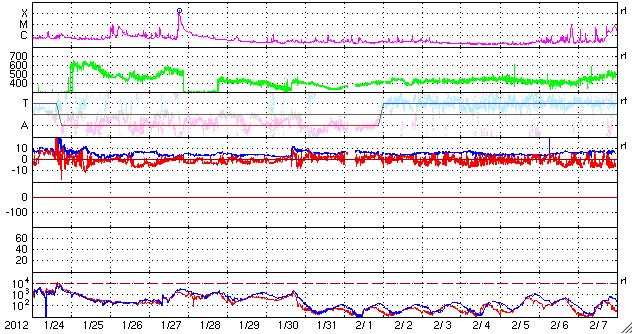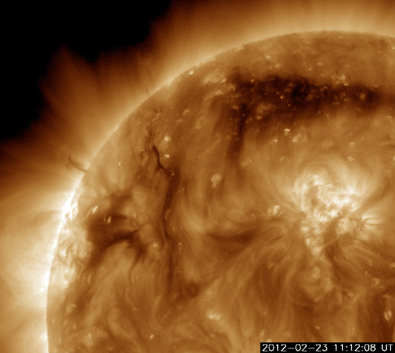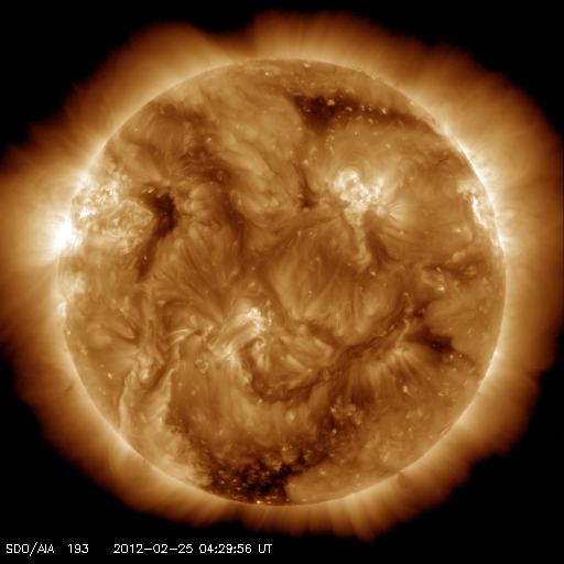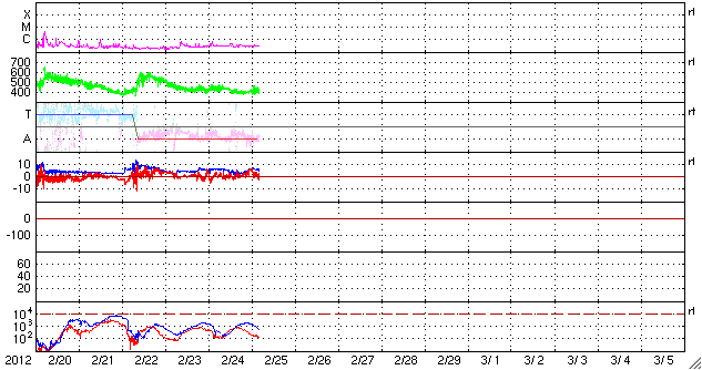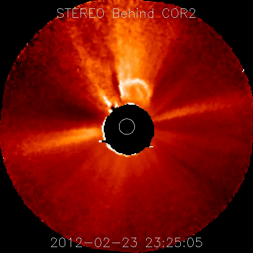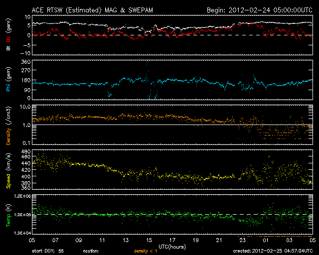 2012/ 2/25 13:58 更新 太陽でフィラメントの噴出が発生し、地球へも影響が及びそうです。現在の太陽風は穏やかです。 担当 篠原 昨日、24日9時(世界時24日0時)頃、 太陽の北東部で大きな規模のフィラメント噴出が発生しました。 SDO衛星AIA193と304による動画を掲載します。 噴出が発生する直前のダークフィラメントの激しい動きが印象的です。 噴き上がったところで画像がなくなっていて、 最後に不満の残る動画になっています。 噴出後のCMEの様子を、SOHO衛星LASCO C3でご覧ください。 太陽の北に向かって大きなガスのかたまりが噴き上がっています。 更に、STEREO BehindでこのCMEを横から見ると、 2波に分かれていて、2つめは地球のある右方向にもガスが噴き出しています。 地球まで3〜4日かかると予想すると、到来は27日から28日頃になりそうです。 フィラメント噴出による太陽風の乱れなので、 速度はあまり大きく上がらないと思いますが、 強い磁場が運ばれてきて、南に大きく振れた場合、 活発な磁気圏活動をもたらします。 来週の前半は注目です。 太陽では、この他に目立った活動はありません。 東端から、昨日の1423黒点群に続いて、1424黒点群が顔を出しています。 太陽風は、速度が400km/秒に下がった程度で、 平均的な速度を保っています。 磁場強度は5nT前後で安定しています。 コロナホールの影響は22日以降は特に見られなかった様です。 磁気圏も静かで、AE指数は小さな変化が見られる程度です。 CMEによる乱れが到来するまで、 太陽風、磁気圏ともに静かに推移するでしょう。 SDO衛星のAIA193, 304カメラによる、太陽の北東部で発生したフィラメントの噴出。 (c) SDO (NASA)、 (動画加工 : 宇宙天気ニュース) ![]() SOHO LASCO C3カメラによる、太陽の北へ噴出したCME。 (c) SOHO (ESA & NASA)、 (動画加工 : 宇宙天気ニュース) ![]() STEREO Behindから見たCME。地球のある右側に噴き出しています。 (c) STEREO (NASA)、 (動画加工 : 宇宙天気ニュース) ![]() SDO衛星のAIA193カメラによる太陽コロナの様子 (c) SDO (NASA) ![]() SDO衛星による太陽の可視光写真。マウスの矢印を写真に重ねると、黒点番号付きの写真に切り替わります。 (c) SDO (NASA) ![]() GOES衛星の太陽X線データ (c) NOAA/SWPC ![]() ACEが観測した太陽風の磁場(1番上の枠、白線は全体の強度、赤線は南北成分) および、太陽風の密度(3番目の橙線)、速度(4番目の黄線) (c) NOAA/SWPC ![]() リアルタイムAE指数 下段のAEグラフの値が高くなると、オーロラ活動が活発化しています。 (c) 京都大学, NICT ![]() 27日の太陽周期に合わせたデータプロット 太陽が同じ面を地球に向けていた27日前の変化から、今後を予想することができます。 (c) 作図:宇宙天気ニュース