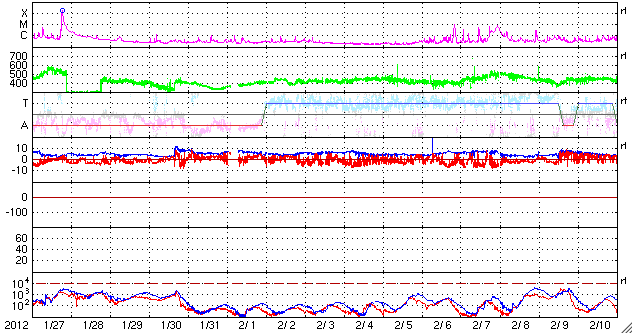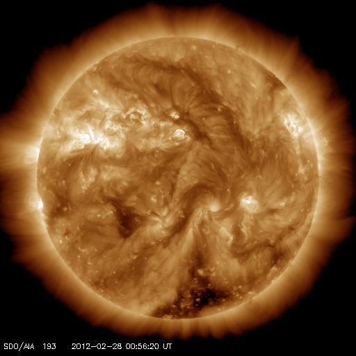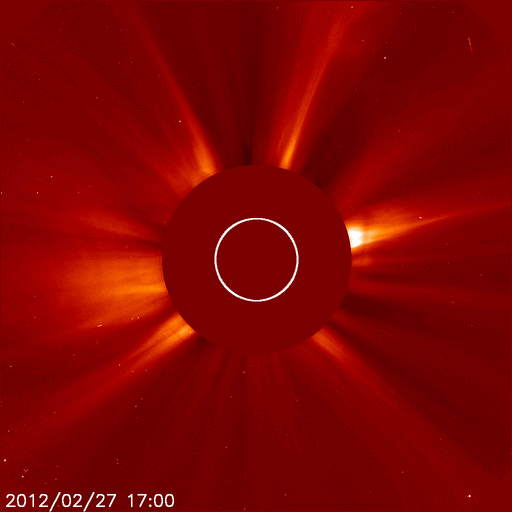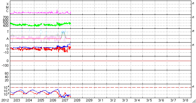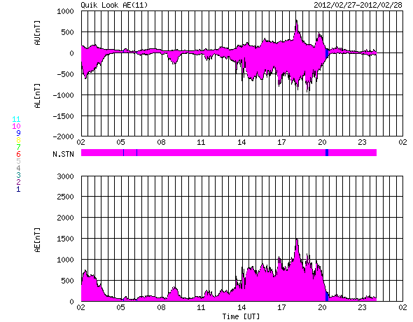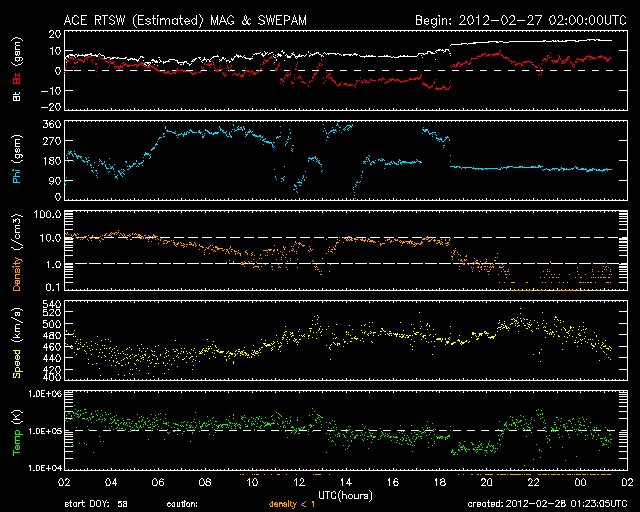 2012/ 2/28 10:23 更新 太陽風磁場が南向きに強まって、磁気圏活動が強まりました。現在は北向きに変わって、落ち着いています。 担当 篠原 昨日の朝に始まった太陽風の乱れは、 その後も、磁場強度は10nT近くに強まった状態が続き、 速度も450〜500km/秒とやや高速の状態が続いています。 その中で、27日20時から28日3時半(世界時27日11時から18時半)にかけて、 太陽風磁場の南北成分が -5nT〜 -10nTと南向きに強まった状態が続きました。 この影響で、磁気圏の活動が活発化し、 AE指数のグラフは1000nTや1500nTに達する大きな変動を記録しています。 また、Dst指数も -50nTくらいまで下がっていて、弱い磁気嵐になっている様です。 極域ではにぎやかなオーロラが見られたのではないかと思いますが、 トロムソの全天カメラは曇っていて、オーロラは分かりませんでした。 28日3時半(世界時27日18時半)以降は、磁場は北向きに切り替わり、 以降、オーロラの活動は弱まっています。 しかし、磁場強度は15nTに強まっていて、 再び南向きに切り替わる可能性もあり、引き続き注目してください。 太陽は、Bクラスの小さなフレアが2〜3回ほど起きています。 中央付近の1426黒点群が少し活動的になっているようです。 今後Cクラスに達するフレアを起こすかもしれません。 太陽の西端(右端)の向こう側でフレアが発生し、 それに伴ってCMEの噴出が起きています。 SOHO衛星のLASCO C2、C3カメラによる動画を掲載します。 なかなか見事な噴出です。 地球からは横方向ですので、影響はありません。 SOHO衛星LASCO C2、C3による、太陽の西側へ噴き出すCME。 (c) SOHO (ESA & NASA)、 (動画加工 : 宇宙天気ニュース) ![]() SDO衛星のAIA193カメラによる太陽コロナの様子 (c) SDO (NASA) ![]() SDO衛星による太陽の可視光写真。マウスの矢印を写真に重ねると、黒点番号付きの写真に切り替わります。 (c) SDO (NASA) ![]() ACEが観測した太陽風の磁場(1番上の枠、白線は全体の強度、赤線は南北成分) および、太陽風の密度(3番目の橙線)、速度(4番目の黄線) (c) NOAA/SWPC ![]() リアルタイムAE指数 下段のAEグラフの値が高くなると、オーロラ活動が活発化しています。 (c) 京都大学, NICT ![]() 27日の太陽周期に合わせたデータプロット 太陽が同じ面を地球に向けていた27日前の変化から、今後を予想することができます。 (c) 作図:宇宙天気ニュース