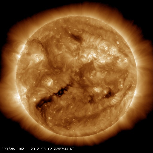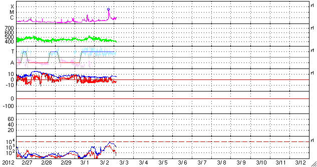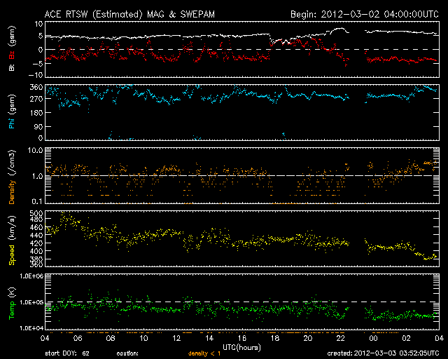 2012/ 3/ 3 12:53 更新 太陽の東端でM3.3のフレアが発生しました。太陽風は400km/秒台前半です。磁気圏の活動も続いています。 担当 篠原 昨夜、3日2時半(世界時2日17時半)に、 太陽の東端でM3.3の中規模フレアが発生しました。 GOES衛星のX線カメラの動画を掲載しますが、 太陽の向こう側で起きたフレアの様です。 このため、本当の規模はM3よりも大きかったのかもしれません。 GOES衛星の動画では、ちょうどフレア発生頃の写真が欠けていて、 きれいな動きになっていません。 パシッと光って見える印象が強いのは、そのためです。 このフレアを起こしたのではないかと思われる活動領域が、 可視光写真の東端に顔を出しています。 今後の活動に注目してください。 太陽風は、速度440km/秒、磁場強度5nTの状態が 昨日以降もずっと続いていました。 磁場の南北成分も、-3nTくらいの南向きが続いていて、 磁気圏活動を強めています。 AE指数のグラフでは、500nT前後の中小規模の活動が 一日を通して発生しています。 極域では、オーロラを楽しめたのではないでしょうか。 27日周期の図で、前周期の様子を見ると、 太陽風は現在の様な状態がまだ数日続いていました。 今回はどうなるでしょうか。 ACEの最新値では、速度が380km/秒に下がっています。 このまま低速風になってしまうのか、 それとも、この後も400km/秒台前半の風が続くのでしょうか。 放射線帯の高エネルギー電子が増加しています。 ぎりぎりですが、GOES15の値が10,000のレベルに達しています。 明日、更に増えている可能性もあるので、注目してください。 GOES-15のX線カメラによる、太陽の東の端で発生したM3.3のフレア。 (c) NOAA/SWPC 、(動画加工 : 宇宙天気ニュース) ![]() SDO衛星のAIA193カメラによる太陽コロナの様子 (c) SDO (NASA) ![]() SDO衛星による太陽の可視光写真。マウスの矢印を写真に重ねると、黒点番号付きの写真に切り替わります。 (c) SDO (NASA) ![]() GOES衛星の太陽X線データ (c) NOAA/SWPC ![]() ACEが観測した太陽風の磁場(1番上の枠、白線は全体の強度、赤線は南北成分) および、太陽風の密度(3番目の橙線)、速度(4番目の黄線) (c) NOAA/SWPC ![]() リアルタイムAE指数 下段のAEグラフの値が高くなると、オーロラ活動が活発化しています。 (c) 京都大学, NICT ![]() 27日の太陽周期に合わせたデータプロット 太陽が同じ面を地球に向けていた27日前の変化から、今後を予想することができます。 (c) 作図:宇宙天気ニュース