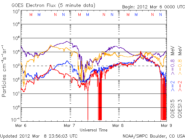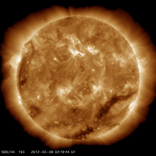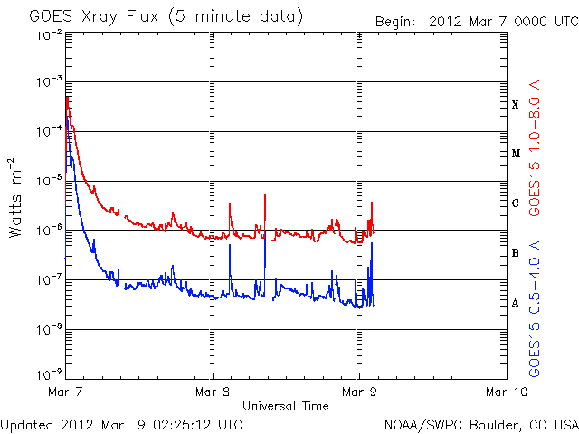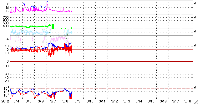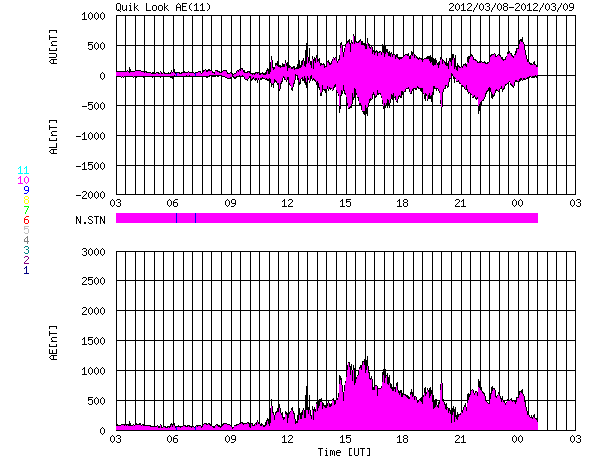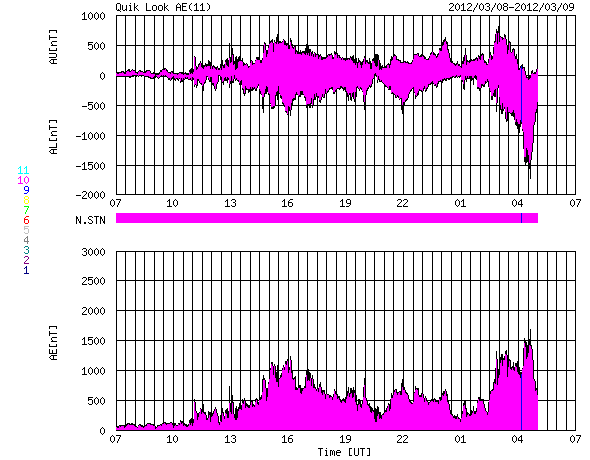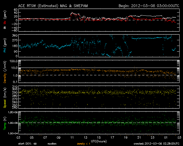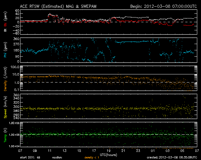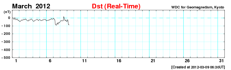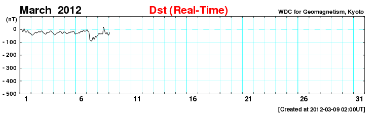 (c) NOAA/SWPC ![]() SDO衛星のAIA193カメラによる太陽コロナの様子 (c) SDO (NASA) ![]() SDO衛星による太陽の可視光写真。マウスの矢印を写真に重ねると、黒点番号付きの写真に切り替わります。 (c) SDO (NASA) ![]() GOES衛星の太陽X線データ (c) NOAA/SWPC ![]() GOES衛星の太陽放射線データ (c) NOAA/SWPC ![]() 2012/ 3/ 9 15:35 追加 Dst指数は、-100nT近くまで下がっています。 (c) 京都大学WDC ![]() ACEが観測した太陽風の磁場(1番上の枠、白線は全体の強度、赤線は南北成分) および、太陽風の密度(3番目の橙線)、速度(4番目の黄線) (c) NOAA/SWPC ![]() リアルタイムAE指数 下段のAEグラフの値が高くなると、オーロラ活動が活発化しています。 (c) 京都大学, NICT ![]() | ||||||||||||||||||||||||||||||||||||||||||||||||||||||||||||||||||||||||||||||||||||||||||||||||||||||||||||||||||||||||||||||||||||||||||||||||||||||||||||||||||||||||||||||||||||||||||||||||||||||||||||||||||||||||||||||||||||||||||||||||||||||||||||||||||||