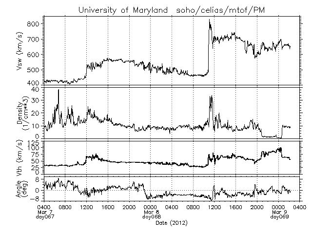 2012/ 3/ 9 11:28 更新 昨夜、CMEによる太陽風の乱れが到来しました。磁場が北向きだったため、磁気圏の激しい乱れは起きませんでした。 2012/ 3/ 9 15:35 追加 太陽風の磁場が南向きに強まり、磁気圏の擾乱が激しくなっています。 担当 篠原 カナダのバンクーバーに滞在中の南川 俊さんより、 現地の7日午前1時頃(一昨日の夜)に見えたオーロラの写真が届きました。 昨日のニュースで紹介したオーロラ活動の強まりに対応した観測です。 バンクーバーは、オーロラ帯と言われる地域と比べるとずっと緯度の低い所です。 ここでオーロラを見ることができたということは、 この夜のオーロラの活動が普段よりも激しかったことを示しています。 南川さんによると、満月や街の明かりがありながら、 肉眼でもしっかり見ることができたそうです。 興味深い写真をありがとうございました。 昨夜、追加のニュースでもお知らせしましたが、 8日19時40分(世界時8日10時40分)頃、 ACE衛星の磁場データに急な強まりが観測され、 7日に発生したX5.4に伴うCMEによる太陽風の乱れが到来しました。 初め、磁場強度は10nTから30nTに強まり、20分後には40nTまで高まりました。 リアルタイムではSOHO衛星の速度データを見ることができなかったのですが、 今朝までにデータが更新されていて、 それによると、擾乱到来時の太陽風の速度は800km/秒に達していたようです。 こちらは1時間ほどで700km/秒へ一段下がっています。 注目していた太陽風磁場の南北成分は、完全に北向きに振れ、 磁気圏への影響は限定的なものになりました。 オーロラを待望していた方には残念な、 磁気嵐の影響を心配されていた方にはうれしい変化だったと思います。 擾乱当初の磁場南北成分の赤線は、磁場強度の白線とくっつくように、 最大40nTまで強まっています。 これが反対の南向きの -40nTだったら、 かなり活発な磁気圏擾乱が発生したことでしょう。 実際の変化を見ると、 AE指数は500nTから最大1000nTの中規模の変動になっています。 また、磁気嵐の発達度を示すDst指数は、 激しい太陽風の到来によって最初に30nTほどプラスに変化していますが、 その後は-40nT程度下がったくらいで、磁気嵐は特に発達しなかった様です。 現在の太陽風は、速度は600〜700km/秒、 磁場強度は10nTとどちらも強まった状態が続いています。 磁場の南北成分は、南にも振れる様になっていて、 今後も活発なオーロラ活動が発生する可能性があります。 擾乱が残る今日、明日にかけては注意が必要です。 現在の太陽活動は、Cクラスのフレアが発生する様になっていて、 また活発になりつつあるのかもしれません。 1429黒点群の出現以降の変化を、SDO衛星の可視光写真の動画でご覧ください。 太陽放射線は、最大5000まで高まりましたが、 現在は1000を割りつつあります。 2012/ 3/ 9 15:35 追加 (篠原) 関連の図はページの最後にあります 昼頃から、太陽風の磁場が南向きに振れるようになり、 現在、-10nTの強い南向きが1時間以上続いています。 SOHO衛星によると、 太陽風の速度も650km/秒と高速で、 このため、磁気圏の擾乱が強まっています。 AE指数は、上のグラフを見て下さい。 下半分のAL指数は、普段通りマイナス側へ発達していますが、 普通はプラス側に高まる、上半分のAU指数が、 下へ向かって変化しています。 これは、オーロラの活動が激しくなって、 発生する領域が、 普段よりも低緯度域に大きく広がっているためと考えられます。 磁気圏の擾乱が激しくなっていることは、 Dst指数からも分かります。 マイナス方向へ向かって、大きく-100nT近くまで変化しています。 磁気嵐が強まっているところです。 現在の太陽風の状態が続けば、 磁気圏の激しい乱れも続きます。 今後のデータを注視する必要がありますが、 北海道などで低緯度オーロラが見える可能性が 出てくるかもしれません。 南川 俊 氏によってバンクーバで現地7日午前1時に撮影されたオーロラ。昨日のニュースで紹介したオーロラの強まりです。 (c) 南川 俊 氏 ![]() SOHO衛星プロトンモニターによる太陽風の2日間の変化。一段目が速度のグラフ。 (c) University of Maryland ![]() Dst指数(速報値)は、あまり大きな変化にはなりませんでした。Dst指数の変化は、マイナス方向に強まります。 (c) 京都大学WDC ![]() SDO衛星による1429黒点群の発達の様子。 (c) SDO (NASA)、 (動画加工 : 宇宙天気ニュース) ![]() ACEが観測した太陽風の磁場(1番上の枠、白線は全体の強度、赤線は南北成分) および、太陽風の密度(3番目の橙線)、速度(4番目の黄線) (c) NOAA/SWPC ![]() リアルタイムAE指数 下段のAEグラフの値が高くなると、オーロラ活動が活発化しています。 (c) 京都大学, NICT ![]() 27日の太陽周期に合わせたデータプロット 太陽が同じ面を地球に向けていた27日前の変化から、今後を予想することができます。 (c) 作図:宇宙天気ニュース