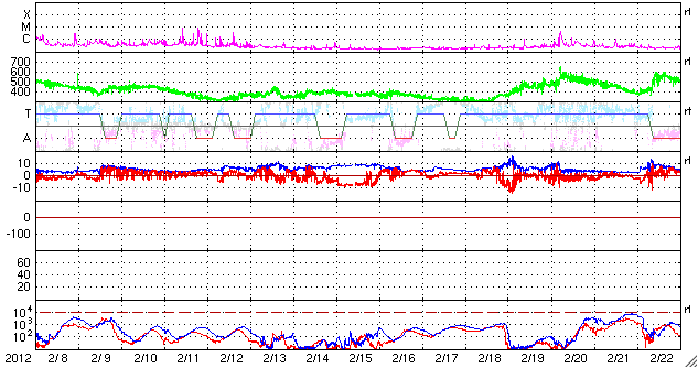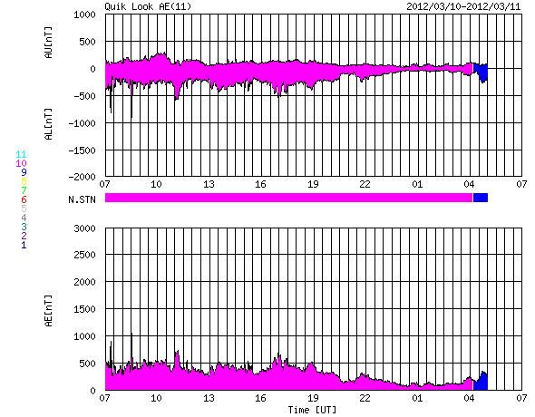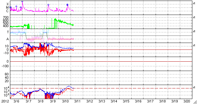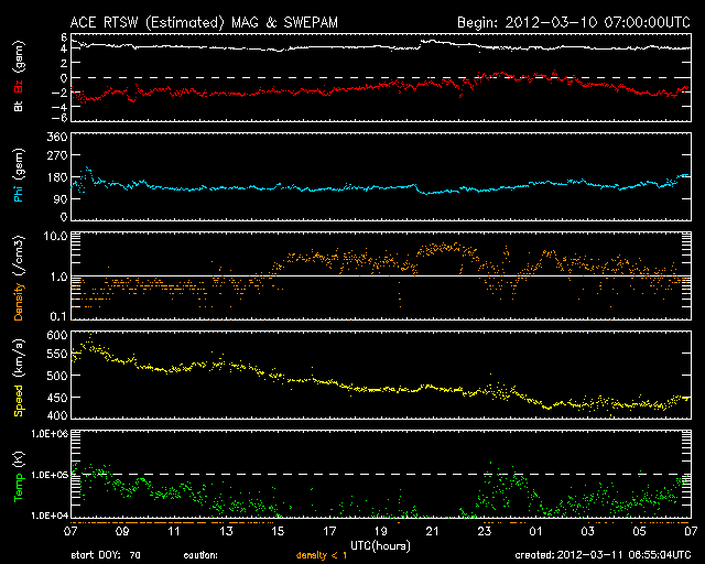 2012/ 3/11 15:56 更新 太陽風の乱れは終わりました。続いて、次の乱れが到来しそうです。 担当 篠原 今日は、更新がだいぶ遅くなってしまいました。 申し訳ありませんでした。 太陽風の乱れは、ひとまず終わったようです。 速度は昨日から下がり続け、 現在は430km/秒と平均的な速度に戻っています。 また、磁場強度も4nTと普通の値です。 磁場南北成分の南寄りの傾向は続いていて、 -2nT程度と弱くなりましたが、 マイナス側に振れています。 このため、磁気圏の乱れは、 激しさはなくなりましたが、 AE指数は500nT程度の変動が続いています。 太陽では、一昨日、9日12時半(世界時9日3時半)に、 M6.3の中規模フレアが起きました。 これに伴うCMEが、現在、地球に向かっている様です。 情報が得にくいため、詳しく分からないのですが、 今夜以降、再び太陽風の乱れがやって来る可能性があります。 前回の様な激しい変化ではありませんが、 磁場が南寄りで推移すれば、 活発なオーロラ活動が期待できます。 太陽では、深夜、11日2時(世界時10日17時)にも、 M8.4の中規模フレアが発生しています。 こちらもCMEを伴っているようなので、 13日以降は、そちらへの注意も必要になります。 また、太陽放射線は、だんだん低下しています。 今日まで、種子島のロケットコンテストに参加していました。 今、船で鹿児島へ戻りながら更新しています。 明日は名古屋行きで、 更新の時刻はまた遅くなるかもしれません。 SDO衛星のAIA193カメラによる太陽コロナの様子 (c) SDO (NASA) ![]() SDO衛星による太陽の可視光写真。マウスの矢印を写真に重ねると、黒点番号付きの写真に切り替わります。 (c) SDO (NASA) ![]() ACEが観測した太陽風の磁場(1番上の枠、白線は全体の強度、赤線は南北成分) および、太陽風の密度(3番目の橙線)、速度(4番目の黄線) (c) NOAA/SWPC ![]() リアルタイムAE指数 下段のAEグラフの値が高くなると、オーロラ活動が活発化しています。 (c) 京都大学, NICT ![]() 27日の太陽周期に合わせたデータプロット 太陽が同じ面を地球に向けていた27日前の変化から、今後を予想することができます。 (c) 作図:宇宙天気ニュース