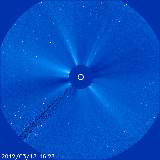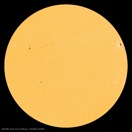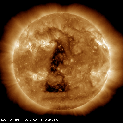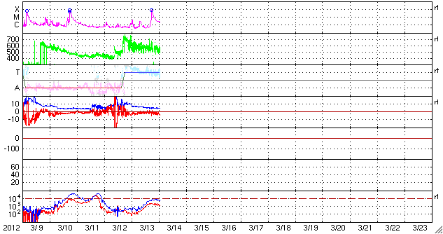 2012/ 3/14 10:37 更新 M7.9の中規模フレアが発生し、CMEも噴出しています。 担当 篠原 昨夜、14日2時(世界時13日17時)に、 1429黒点群でM7.9の中規模フレアが発生しました。 SDO衛星AIA193による動画を掲載します。 1429黒点群は、太陽の西の端にかなり近づいています。 地球側での最後の大きな爆発になるかもしれません。 このフレアに伴って、CMEが噴出しています。 SOHO衛星LASCO C3の動画をご覧ください。 太陽の右側により多くガスが噴き出していますが、 太陽の左側にもある程度の広がりが見えています。 このため、地球へも太陽風の乱れがある程度向かっているようです。 到来まで2日半から3日程度と考えると、 明後日、16日の昼から夜くらいに 太陽風の乱れが始まるかもしれません。 また、このフレアによって、 高エネルギー陽子の数も増えています。 これは、SOHOの動画にも見えていて、 白くちらちらしたノイズが増えています。 太陽風は、昨日のニュース以降特に乱れはなく、 昨日の乱れはCMEの到来だった様です。 速度は600km/秒から500km/秒へゆっくり下がっています。 まだ、高速の状態です。 磁場強度は5nTと平均的な強さです。 弱い南向きが続いていて、 AE指数は小さい変動が続いています。 SDO衛星の太陽コロナ写真によると、 コロナホールば太陽の中央部に広がっています。 3日後の17日頃には、 高速風の影響が大きくなっていると思われます。 ただ、16日には上記のCMEの乱れも到来しそうです。 太陽風の変化は、2つの乱れが重なることになりそうです。 放射線帯の高エネルギー電子は、再び高まって、 警戒レベルの10000に近付いています。 SDO AIA193による、M7.9の中規模フレア。 (c) SDO (NASA)、 (動画加工 : 宇宙天気ニュース) ![]() SOHO LASCO C3による、M7.9のフレアに伴って発生したCME。 (c) SOHO (ESA & NASA)、(動画加工 : 宇宙天気ニュース) ![]() SDO衛星のAIA193カメラによる太陽コロナの様子 (c) SDO (NASA) ![]() SDO衛星による太陽の可視光写真。マウスの矢印を写真に重ねると、黒点番号付きの写真に切り替わります。 (c) SDO (NASA) ![]() GOES衛星の太陽X線データ (c) NOAA/SWPC ![]() GOES衛星の太陽放射線データ (c) NOAA/SWPC ![]() ACEが観測した太陽風の磁場(1番上の枠、白線は全体の強度、赤線は南北成分) および、太陽風の密度(3番目の橙線)、速度(4番目の黄線) (c) NOAA/SWPC ![]() リアルタイムAE指数 下段のAEグラフの値が高くなると、オーロラ活動が活発化しています。 (c) 京都大学, NICT ![]() 27日の太陽周期に合わせたデータプロット 太陽が同じ面を地球に向けていた27日前の変化から、今後を予想することができます。 (c) 作図:宇宙天気ニュース