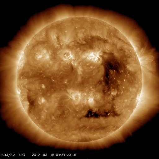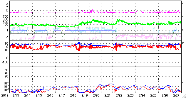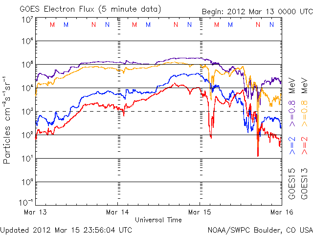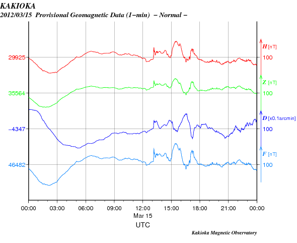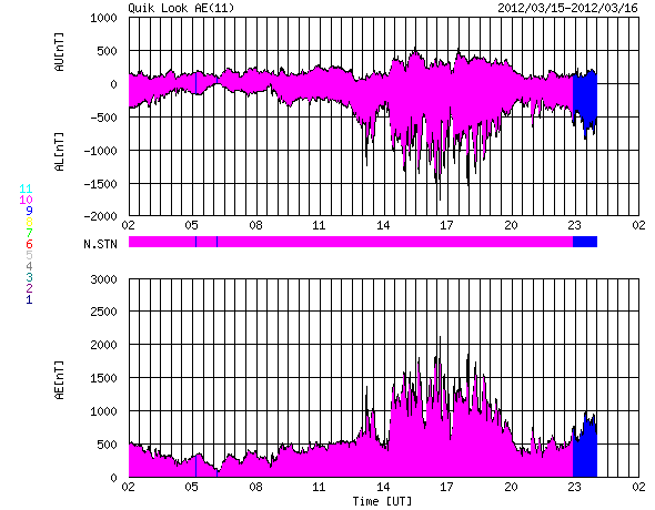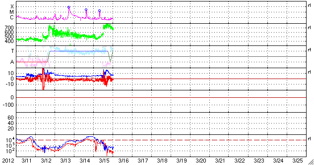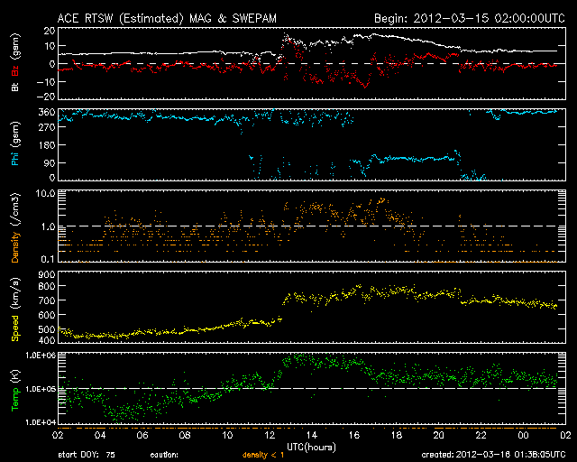 2012/ 3/16 10:38 更新 太陽風の乱れが到来し、活発な磁気圏活動が発生しました。ニュージーランドのオーロラをご覧下さい。 担当 篠原 ACE衛星の観測によると、 昨夜、15日21時半(世界時15日12時半)に、太陽風の乱れが到来しました。 14日2時(世界時13日17時)のM7.9のフレアに伴って発生したCMEが到来したものです。 1日半を経過しての到来で、太陽風の速度は、初めに700km/秒に上昇し、 その後、800km/秒近くまで上がりました。 また、磁場強度は15nT程度へ強まっています。 この太陽風の急な強まりは、30分ほど経過して地球に到達しています。 茨城県柿岡の地磁気観測所のデータを参照すると(今日3枚目の図)、 15日22時半(世界時15日13時)頃、グラフがそれぞれ急に変化しています。 これは、太陽風の圧力が強まって、 地球の磁気圏が急に押しつぶされたことによる変化です。 太陽風の磁場は、初めは北向きに強まりましたが、 1時間ほど経った頃から南に反転し、 -10nT程度の強い南向きが4時間近く続きました。 このため磁気圏は一気に活動的になり、 AE指数のグラフは1500〜1800nTの激しい変化を記録しました。 オーロラの活動も激しかった様で、 ニュージーランドの米戸 実さんが、 今朝、撮ったばかりの素晴らしいオーロラの写真を送って下さいました。 ニュージーランドはもう秋の気配が漂っているそうで、 観測に出かけたときで気温は3.7度、朝には氷点下に近い寒さになっていたそうです。 現地16日5時45分(夏時間の様ですので、世界時15日16時45分)頃からオーロラが急に激しくなり、 4色のオーロラが空を踊る大出現になったそうです。 しかし、始まった時刻が遅かったので、そのまま薄明が始まり、 撮影できたのは6時38分頃までだったそうです。 ニュージーランドは、緯度がやや低いので、 オーロラが激しくなって、発生地域がより広がった時に見ることができます。 AE指数のグラフは、世界時14時頃からかなり激しくなっているのに、 米戸さんのところでオーロラが激しくなったのが17時近くになっていたのは その関係かもしれません。 1枚目の写真の中程に低く見える明るい星はカノープス、 その左上の淡い星雲は大マゼラン雲、 さらにその左上には小マゼラン雲が写っている様です。 本当に美しい写真を、ありがとうございます。 (米戸さんを含む、過去に送っていただいた写真は「読者写真集」をご覧下さい) 太陽風の乱れは、やや弱まりながら現在も続いています。 速度は680km/秒と高速状態を保ち、磁場強度も7nTとやや強まった状態です。 CMEによる乱れは今日いっぱいくらい続くのではないでしょうか。 そして、この変化に続く様に、今度はコロナホールによる高速風が始まるかもしれません。 SDO衛星による太陽コロナの写真を見ると、 コロナホールは地球への影響が始まる目安の位置の西側半分ほどまで移動しています。 このまま、明日、明後日と太陽風は強まった状態が継続するかもしれません。 太陽は、15日16時半(世界時15日7時半)に、 中心部の1432黒点群でM1.8の中規模フレアが発生しました。 今後は1432黒点群の活動に注目して下さい。 昨日、一昨日のニュースで、 太陽風の乱れの到来を今日の16日頃と書いていましたが、 かなり遅すぎる見通しでした。 研究会の隙間を見つけての更新だったため、分析不足でした。 申し訳ありません。 ニュージーランド南島クィーンズタウンで、米戸実さんにより撮影された現地16日6時2分(世界時15日17時2分)のオーロラ。 (c) 米戸 実氏 ![]() ニュージーランド南島クィーンズタウンで、米戸実さんにより撮影された現地16日6時19分(世界時15日17時19分)のオーロラ。 (c) 米戸 実氏 ![]() 茨城県柿岡の地磁気観測所で観測された、太陽風の急な強まりによる磁場変化。 (c) 気象庁地磁気観測所 ![]() ACEが観測した太陽風の磁場(1番上の枠、白線は全体の強度、赤線は南北成分) および、太陽風の密度(3番目の橙線)、速度(4番目の黄線) (c) NOAA/SWPC ![]() リアルタイムAE指数 下段のAEグラフの値が高くなると、オーロラ活動が活発化しています。 (c) 京都大学, NICT ![]() 27日の太陽周期に合わせたデータプロット 太陽が同じ面を地球に向けていた27日前の変化から、今後を予想することができます。 (c) 作図:宇宙天気ニュース