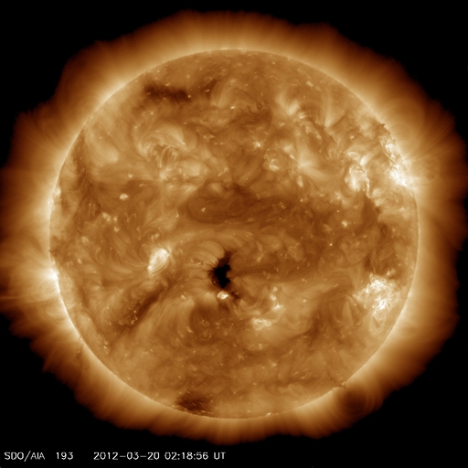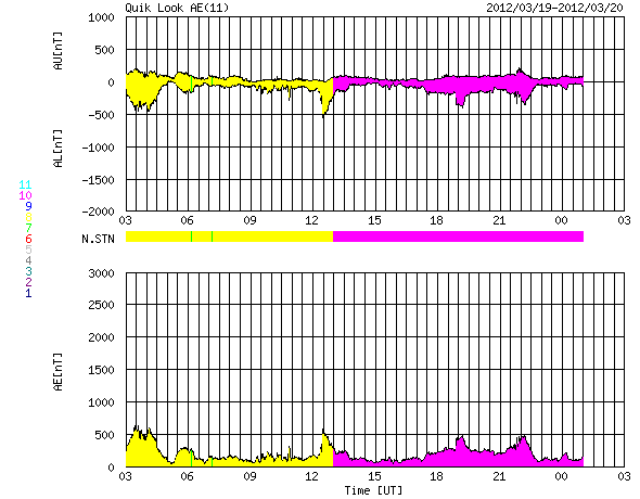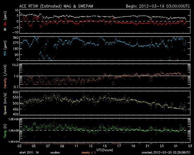 2012/ 3/20 11:26 更新 太陽風の速度は下がり、高速風は終わりつつあります。太陽も概ね静穏です。 担当 篠原 フィンランド、Oulu(北緯65度)にお住いの小松兼一さんより、 現地16日22時(日本時間17日5時、世界時16日20時)頃に撮影された 美しいオーロラの写真が届きました。 Ouluの街明かりの上に輝くオーロラの様子をどうぞご覧ください。 2枚目の写真は白樺の木々の間に見えたオーロラだそうです。 15日にやってきた太陽風の乱れの真っ最中に撮影されたオーロラです。 本当は撮影直後に送ってくださっていたのですが、 出張と停電の関係で掲載が遅くなってしまいました。 小松さんは昨年11月からOuluにお住いとのことで、 この夜は、市内の街明かりの中でも十分見ることができ、 郊外へ出ると、月明かりの様に足下が明るく照らされることもあったそうです。 フィンランドのオーロラは初掲載です。 どうもありがとうございます。 現在の太陽風は、コロナホールの影響も終わりに近づいているようです。 昨夜より、磁場強度は5nTから3nTに弱まり、 速度は、530km/秒から450km/秒に下がっています。 この後も、穏やかな太陽風に変わって行きそうです。 これに合わせるように、AE指数のグラフも、 変化は200〜500nTとやや小さくなっています。 太陽風の弱まりとともに、今後も変化は小さくなって行くでしょう。 SDO衛星AIA193によると、現在の太陽コロナは、 中心付近に小さいコロナホールが見えますが、 この大きさでは、特に大きな影響はないでしょう。 その他にはコロナホールも見られず、しばらく静かな太陽風が続きそうです。 放射線帯の高エネルギー電子は、今日も10000の警戒レベルを超えています。 太陽風が穏やかになると、今後の減少はゆっくりと進みます。 まだ数日にわたって高い状態が続く可能性があります。 太陽では、今朝、20日7時(世界時19日22時)に C3.5の小規模フレアが1434黒点群で発生しています。 しかし、1434群は特に発達する様子もなく、このまま西に没して行きそうです。 そして、太陽はしばらく静かになりそうです。 フィンランド、Ouluの小松兼一さんによる、現地16日22時13分のオーロラ。 (c) 小松兼一氏 ![]() フィンランド、Ouluの小松兼一さんによる、現地16日22時08分のオーロラ。 (c) 小松兼一氏 ![]() フィンランド、Ouluの小松兼一さんによる、現地16日22時35分のオーロラ。 (c) 小松兼一氏 ![]() SDO衛星のAIA193カメラによる太陽コロナの様子 (c) SDO (NASA) ![]() SDO衛星による太陽の可視光写真。マウスの矢印を写真に重ねると、黒点番号付きの写真に切り替わります。 (c) SDO (NASA) ![]() ACEが観測した太陽風の磁場(1番上の枠、白線は全体の強度、赤線は南北成分) および、太陽風の密度(3番目の橙線)、速度(4番目の黄線) (c) NOAA/SWPC ![]() リアルタイムAE指数 下段のAEグラフの値が高くなると、オーロラ活動が活発化しています。 (c) 京都大学, NICT ![]() 27日の太陽周期に合わせたデータプロット 太陽が同じ面を地球に向けていた27日前の変化から、今後を予想することができます。 (c) 作図:宇宙天気ニュース