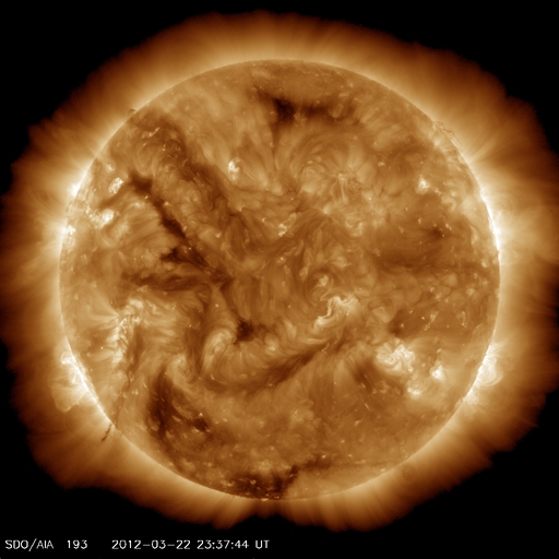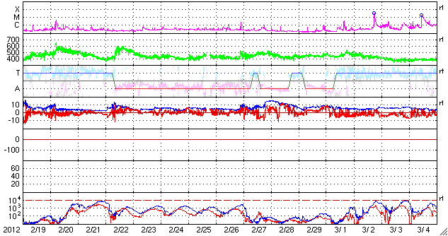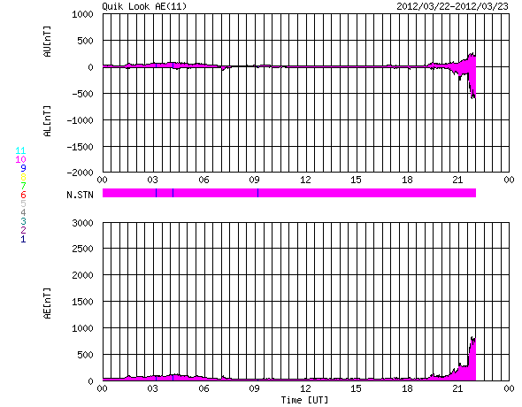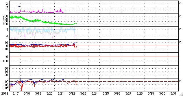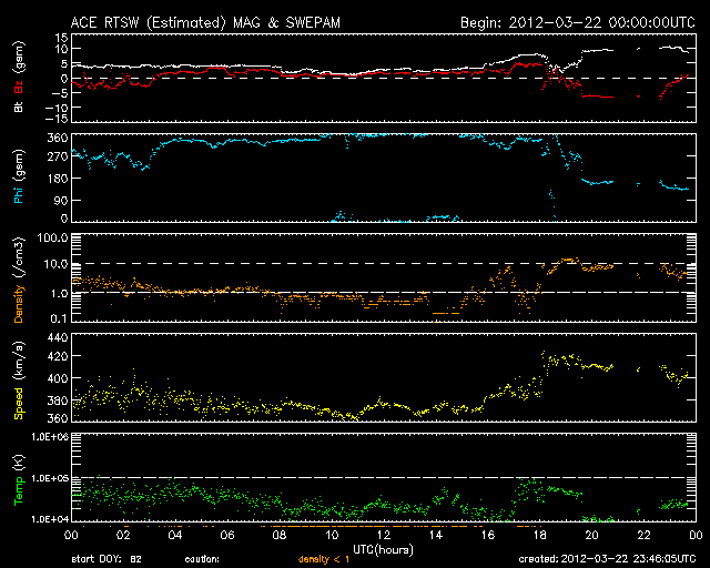 2012/ 3/23 08:46 更新 太陽風に弱い変化が発生しています。太陽は穏やかの様です。 担当 篠原 太陽風は、23日4時(世界時22日19時)頃にセクターの切り替わりを迎えたようです。 27日周期の図を見ると、セクターのグラフが、 「T」の青色から「A」の赤色に切り替わりそうな様子です。 もしそうであれば、今回も27日周期より2日ほど長くかかって回帰したことになります。 セクター境界とは、太陽風の磁場の大まかな方向が、 T(地球から太陽向き)と、A(太陽から地球向き)の間で切り替わる変化のことです。 この変化は太陽コロナの磁場の分布と関係しています。 そして、境界を越える時に太陽風の様子が変わることもあります。 今回も、太陽風の磁場強度が10nTまで強まり、 プラズマの密度が1個/cm^3から10個/cm^3へ増え、 速度も小幅ですが370km/秒から410lkm/秒へ高まるなどの変化が見えています。 これらの変化はあまり長く続かず、今日のうちに落ち着くのではないかと思います。 太陽磁場が強まるとともに、大きく南に振れています。 この影響で一時的に磁気圏活動が強まりそうです。 AE指数のグラフは既に800nTの変化を記録しています。 今後は太陽風の変化が落ち着くとともに、磁気圏も静穏な状態に戻るでしょう。 ただ、この変動の影響で、放射線帯の高エネルギー電子が一気に減少しそうです。 GOESのグラフは既に10分の1程度に下がっています。 太陽は、GOES衛星のX線のグラフが21日で止まっていて、 最新の状況が分かりません。 可視光写真では、昨日注目した1440黒点群は小さくなっています。 全体的には穏やかな様です。 一方、太陽の南東の端に活動的な領域がある様です。 もうすぐこちら側に姿を現すでしょう。 これから和歌山へ出発します。 月曜日まで更新が不定期になると思います。 ご了解下さい。 SDO衛星のAIA193カメラによる太陽コロナの様子 (c) SDO (NASA) ![]() SDO衛星による太陽の可視光写真。マウスの矢印を写真に重ねると、黒点番号付きの写真に切り替わります。 (c) SDO (NASA) ![]() ACEが観測した太陽風の磁場(1番上の枠、白線は全体の強度、赤線は南北成分) および、太陽風の密度(3番目の橙線)、速度(4番目の黄線) (c) NOAA/SWPC ![]() リアルタイムAE指数 下段のAEグラフの値が高くなると、オーロラ活動が活発化しています。 (c) 京都大学, NICT ![]() 27日の太陽周期に合わせたデータプロット 太陽が同じ面を地球に向けていた27日前の変化から、今後を予想することができます。 (c) 作図:宇宙天気ニュース