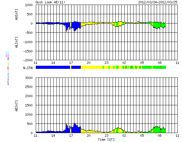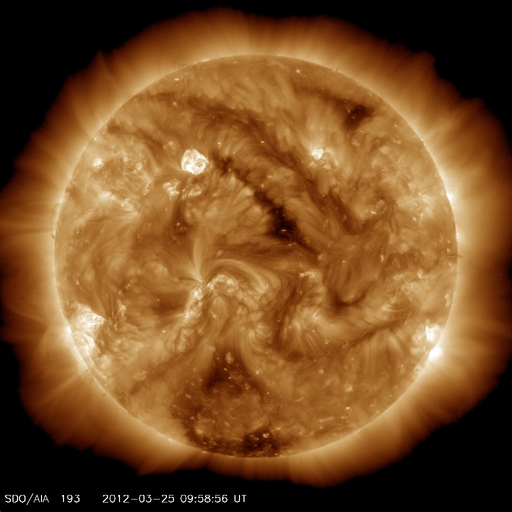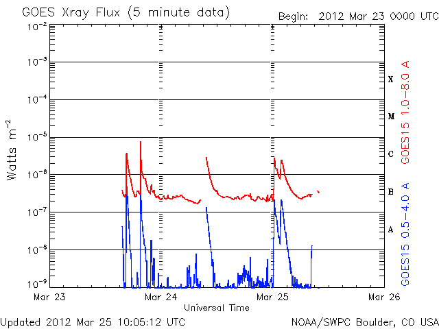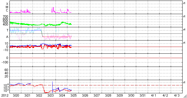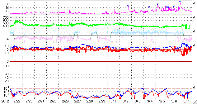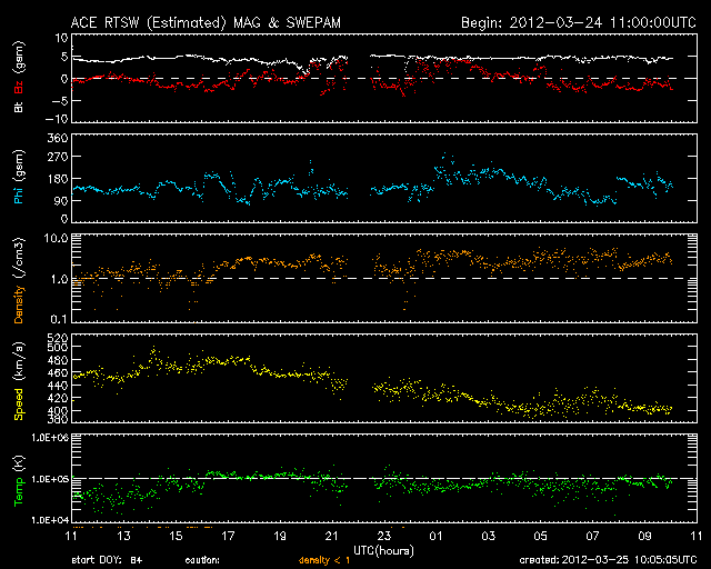 2012/ 3/25 19:06 更新 太陽で小規模フレアが起きています。太陽風は平均的な速度です。 担当 篠原 今日は、移動の関係で更新する時間が作れませんでした。 夜になってしまいましたが、 簡単に現況をお知らせします。 太陽では、北東寄りの1444黒点群と、 南東端の1445黒点群で、 Cクラスの小規模フレアが発生しています。 昨日、24日18時(世界時24日9時)に、 1445群でC7.2。 今朝、25日9時(世界時25日0時)に、 1444群でC3.0。 続いて、25日10時半(世界時251時半)に、 1445群でC2.5です。 今後もこれらの群の活動に注目してください。 太陽風は、昨夜、速度が480km/秒に高まる 小さな変化が見られました。 速度は今朝から下がり始めて、 現在は400km/秒と平均的な状態に戻っています。 磁気圏は、基本的には穏やかですが、 太陽風磁場が弱い南向きになる変化にあわせて、 小規模の変動が時々起きています。 この後も、太陽風は基本的には穏やかでしょう。 明日の午後、鹿児島に戻ります。 火曜日からは通常に戻れます。 SDO衛星のAIA193カメラによる太陽コロナの様子 (c) SDO (NASA) ![]() SDO衛星による太陽の可視光写真。マウスの矢印を写真に重ねると、黒点番号付きの写真に切り替わります。 (c) SDO (NASA) ![]() GOES衛星の太陽X線データ (c) NOAA/SWPC ![]() ACEが観測した太陽風の磁場(1番上の枠、白線は全体の強度、赤線は南北成分) および、太陽風の密度(3番目の橙線)、速度(4番目の黄線) (c) NOAA/SWPC ![]() リアルタイムAE指数 下段のAEグラフの値が高くなると、オーロラ活動が活発化しています。 (c) 京都大学, NICT ![]() 27日の太陽周期に合わせたデータプロット 太陽が同じ面を地球に向けていた27日前の変化から、今後を予想することができます。 (c) 作図:宇宙天気ニュース