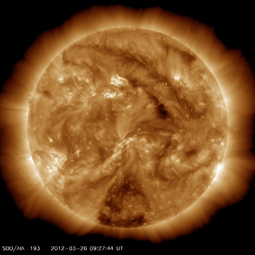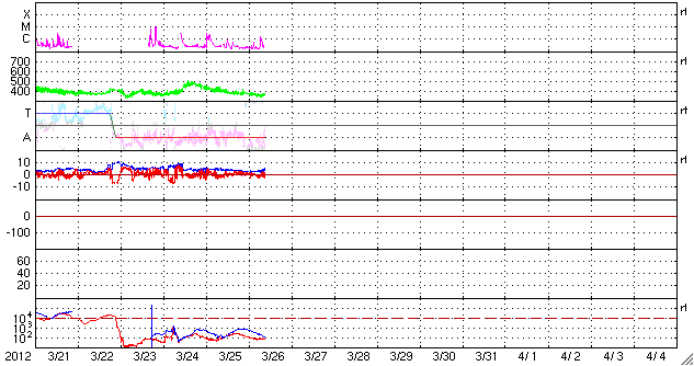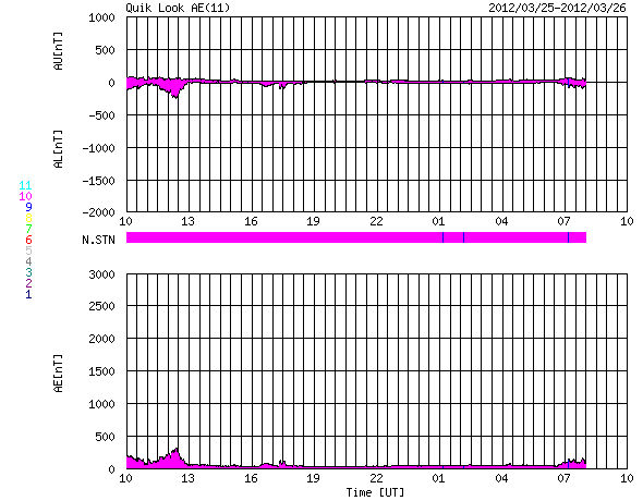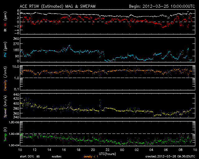 2012/ 3/26 18:36 更新 太陽風は低速の風になりました。太陽の活動もC1.5のフレアが発生した程度です。 担当 篠原 今日も夕方の更新になり申し訳ありません。 鹿児島に戻りましたので、明日からは通常の更新ができます。 太陽風は、昨日の夕方以降もゆっくりと速度が下がり、 400km/秒から、現在は360km/秒と低速の風に変わっています。 磁場強度も、3〜4nTとやや弱めの値です。 磁場の南北成分は北寄りに推移していて、磁気圏の活動も静かです。 AE指数のグラフはほとんど変化していません。 今後の太陽風ですが、 SDO衛星AIA193の太陽コロナ写真によると、 北半球側の真ん中右寄りに、小さいコロナホールが見えています。 この弱い影響が、28日、29日くらいに地球にやって来るかもしれません。 また、27日周期の図を見ると、29日前後にセクター境界が到来しそうです。 この切り替わりに関係して、太陽風の速度や磁場が強まる可能性もあります。 どちらも大きな乱れの要素ではありませんが、 28日以降、太陽風やオーロラ活動がどの様になるか注目してください。 太陽では、今日、26日15時(世界時26日6時)に、 1444黒点群でC1.4の小規模フレアが起きています。 現在はそれほど活発ではありませんが、 1444群や南東の1445群などで、 今後も小中規模のフレアが発生する可能性があります。 SDO衛星のAIA193カメラによる太陽コロナの様子 (c) SDO (NASA) ![]() SDO衛星による太陽の可視光写真。マウスの矢印を写真に重ねると、黒点番号付きの写真に切り替わります。 (c) SDO (NASA) ![]() ACEが観測した太陽風の磁場(1番上の枠、白線は全体の強度、赤線は南北成分) および、太陽風の密度(3番目の橙線)、速度(4番目の黄線) (c) NOAA/SWPC ![]() リアルタイムAE指数 下段のAEグラフの値が高くなると、オーロラ活動が活発化しています。 (c) 京都大学, NICT ![]() 27日の太陽周期に合わせたデータプロット 太陽が同じ面を地球に向けていた27日前の変化から、今後を予想することができます。 (c) 作図:宇宙天気ニュース