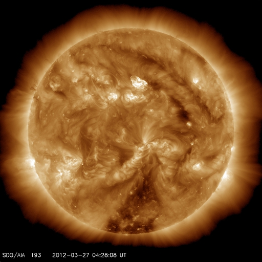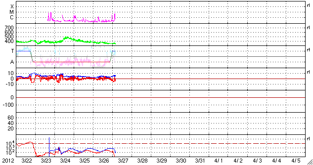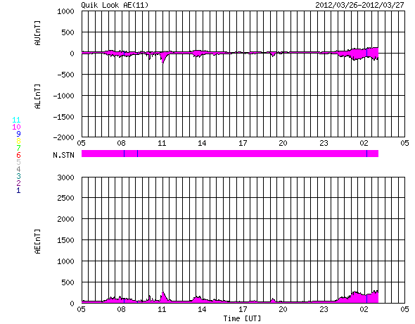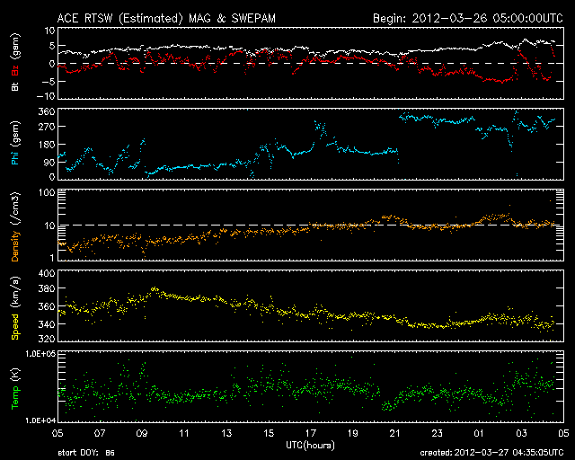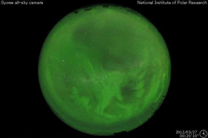 2012/ 3/27 13:32 更新 太陽風は低速です。磁場が南寄りに変わり、オーロラ活動が少し強まっています。 担当 篠原 フレアの発生をお知らせするメールを始めます。 このページ上部の「速報メール」のページからお申し込み下さい。 Twitterで流している速報のメール版で、内容に違いはありません。 現在もフレアの発生はあまり激しくありませんが、太陽活動の極大期を味わって下さい。 太陽風は、350km/秒と低速の状態が続いています。 磁場強度も4nTと平均的な値で推移しています。 今朝、27日6時(世界時26日21時)に、太陽風磁場のセクター境界がやって来た様です。 ACEの図では、水色の線がここでジャンプしています。 また、27日周期の図のセクターのグラフを見ると、 太陽風磁場の大まかな方向が 「A:太陽から地球方向」から「T:地球から太陽方向」へ変わっています。 ただし、前周期の変化を見ると、 2月28〜29日に短時間の「T」への変化が起きてすぐ戻り、 3月1日以降安定した「T」に変わっています。 今日の変化も、短時間で一旦「A」に戻るかもしれません。 また、セクターの切り替わりとともに、 太陽風磁場の南北成分が南寄りの傾向に変わっています。 このため、27日9時(世界時27日0時)以降のAE指数に小規模の変化が発生しています。 この頃の南極、昭和基地のオーロラの様子を全天カメラの動画で紹介します。 いよいよオーロラの季節は南半球へ移った様です。 太陽では、お昼、27日12時(世界時27日3時)に、 1444黒点群でC5.4の小規模フレアが発生しました。 ただ、可視光写真では1444群はほとんど見えなくなっています。 今後もこの領域の活動に注目して下さい。 また、この後、東の端から新しい黒点群が姿を現しそうです。 STEREO Behind衛星によると、ここでフレアが発生しています。 出現後は、こちらへの注意も必要になりそうです。 南極の昭和基地で全天カメラにより撮影された、明け方のオーロラ。 (c) 国立極地研究所、(動画加工 : 宇宙天気ニュース) ![]() SDO衛星のAIA193カメラによる太陽コロナの様子 (c) SDO (NASA) ![]() SDO衛星による太陽の可視光写真。マウスの矢印を写真に重ねると、黒点番号付きの写真に切り替わります。 (c) SDO (NASA) ![]() ACEが観測した太陽風の磁場(1番上の枠、白線は全体の強度、赤線は南北成分) および、太陽風の密度(3番目の橙線)、速度(4番目の黄線) (c) NOAA/SWPC ![]() リアルタイムAE指数 下段のAEグラフの値が高くなると、オーロラ活動が活発化しています。 (c) 京都大学, NICT ![]() 27日の太陽周期に合わせたデータプロット 太陽が同じ面を地球に向けていた27日前の変化から、今後を予想することができます。 (c) 作図:宇宙天気ニュース