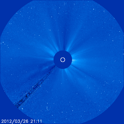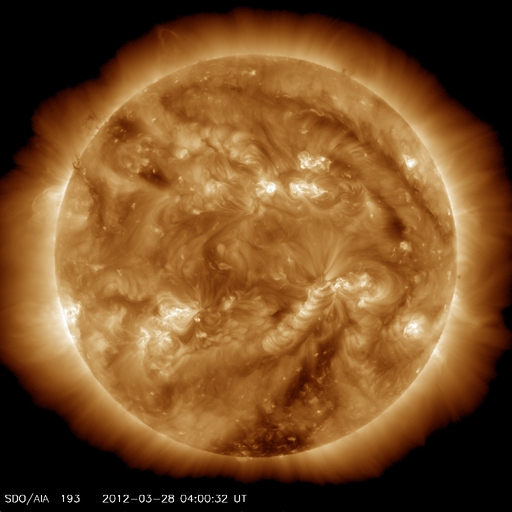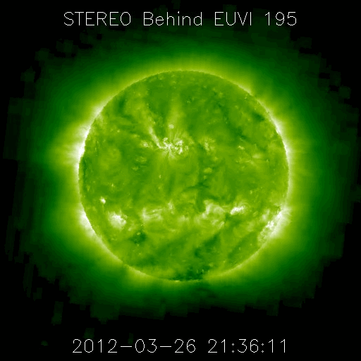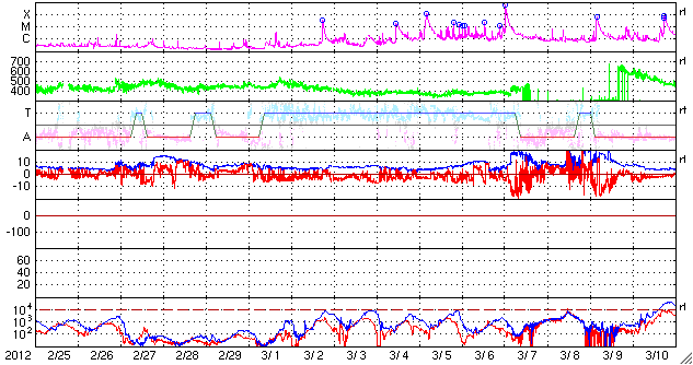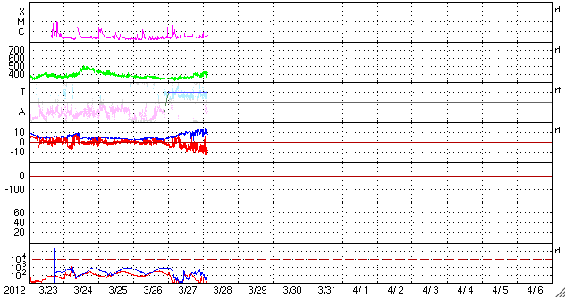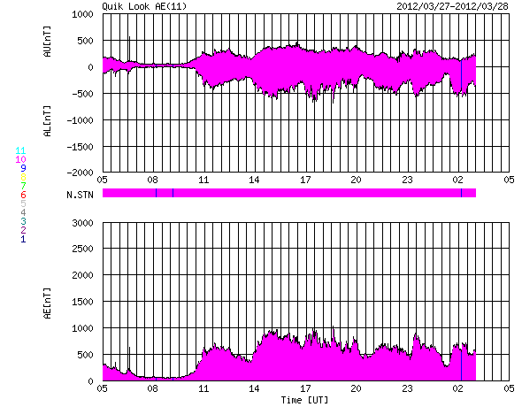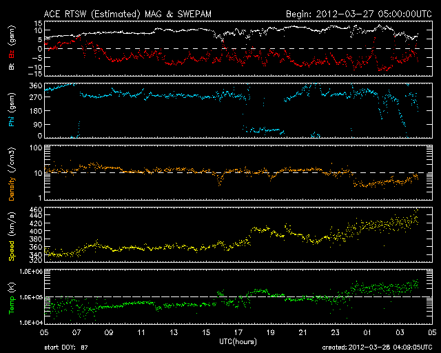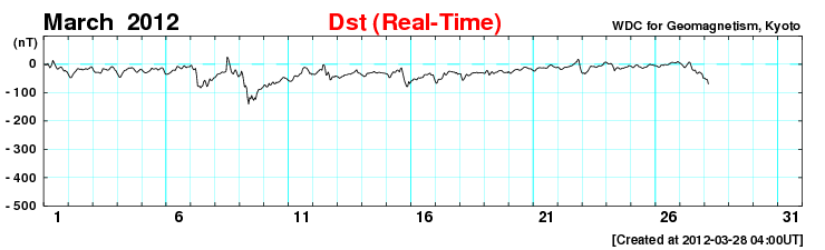 2012/ 3/28 13:09 更新 太陽風磁場が長時間南向きに強まり、活発な磁気圏の活動を起こしています。 担当 篠原 昨日のニュースの後、太陽風の磁場は大きく強まり、 27日21時(世界時27日12時)には、10nTに達しました。 その後、半日にわたって10nTを前後しました。 太陽風の速度は、360km/秒と低速の状態が続きましたが、 28日に入った頃から少しずつ上がり、 現在は420km/秒と平均的な速度になっています。 27日周期の図で紹介したように、 昨日、27日に太陽風磁場のセクターの切り替わりを通過しました、 それに関連した磁場の強まりだったのではないかと思います。 この間、太陽風磁場の南北成分は、-5nTから -10nTと強めの南向きが続きました。 この影響で、磁気圏の活動が強まり、磁気嵐が発生しています。 AE指数は500〜1000nTの中規模の変動が半日以上続いています。 図の上側のAU指数(+方向)、AL指数(−方向)は、どちら側も大きく変化していて、 オーロラ活動の強まりとともに、 磁気圏のプラズマの対流も強まっていたと考えられます。 京都大学WDCによると、 Dst指数は現時点で -70nTの変化幅になっています。 中規模の磁気嵐になりそうです。 太陽風の磁場強度は、昼前から弱まり始めて5nT近くに下がっています。 太陽風磁場の強まりは、この後は落ち着いていきそうです。 そして、速度400km/秒付近の平均的な風が続くのではないかと思います。 磁場強度が弱まってきたことから、磁気圏の乱れも次第に弱まって行くでしょう。 SOHO衛星LASCO C3カメラによると、 27日8時(世界時26日23時)に太陽の左側を中心に、 全体を包むように広がるハロー型のCMEが発生しました。 STEREO Behind衛星のデータを調べると、フレアはこの衛星の正面で発生しています。 地球からは太陽の裏側に当たるので、このCMEの影響はありません。 しかし、この活動的な領域はもうすぐ地球側に回ってくるので、 今後はこの領域の活動に対する注意が必要になるでしょう。 現在の地球側の太陽活動は弱く、 昨日のニュース以降、目立ったフレアは発生していません。 Dst指数(速報値)は、-70nT近くまで下がっています。Dst指数の変化は、マイナス方向に強まります。 (c) 京都大学WDC ![]() SOHO衛星LASCO C3カメラによる、太陽の裏側へ噴出したCME。 (c) SOHO (ESA & NASA)、 (動画加工 : 宇宙天気ニュース) ![]() STEREO Behind衛星から見たフレアとCME。この衛星に向かってCMEは噴き出しています。 (c) SDO (NASA)、動画加工 : 宇宙天気ニュース ![]() SDO衛星のAIA193カメラによる太陽コロナの様子 (c) SDO (NASA) ![]() SDO衛星による太陽の可視光写真。マウスの矢印を写真に重ねると、黒点番号付きの写真に切り替わります。 (c) SDO (NASA) ![]() ACEが観測した太陽風の磁場(1番上の枠、白線は全体の強度、赤線は南北成分) および、太陽風の密度(3番目の橙線)、速度(4番目の黄線) (c) NOAA/SWPC ![]() リアルタイムAE指数 下段のAEグラフの値が高くなると、オーロラ活動が活発化しています。 (c) 京都大学, NICT ![]() 27日の太陽周期に合わせたデータプロット 太陽が同じ面を地球に向けていた27日前の変化から、今後を予想することができます。 (c) 作図:宇宙天気ニュース