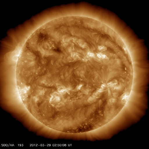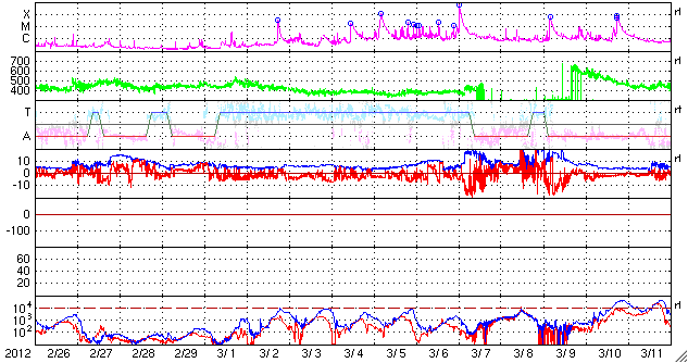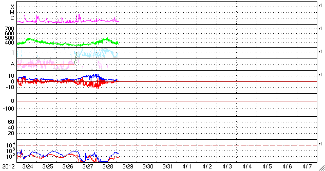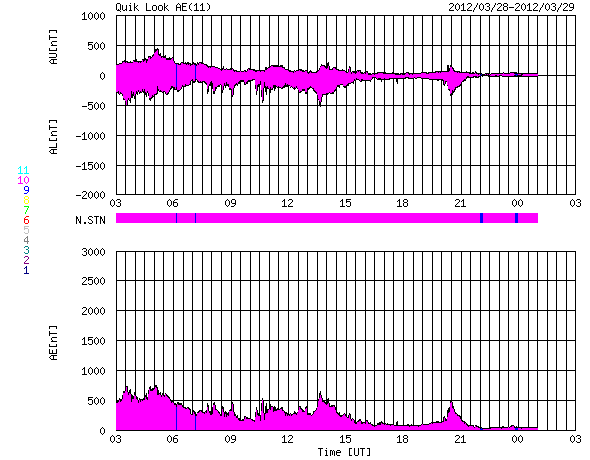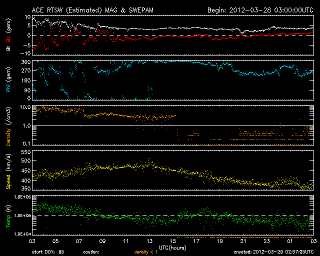 2012/ 3/29 11:58 更新 太陽風磁場の強まりは終わり、速度も低速になりそうです。磁気圏は穏やかになっています。 担当 篠原 角田桂子さんより、2008年、2010年と以前に撮影されたものですが、 アイスランドのオーロラ写真をいただきました。 アイスランドは北半球のオーロラ帯の直下にあり、オーロラ観望の好適地です。 角田さんはこちらに長期滞在されていたとのことで、 氷河や氷河湖と重ねた、極北の地ならではの美しい写真たちです。 撮影時の宇宙天気ニュースを調べると、 それぞれコロナホールによる高速の太陽風がやって来て、 磁気圏活動が活発に発生していました。 こうやって振り返るのも興味深いです。 どうもありがとうございました。 アイスランドは南極の昭和基地と磁力線でつながっている地域であることも特徴で、 南北両半球で同時に見えるオーロラの研究を行っていることでも知られています。 国立極地研究所の解説ページをご覧ください。 現在の宇宙天気は、 強まっていた太陽風の磁場は、昨日のニュースの後は5nTを割るくらいに下がり、 現在は3nTとやや弱まった状態になっています。 一方、速度は、昨夜まで450km/秒とやや高速の状態が続きましたが、 夜半を過ぎた頃から下がり始め、今朝はもう400km/秒を割っていました。 現在は370km/秒くらいに下がって、このまま低速風になるかもしれません。 太陽風の強まりが収まるとともに、 磁場の南北成分も0nT付近に留まるようになり、 その結果、磁気圏の乱れも弱まっています。 AE指数のグラフの変動は、前半から後半へ次第に振れ幅が小さくなっています。 今後は、現状の様な穏やかな太陽風がしばらく続くと思われます。 オーロラの活動も小さなものに留まりそうです。 太陽は、今朝、C1.5の小規模フレアが発生した程度で、活動は穏やかです。 北半球側の東端から、活発にフレアを起こしている活動領域がもうすぐ顔を出します。 今後は、こちらへの注意が必要になりそうです。 角田桂子さんによる、2008年2月1日にアイスランドで撮影したレイキャヴィークの街の上のオーロラ。 (c) 角田桂子氏 ![]() 角田桂子さんによる、2008年10月3日にアイスランドで撮影したオーロラ。 (c) 角田桂子氏 ![]() 角田桂子さんによる、2008年10月11日にアイスランドで撮影した、噴火以前のエイヤフィヤトラ氷河とオーロラ。 (c) 角田桂子氏 ![]() 角田桂子さんによる、2010年4月4日にアイスランドで撮影した、氷河湖を照らすオーロラ。 (c) 角田桂子氏 ![]() SDO衛星のAIA193カメラによる太陽コロナの様子 (c) SDO (NASA) ![]() SDO衛星による太陽の可視光写真。マウスの矢印を写真に重ねると、黒点番号付きの写真に切り替わります。 (c) SDO (NASA) ![]() ACEが観測した太陽風の磁場(1番上の枠、白線は全体の強度、赤線は南北成分) および、太陽風の密度(3番目の橙線)、速度(4番目の黄線) (c) NOAA/SWPC ![]() リアルタイムAE指数 下段のAEグラフの値が高くなると、オーロラ活動が活発化しています。 (c) 京都大学, NICT ![]() 27日の太陽周期に合わせたデータプロット 太陽が同じ面を地球に向けていた27日前の変化から、今後を予想することができます。 (c) 作図:宇宙天気ニュース