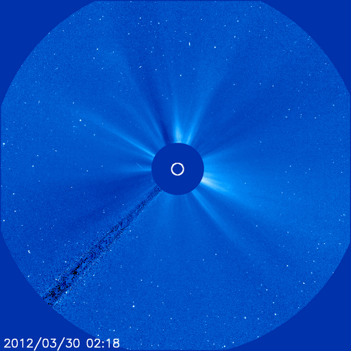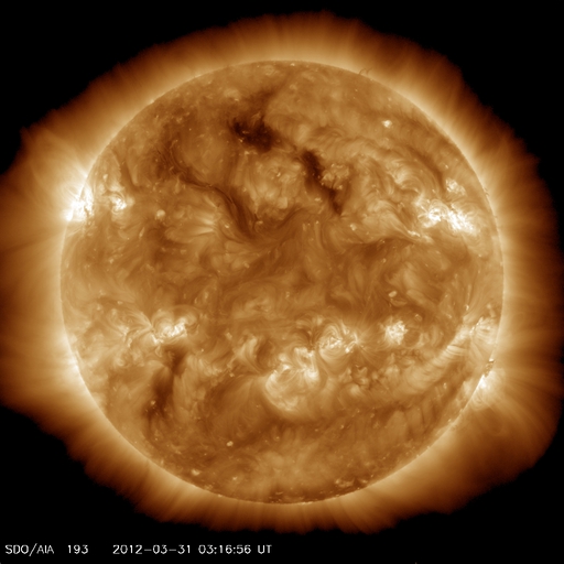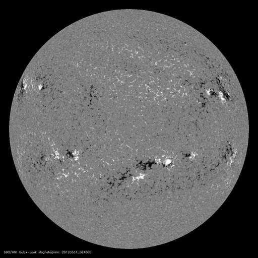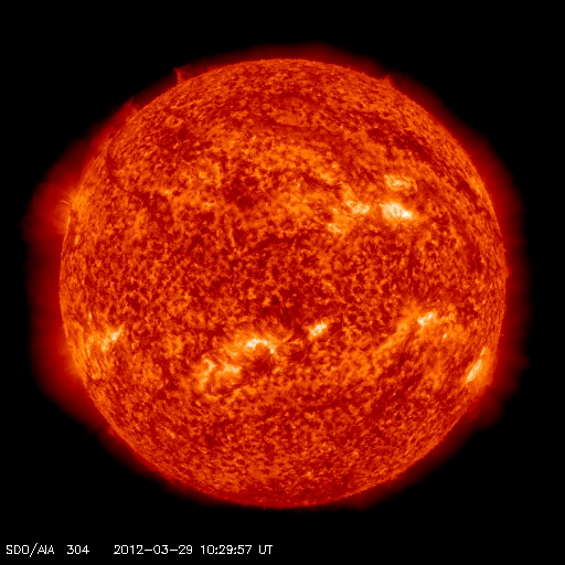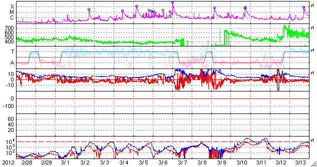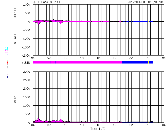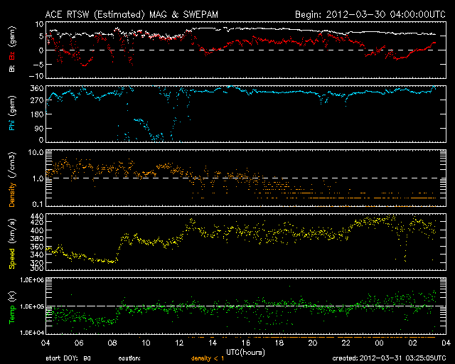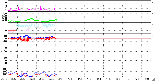 2012/ 3/31 12:25 更新 太陽のフレア活動は静かです。太陽風は平均的な状態です。 担当 篠原 1429黒点群はこちら側へ戻ってくる前に力尽きてしまったのでしょうか、 白斑や磁場の強まりは姿を現しましたが、黒点は見えなくなっています。 向こう側にいる間は、フレアを起こしていたようなのですが、 現在は静かになっています。 もうしばらく様子を見てみましょう。 また、太陽の北部でフィラメントの噴出が3回ほど発生しています。 SDO衛星AIA304の動画を掲載します。 北極付近で2回見えた後、北東側でもう一つ発生しています。 こちらはフレアなのかもしれません。 これに伴って、CME(太陽ガスの放出現象)も北に向かって噴き出しています。 地球への影響は特にはなさそうです。 太陽風は、昨日の午後から400km/秒台に上がり、 低速風から平均的な速さに戻っています。 現在は420km/秒です。 27日周期の図でも、前周期の今頃はこのくらいの速度でしたので、 前回と同じような状態が続いていると言えそうです。 磁場強度は5〜6nT付近で安定しています。 南北成分は北寄りになっていて、磁気圏は穏やかです。 AE指数のグラフはほとんど変化していません。 この後も、しばらく穏やかな状態が続きそうです。