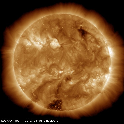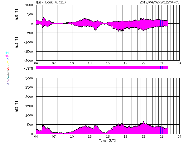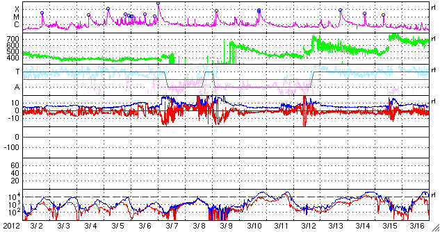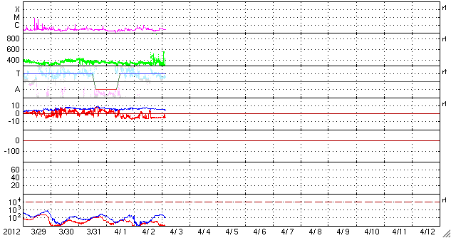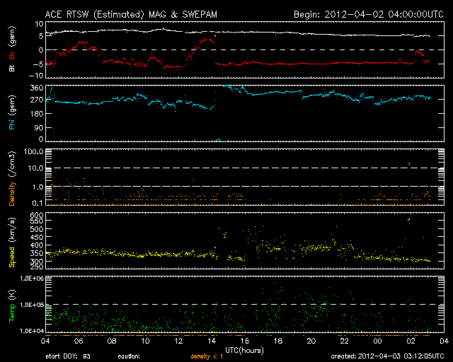 2012/ 4/ 3 12:12 更新 太陽風磁場の南向きが続いています。磁気圏の活動も続いています。 担当 篠原 太陽風磁場の南向きが続いています。 昨日のニュース以降も、太陽風の磁場強度は5〜6nTで安定するとともに、 南北成分はほとんどの時間帯で -5nTの南向きになっていました。 一方、太陽風の速度は、350km/秒から現在は300km/秒と低速の状態が続いています。 このため、南向き磁場の影響で磁気圏活動は連続的に発生していますが、 AE指数の変動の規模は500nT前後と小中規模に留まっています。 磁場の南向きはこの後どのくらいまで続くのでしょうか。 また、弱いコロナホールの影響がこの後やって来る可能性があります。 太陽風の速度に変化が見られたり、磁場の変化なども起きる可能性があります。 あまり大きな変化にはならないと思われますが、引き続き注目してください。 太陽は、X線のグラフではCクラスに届く変化は起きていません。 しかし、X線の動画を見ると、北東部の1450黒点群から1452黒点群にかけて、 小さな活動が頻繁に起きています。 今後、変化が強まる様だと注意が必要でしょう。 現在、鹿児島はかなり強い風が吹いています。 咲いたばかりの桜の花が飛ばされてしまいそうです。 ![]() SDO衛星のAIA193カメラによる太陽コロナの様子 (c) SDO (NASA) ![]() SDO衛星による太陽の可視光写真。マウスの矢印を写真に重ねると、黒点番号付きの写真に切り替わります。 (c) SDO (NASA) ![]() ACEが観測した太陽風の磁場(1番上の枠、白線は全体の強度、赤線は南北成分) および、太陽風の密度(3番目の橙線)、速度(4番目の黄線) (c) NOAA/SWPC ![]() リアルタイムAE指数 下段のAEグラフの値が高くなると、オーロラ活動が活発化しています。 (c) 京都大学, NICT ![]() 27日の太陽周期に合わせたデータプロット 太陽が同じ面を地球に向けていた27日前の変化から、今後を予想することができます。 (c) 作図:宇宙天気ニュース