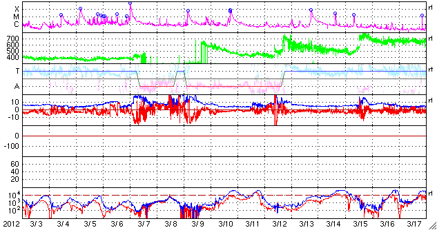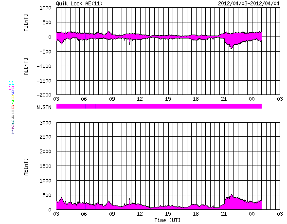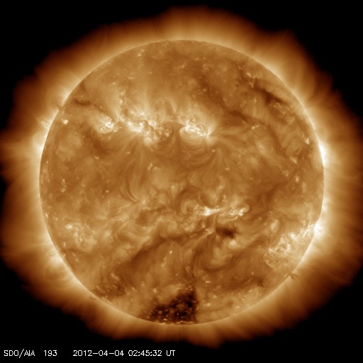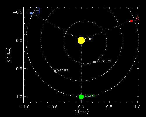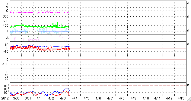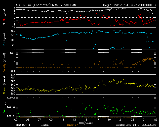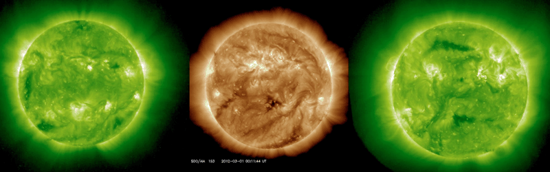 2012/ 4/ 4 11:51 更新 太陽風は低速の状態が続いています。太陽のフレアも静かです。 担当 篠原 太陽と太陽風は今日も穏やかで、 宇宙天気はのんびりした日が続いています。 気分転換に、現在のSTEREO衛星の位置を確認しましょう。 STEREO衛星は、AheadとBehindとよばれる2機の衛星が、 地球の左右に広がって行って、太陽を幅広く見渡しています。 その位置は次第に地球から離れて行くので、時々確認しておく必要があります。 現在の衛星の位置は、where is stereo?というページで見ることができます。 現在のSTEREO衛星は、どちらも太陽よりも向こう側に行っています。 Behind→地球→Ahead→Behindの角度は、120度、110度、130度となっていて、 ちょうど均等に3方向から太陽を見ている状態です。 SDO衛星を加えた3衛星から見た28日間の太陽コロナの様子を動画にしました。 (ちょっとたいへんでした・・・) すると、暗いコロナホールの筋や、明るく光る活動領域が、 次々と隣の衛星の視界に移って行く様子が見えます。 現在、太陽を360度全て、 それも比較的良い画像として見ることができているのです。 今後、STEREO衛星は更に地球から離れて行き、太陽の反対側に近づいて行きます。 太陽全体を見渡すことは今後もできますが、地球との角度が開いて行くので、 東西の端の領域は、次第に歪んで見にくくなるでしょう。 現在の太陽風は、速度は300km/秒から340km/秒ほどに少し上がっていますが、 低速の状態は続いています。 磁場強度は5nTと平均的な強さで、南北成分の南向きの傾向も続いています。 ただ、-2〜 -4nTと振れ幅はやや小さくなり、変動もしています。 太陽風の傾向が変わりつつあるのかもしれません。 これからコロナホールの影響がやって来るかもしれないと書きましたが、 まだその変化は見えていません。 太陽は、特にフレア活動もなく穏やかです。 X線の動画で見えていた変化は小さくなっているようで、 1450群、1452群の活動の強まりは起きていません。 ![]() STEREO Behind、Ahead各衛星と、太陽、地球の位置関係。 (c) STEREO (NASA) ![]() STEREO Behind、Ahead衛星とSDO衛星による3方向から見た28日間の太陽コロナ。 (c) STEREO (NASA)、SDO (NASA) ![]() SDO衛星のAIA193カメラによる太陽コロナの様子 (c) SDO (NASA) ![]() SDO衛星による太陽の可視光写真。マウスの矢印を写真に重ねると、黒点番号付きの写真に切り替わります。 (c) SDO (NASA) ![]() ACEが観測した太陽風の磁場(1番上の枠、白線は全体の強度、赤線は南北成分) および、太陽風の密度(3番目の橙線)、速度(4番目の黄線) (c) NOAA/SWPC ![]() リアルタイムAE指数 下段のAEグラフの値が高くなると、オーロラ活動が活発化しています。 (c) 京都大学, NICT ![]() 27日の太陽周期に合わせたデータプロット 太陽が同じ面を地球に向けていた27日前の変化から、今後を予想することができます。 (c) 作図:宇宙天気ニュース