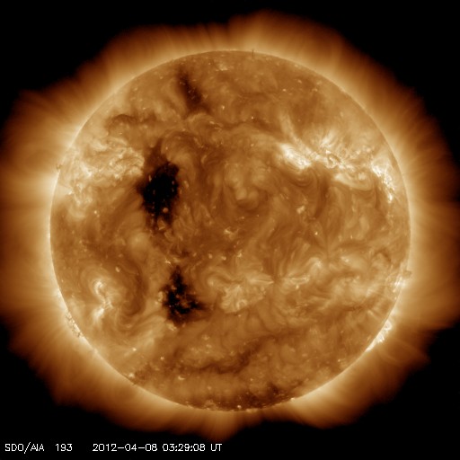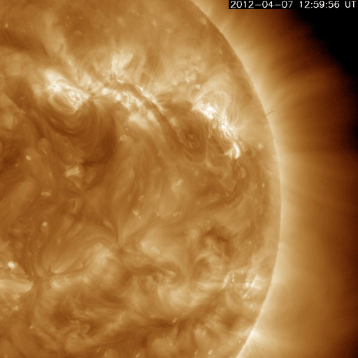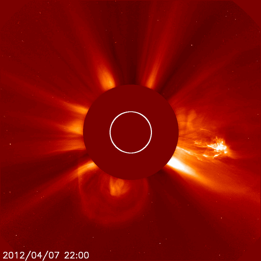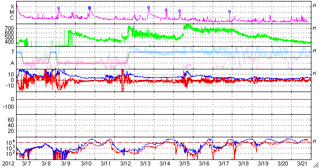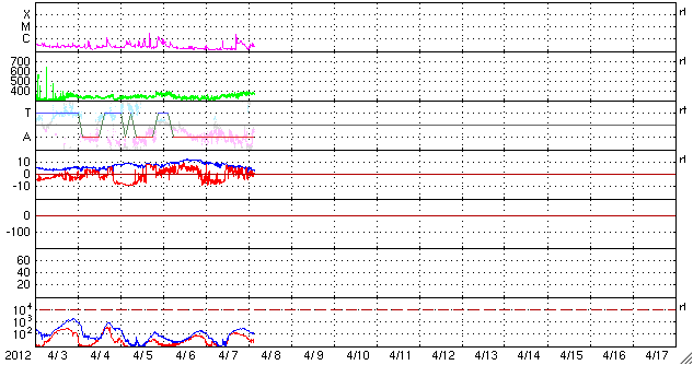 2012/ 4/ 8 12:44 更新 太陽でC2の小規模フレアが起きました。太陽風は低速の状態が続いています。 担当 篠原 太陽の西の端近くに見える1450黒点群の左側で、 C2.4の小規模フレアが、深夜、8日2時(世界時7日17時)に発生しました。 それに続くように、CMEの噴出が発生しています。 SDO衛星AIA193と、SOHO衛星LASCO C2、C3による動画を掲載します。 SDO衛星の動画では、 右下に向かって黒いガスが噴き出すのが良く見えています。 これがSOHO衛星の動画に繋がって、 太陽から右に向かって噴き出す白いガスになるのです。 地球からは横に向かう噴出なので、影響はありません。 SOHO衛星の動画では、下に向かうCMEも見えますが、 これは太陽の裏側の現象です。 太陽は、活動的な領域は、1450黒点群付近しかなく、 この後も穏やかに推移しそうです。 太陽風は、速度が少し上がって、 370〜380km/秒と平均的なレベルにやや近づいています。 上がり方はゆっくりで、これ以上の大きな上昇はないでしょう。 一方、磁場強度は、昨日は10nTくらいに強まっていましたが、 今日にかけてゆっくりと下がり、現在は4nTとやや弱まった値です。 磁場の南北成分は、昨夜、7日20時(世界時7日11時)頃までは南向きが続きましたが、 以降、北向きに切り替わり、今朝からは0nT付近で変化しています。 このため、磁気圏の活動も昨夜までは AE指数で500〜800nTの中規模の変化が続きましたが、 以降は穏やかになっています。 SDO衛星AIA193を見ると、コロナホールは真ん中に近づいています。 この領域の影響が及び始める5日後くらいまでは、 太陽風は穏やかに推移しそうです。 ![]() SDO衛星のAIA193カメラによる、C2.4の小規模フレアに続くCMEの噴出。 (c) SDO (NASA)、 (動画加工 : 宇宙天気ニュース) ![]() SOHO衛星LASCO C2、C3カメラによるCMEの様子。 (c) SOHO (ESA & NASA)、 (動画加工 : 宇宙天気ニュース) ![]() SDO衛星のAIA193カメラによる太陽コロナの様子 (c) SDO (NASA) ![]() SDO衛星による太陽の可視光写真。マウスの矢印を写真に重ねると、黒点番号付きの写真に切り替わります。 (c) SDO (NASA) ![]() GOES衛星の太陽X線データ (c) NOAA/SWPC ![]() ACEが観測した太陽風の磁場(1番上の枠、白線は全体の強度、赤線は南北成分) および、太陽風の密度(3番目の橙線)、速度(4番目の黄線) (c) NOAA/SWPC ![]() リアルタイムAE指数 下段のAEグラフの値が高くなると、オーロラ活動が活発化しています。 (c) 京都大学, NICT ![]() 27日の太陽周期に合わせたデータプロット 太陽が同じ面を地球に向けていた27日前の変化から、今後を予想することができます。 (c) 作図:宇宙天気ニュース