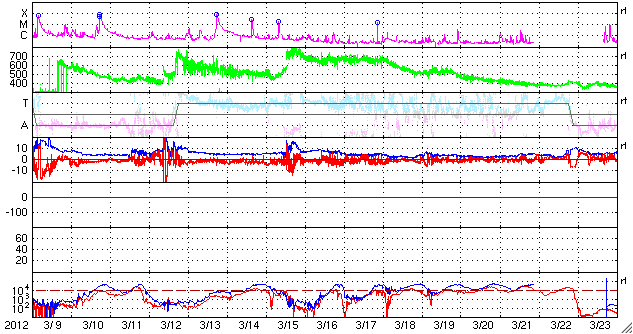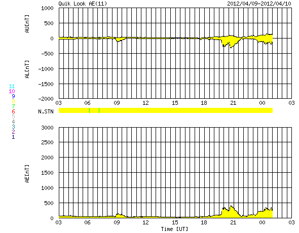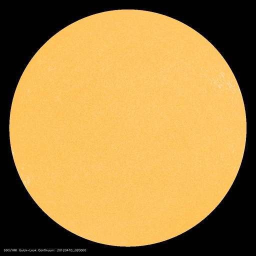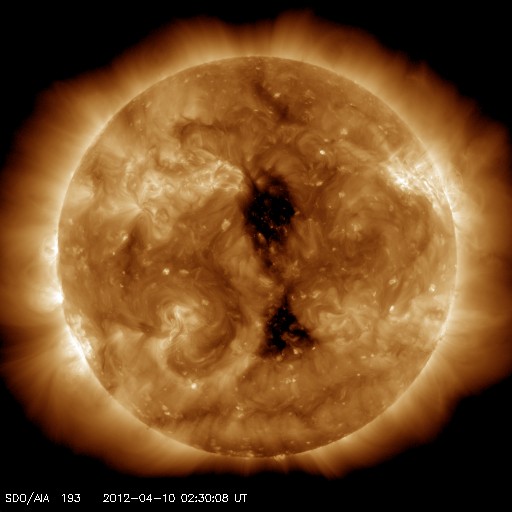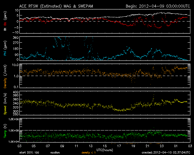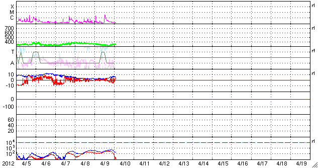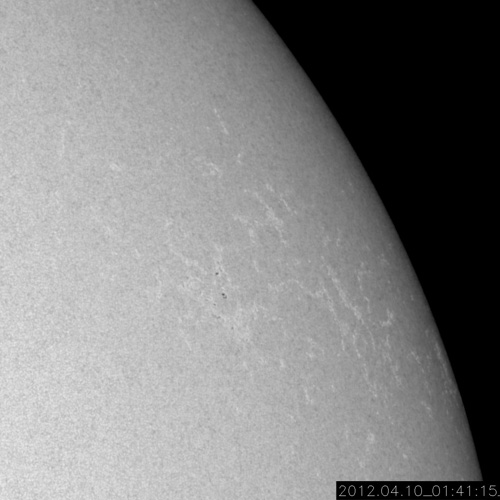 2012/ 4/10 11:37 更新 昨夜、C3.9の小規模フレアが発生しました。太陽風は低速で、磁気圏も穏やかです。 担当 篠原 今日の太陽面は、掲載の写真では黒点が見えなくなっています。 SDO衛星のページで、もっと大きな写真を見ると、 北西の端近くに小さな黒点が残っているようです。 切り出して掲載します。 この大きさだと、SIDCの記録では今日の黒点数は0になっているかもしれません。 その太陽では、昨夜、9日21時(世界時9日12時)に、 北西の端近くでC3.9の小規模フレアが発生しました。 久しぶりにフレア速報のメールが飛び込んできました。 このフレアに関係してCMEも発生していますが、 地球に対して横方向に噴き出しているので影響はありません。 太陽風は、速度は340km/秒と低速の状態が続いています。 磁場強度は、昨夜からわずかに上がり、現在は6nT前後と平均程度の強さです。 太陽風は、明日くらいまでは穏やかに推移するでしょう。 磁気圏では、AE指数で300nTくらいの小規模の変化が見られる程度です。 SDO衛星AIA193の太陽コロナ写真では、 南北に広がるコロナホールが、ちょうど太陽の中心に来ています。 今、ここから地球に向かって速度の高い太陽風が吹き出していると考えられます。 すると、3日後の13日頃には最も影響が強まっていそうです。 どの程度の太陽風の変化がやって来るでしょうか。