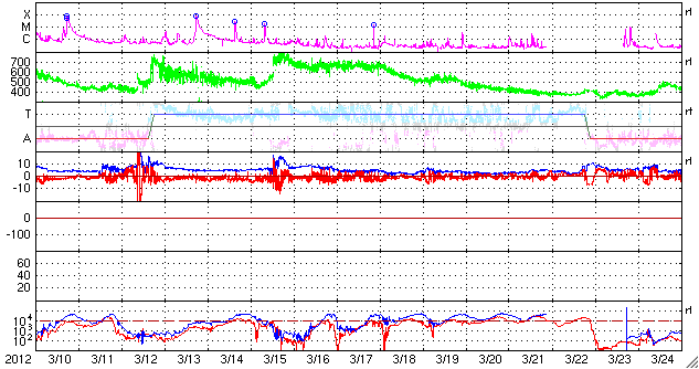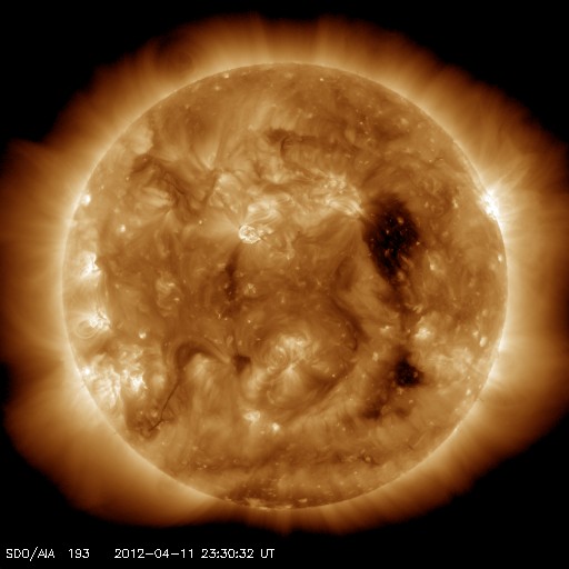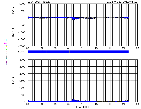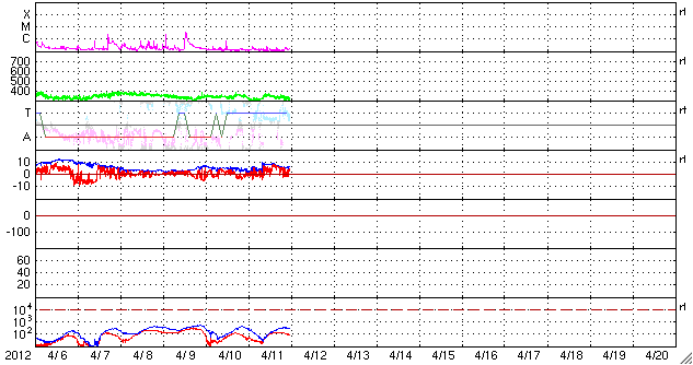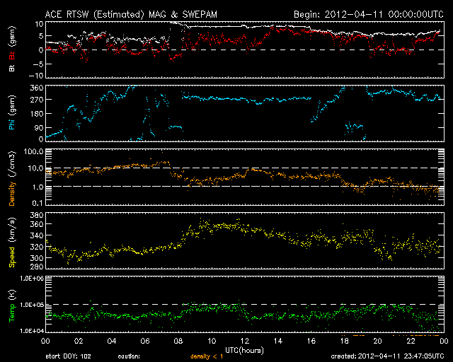 2012/ 4/12 08:48 更新 太陽風は低速で、磁気圏も静かです。コロナホールによる高速太陽風が始まる可能性があります。 担当 篠原 太陽風は、300km/秒台前半の低速の風が続いています。 昨日午後、11日17時(世界時11日8時)に、 磁場強度が3nTから10nTに急に強まる変化が見られましたが、 速度は320km/秒から350km/秒にわずかに上がっただけでした。 もしかすると、8日のニュースでお知らせしたCMEの影響が 弱いながらもやって来たのかもしれません。 現在の太陽風は、速度は320km/秒、磁場強度は6nTと 昨日までとほとんど変化はありません。 一方、SDO衛星AIA193の太陽コロナを見ると、 コロナホールは太陽の西側に半分ほど進み、 地球へ影響が及び始める目安の位置に達しています。 今日、明日くらいに太陽風に変化が始まる可能性があります。 現在の磁気圏はとても静かで、AE指数はほとんど変化していません。 今後、コロナホールによる太陽風の乱れが到来すると、 磁場の振れ具合(南向きに強まるなど)によっては、 オーロラ活動が活発化する可能性があります. 太陽は、中心部に現われた黒点に1455黒点群という番号が付きました。 新しい領域だけあって、小さいフレアの活動が活発に見えています。 今後、黒点が成長するのかどうか注目してください。