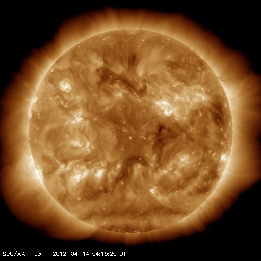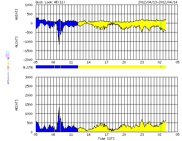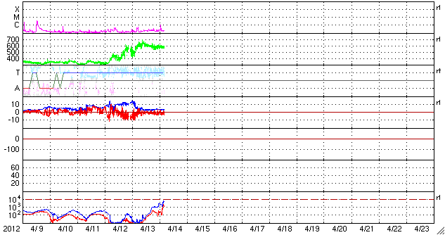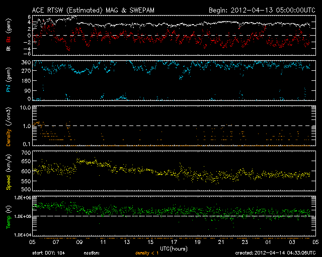 2012/ 4/14 13:35 更新 太陽風の速度は600km/秒台に上がりました。磁気圏の活動も続いています。 担当 篠原 昨日のニュースの後、太陽風の速度はもう一段上がって600km/秒台に入り、 13日18時(世界時13日9時)には、短時間ですが650km/秒にまで達しました。 この間、磁場強度は3〜4nTと弱めの状態で安定しています。 南北成分は、-2nT前後の弱い南向きが続いています。 このため、磁気圏も小規模の変動がずっと続いています。 AE指数のグラフは300〜500nT程度の小幅の変化が連続しています。 現在の太陽風の速度は、580km/秒とやや下がり気味です。 コロナホールの分布から、高速風は長い時間は続かないと思われます。 明日には下がり始めるかもしれません。 その後は、静かな太陽風がしばらく続くでしょう。 今回の太陽風の乱れの影響で、放射線帯の高エネルギー電子がやや増加しています。 明日、更に強まるようだと、10000にまで達するかもしれません。 太陽は、1455黒点群でB9.8とCクラスぎりぎりの小さなフレアが発生している程度で、 全体的に穏やかです。 黒点も、北東に1457黒点群がもうひとつ見える程度です。 太陽は1ヶ月近く穏やかな状態が続いています。 ![]() SDO衛星のAIA193カメラによる太陽コロナの様子 (c) SDO (NASA) ![]() SDO衛星による太陽の可視光写真。マウスの矢印を写真に重ねると、黒点番号付きの写真に切り替わります。 (c) SDO (NASA) ![]() ACEが観測した太陽風の磁場(1番上の枠、白線は全体の強度、赤線は南北成分) および、太陽風の密度(3番目の橙線)、速度(4番目の黄線) (c) NOAA/SWPC ![]() リアルタイムAE指数 下段のAEグラフの値が高くなると、オーロラ活動が活発化しています。 (c) 京都大学, NICT ![]() 27日の太陽周期に合わせたデータプロット 太陽が同じ面を地球に向けていた27日前の変化から、今後を予想することができます。 (c) 作図:宇宙天気ニュース