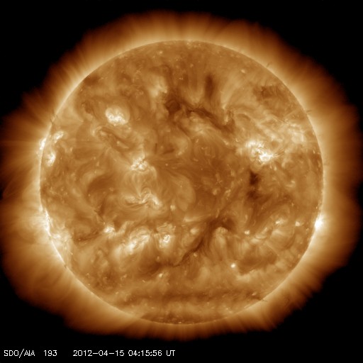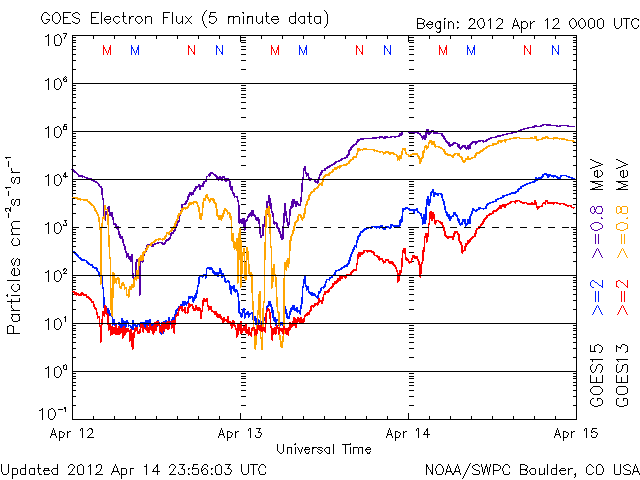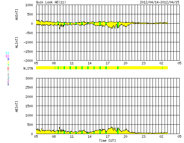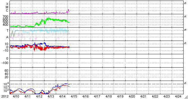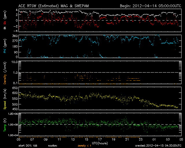 2012/ 4/15 13:32 更新 太陽風の速度はゆっくりと低下しています。太陽の東端でC2.7のフレアが発生しました。 担当 篠原 太陽風の速度は、ゆっくりと下がっています。 昨日のニュースの頃は580km/秒でしたが、その後じわじわと下がり続け、 現在は490km/秒と、ちょうど500km/秒台を割ったところです。 太陽風は、明日には平均的な速度に戻りそうです。 太陽風の磁場強度は、2nTと弱くなっています。 南北成分は、0nTの線をはさんで南北に小さく変化していますが、 磁気圏への影響はだいぶ小さくなり、 AE指数のグラフは小幅の変化が見られた程度です。 速度が下がってきたこともあり、磁気圏の活動は今後も穏やかに推移するでしょう。 放射線帯の高エネルギー電子は、 GOES15衛星の青線が10000に達しています。 やや強まった状態になっています。 太陽では、東端から新しい黒点群が姿を現しています。 北半球側から1458黒点群、南半球側から1459黒点群です。 また、1458群の向こう側には別の活動領域があるようで、 そこで、C2.7の小規模フレアが15日10時(世界時15日1時)に発生しています。 今後どんな黒点群が顔を出すのか、注目してください。
