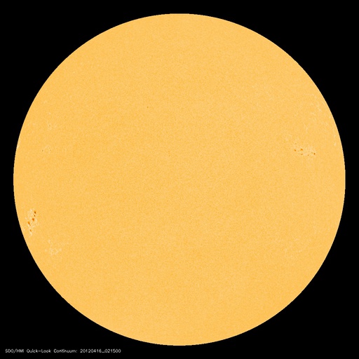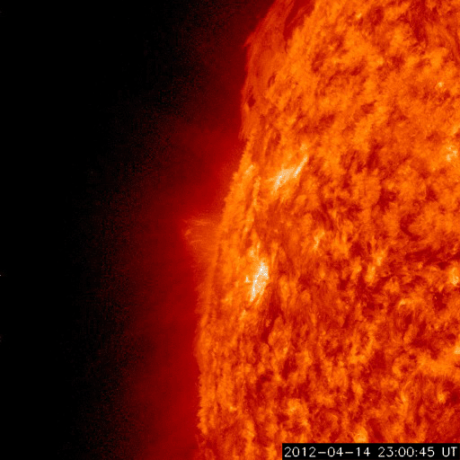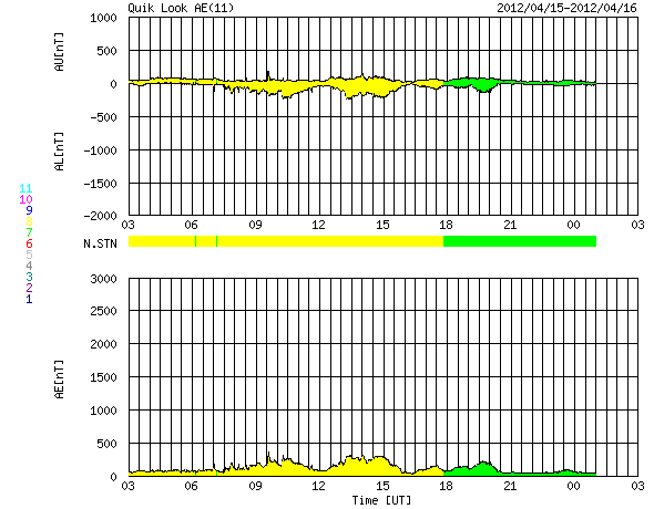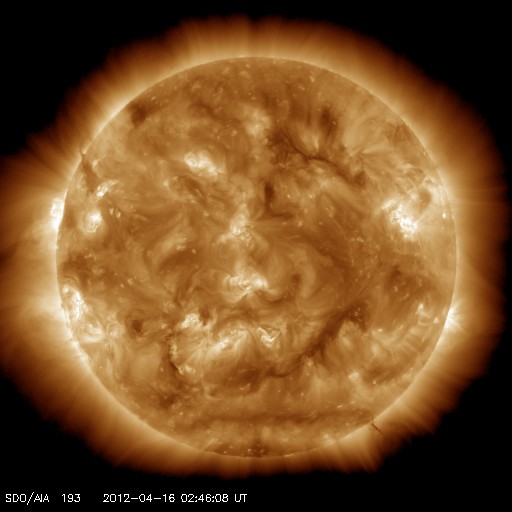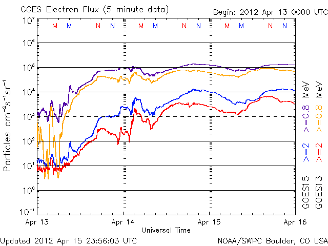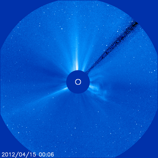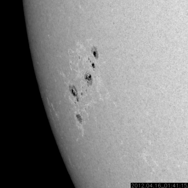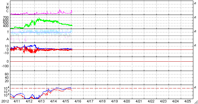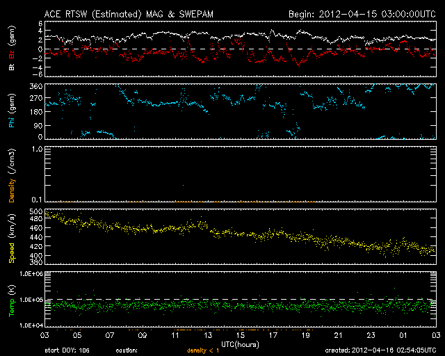 2012/ 4/16 11:54 更新 太陽風の速度は平均的な状態に戻りました。太陽の東側から大きな黒点が上がってきました。 担当 篠原 太陽風の速度は、昨日のニュース以降も下がり続け、 ちょうど、410km/秒と平均的な速さに戻ったところです。 地球は、高速太陽風の領域を通り過ぎました。 太陽風の磁場強度は、2〜3nTと弱まった状態が続いています。 南北成分は比較的南寄りに推移しているのですが、 振れ幅が小さいことと、速度が下がってしまったため、 磁気圏の変化は小さく、AE指数は200〜300nTの小幅の変化が見える程度です。 この後も、太陽風は穏やかな風が続き、 磁気圏のオーロラ活動は弱いものとなりそうです。 放射線帯の高エネルギー電子は、今日も10000の線を超えています。 太陽風が落ち着いたので、今後の減少はゆっくりとなるでしょう。 高まった状態がしばらく続きそうです。 太陽は、南半球側の東端から上ってきた1459黒点群の全体の姿が見えてきました。 大きな黒点が5つほど連なって、迫力のある姿です。 SDO衛星の可視光カメラによる、拡大写真を掲載します。 また、昨日、太陽の北東端で発生したCMEに関係する動画を掲載します。 SDO衛星AIA304による撮影です。 フレアに伴って、大きなコロナの帯が太陽から噴き上がっています。 その後の様子を、SOHO衛星LASCO C3カメラの動画で紹介します。 太陽の東に向かって、CMEの白いガスが噴き出しています。 地球に対しては横方向なので、影響はないでしょう。 この領域はまだこちら側に姿を現していませんが、 今朝、16日9時半(世界時16日0時半)に、C1.8の小規模フレアを起こしています。 今後の活動に注目して下さい。
