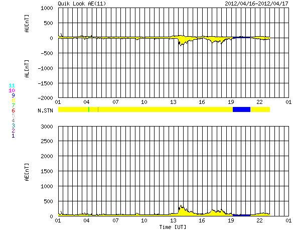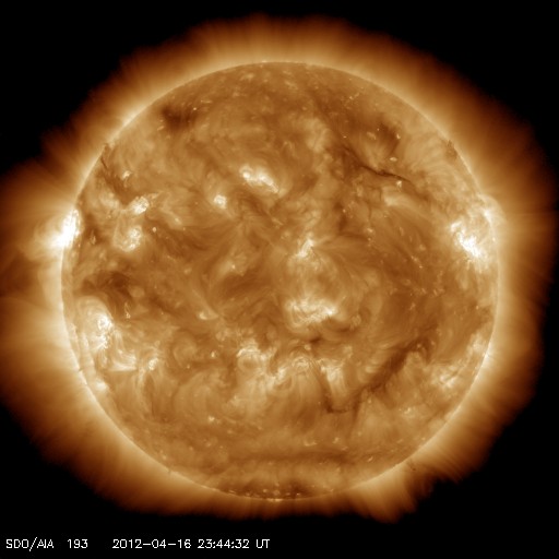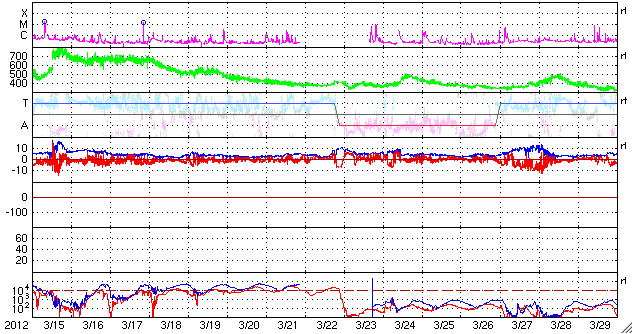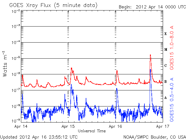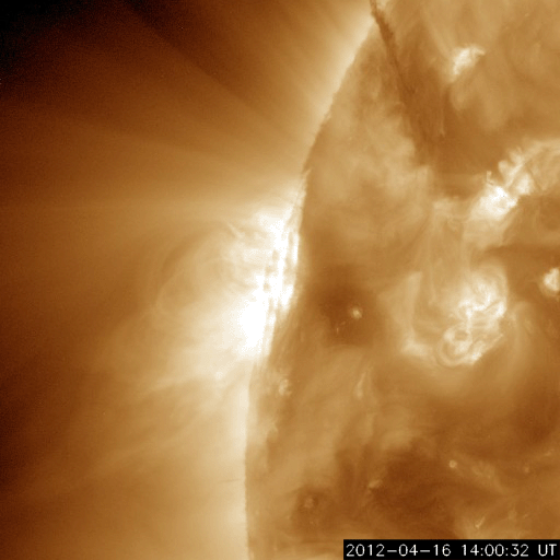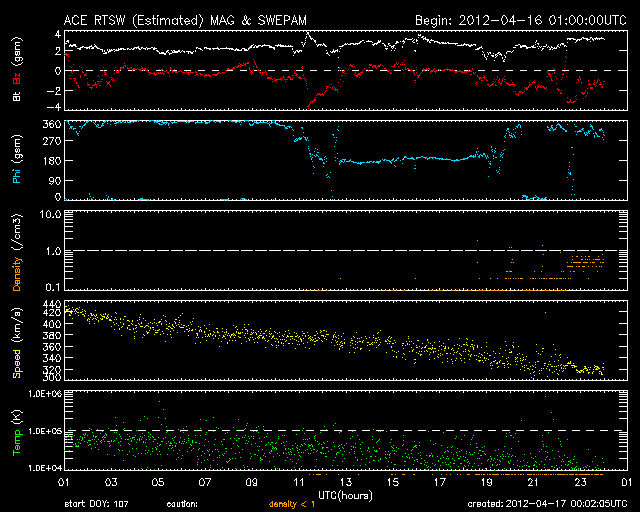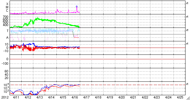 2012/ 4/17 09:02 更新 太陽の東端でM1.7の中規模フレアが発生しました。太陽風は低速風になっています。 担当 篠原 17日2時半(世界時16日17時半)に、太陽の東端でM1.7の中規模フレアが発生しました。 深夜に、一週間ぶりの速報メールが流れてきました。 SDO衛星AIA193と304による、その頃の動画を掲載します。 フレアの規模以上に印象的な激しいコロナの噴出が発生しています。 昨日の動画に似ていますが、違うイベントです。 SOHO衛星のLASCOカメラの写真がまだ更新されていないので、 CMEの様子はまだ分かりません。 地球からは横方向に噴き出しているので、大きな影響はないでしょう。 SDO衛星によると、この活動領域は既にこちら側に回ってきているようですが、 可視光写真を見ると、大きな黒点がある様には見えません。 この領域の、今後の活動に注目してください。 一方、南東の1459黒点群は、黒点の数は多いですが、 GOES衛星のX線カメラで見ると、あまり活動的ではないようです。 太陽風は、引き続き速度が低下して、現在は320k/秒とかなり遅くなっています。 磁場強度も3nT前後と弱めの状態で、太陽風はだいぶ穏やかです。 このため、磁気圏も静穏で、 AE指数は、小さな変化が見られる程度です。 太陽にはコロナホールも見られず、 太陽風はしばらく穏やかな状態が続きそうです。 ただし、新しく現れた活動領域でCMEが発生すると、 今後は地球にも影響が及ぶでしょう。