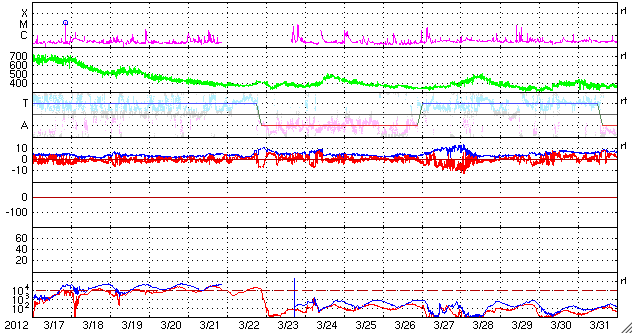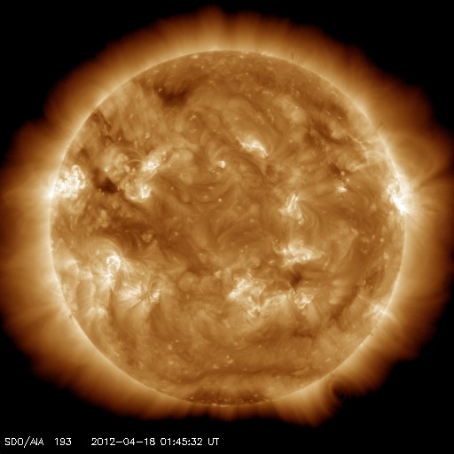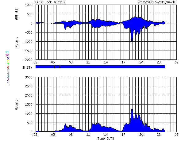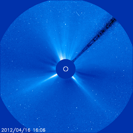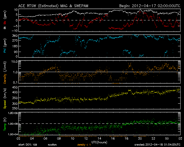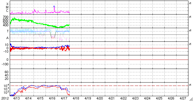 2012/ 4/18 10:54 更新 太陽に黒点が増えています。太陽風磁場が南向きに大きく振れて、磁気圏の活動が強まりました。 担当 篠原 昨日紹介したフレアの後のCMEの様子を、 SOHO衛星LASCO C3カメラの動画で紹介します。 こちらの写真によると、特に濃いCMEとはなっていませんでした。 地球からは横に向かっているので、影響はないでしょう。 太陽面は、南東の大きな1459黒点群に続いて、 1460、1461、1462群と黒点が増えてにぎやかになっています。 GOES衛星のX線カメラの動画を見ていても、 小さな変動があちこちで起きています。 今後活動が強まるのかどうか、注目してください。 太陽風は、磁場強度が3nTから、一時10nT近くにまで強まりました。 現在も7nTとやや強まったままです。 速度もやや上がって、400km/秒と平均的な速さになっています。 この磁場の変動に伴って、南北成分が -5nTを超えるくらいに南向きに度々強まり、 活発なオーロラ活動を起こしています。 AE指数では、1000nTを超える大きな変化も起きています。 残念なことに、昭和基地の全天カメラの更新は止まっていました。 観測されていればきれいなオーロラが見えたのではないでしょうか。 太陽風は、この後も基本的には穏やかな状態が続くと思います。 その中で、今回のように磁場の南向きが強まって、 オーロラ活動が強まったりすることもあります。 今回の擾乱の影響で、放射線帯の高エネルギー電子は大きく減少しました。 ![]() SOHO衛星LASCO C3による、太陽の東側へ噴出したCME。 (c) SOHO (ESA & NASA)、 (動画加工 : 宇宙天気ニュース) ![]() SDO衛星のAIA193カメラによる太陽コロナの様子 (c) SDO (NASA) ![]() SDO衛星による太陽の可視光写真。マウスの矢印を写真に重ねると、黒点番号付きの写真に切り替わります。 (c) SDO (NASA) ![]() GOES衛星の太陽X線データ (c) NOAA/SWPC ![]() ACEが観測した太陽風の磁場(1番上の枠、白線は全体の強度、赤線は南北成分) および、太陽風の密度(3番目の橙線)、速度(4番目の黄線) (c) NOAA/SWPC ![]() リアルタイムAE指数 下段のAEグラフの値が高くなると、オーロラ活動が活発化しています。 (c) 京都大学, NICT ![]() 27日の太陽周期に合わせたデータプロット 太陽が同じ面を地球に向けていた27日前の変化から、今後を予想することができます。 (c) 作図:宇宙天気ニュース