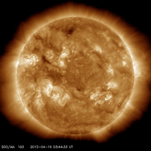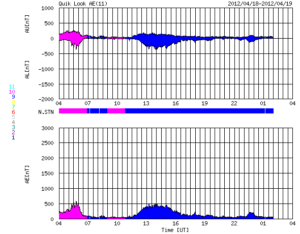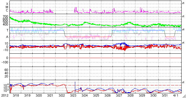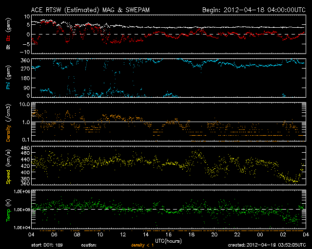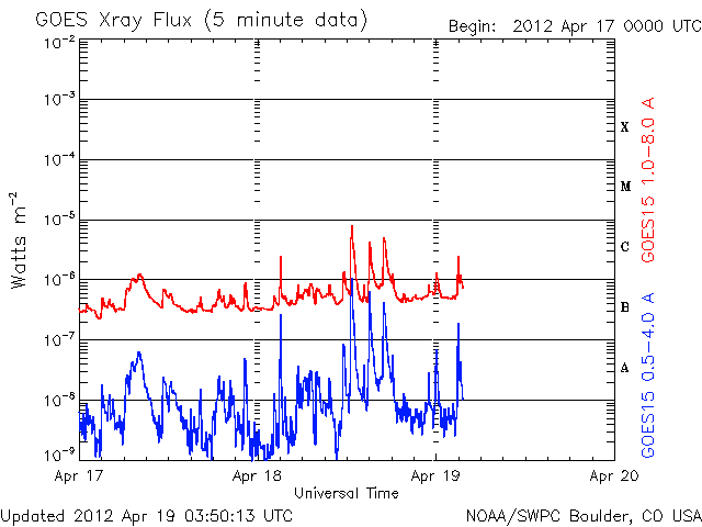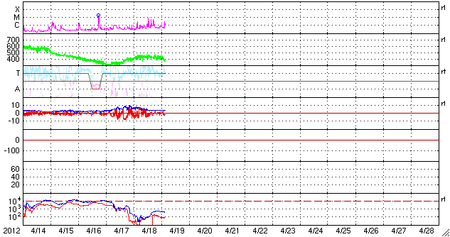 2012/ 4/19 12:53 更新 Cクラスのフレア活動が活発に起きています。太陽風は平均的な状態です。 担当 篠原 太陽の南西に1463黒点群が出現しました。 昨日の午後から活発な活動を起こしています。 18日21時(世界時18日12時)に、C8.9、 19日0時(世界時18日15時)に、C5.9、 19日2時(世界時18日17時)に、C5.3と、 大きめのCクラス小規模フレアが次々に発生しました。 GOES衛星のX線カメラの動画を掲載します。 右下でちかちかと輝いているのが1463黒点群です。 今後の活動に注目してください。 太陽風は、430km/秒と平均的な速度が続いていましたが、 最新の値は380km/秒とやや下がっています。 磁場強度は5nTから4nTと平均的な強さですが、やや下がり気味です。 AE指数は500nTくらいの中規模の変化が発生しています。 ACEのデータと比較すると、 磁場が南向きに振れている時間帯に発生していることが分かります。 太陽風はこの後も、穏やかな状態が続くでしょう。 1459、1460黒点群が太陽の中心に近づいているので、 フレア、CMEなどが発生すると、 突発的な擾乱が地球にやって来る可能性があります。 ![]() GOES-15のX線カメラによる、1463黒点群の活発な活動。 (c) NOAA/SWPC 、(動画加工 : 宇宙天気ニュース) ![]() SDO衛星のAIA193カメラによる太陽コロナの様子 (c) SDO (NASA) ![]() SDO衛星による太陽の可視光写真。マウスの矢印を写真に重ねると、黒点番号付きの写真に切り替わります。 (c) SDO (NASA) ![]() GOES衛星の太陽X線データ (c) NOAA/SWPC ![]() ACEが観測した太陽風の磁場(1番上の枠、白線は全体の強度、赤線は南北成分) および、太陽風の密度(3番目の橙線)、速度(4番目の黄線) (c) NOAA/SWPC ![]() リアルタイムAE指数 下段のAEグラフの値が高くなると、オーロラ活動が活発化しています。 (c) 京都大学, NICT ![]() 27日の太陽周期に合わせたデータプロット 太陽が同じ面を地球に向けていた27日前の変化から、今後を予想することができます。 (c) 作図:宇宙天気ニュース
