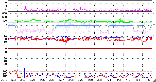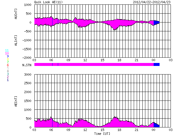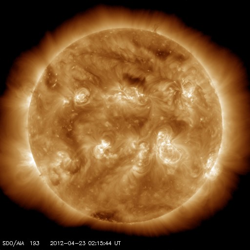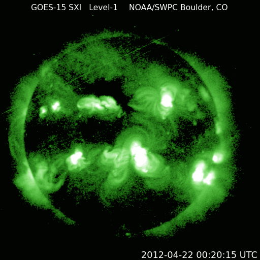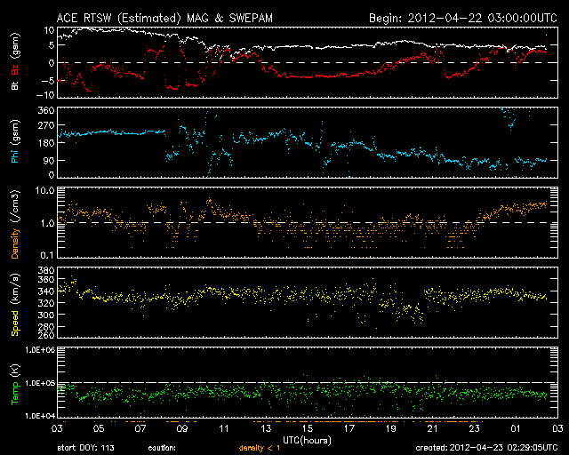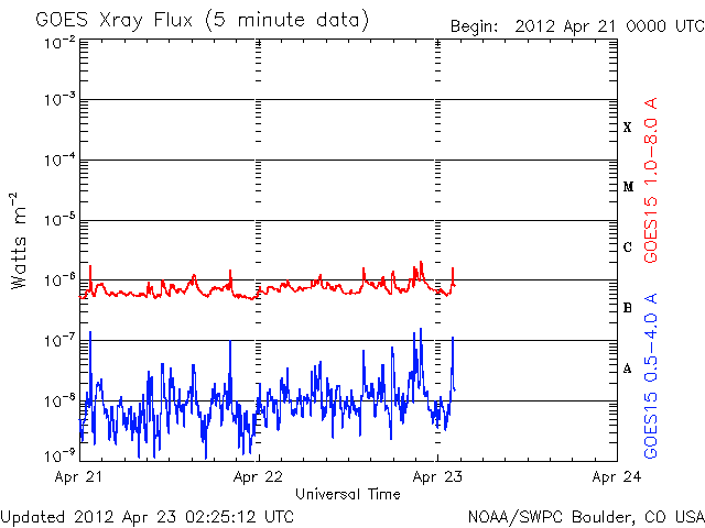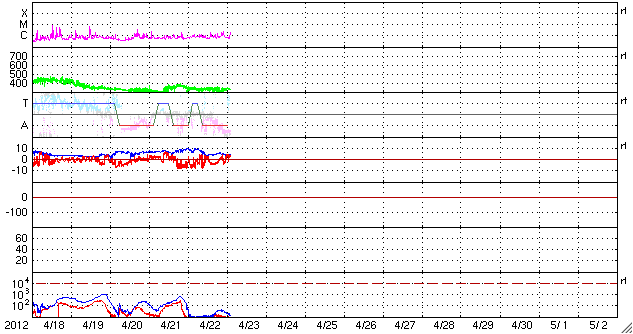 2012/ 4/23 11:30 更新 C1程度のフレアが続いています。太陽風は低速ですが、南向き磁場の影響で磁気圏はやや活動的です。 担当 篠原 太陽では、1459黒点群でC1.2、1465黒点群でC1.3、C1.8、C1.7など、 C1前後と規模は小さいですがフレアの発生が続いています。 GOES衛星のX線カメラの動画を見て下さい。 この2つの群に限らず、あちこちで小さな活動が発生しています。 Mクラスの中規模フレアが発生する可能性も含めて、 引き続き注目して下さい。 また、黒点が比較的大きくなっているので、 肉眼で見つけることができるかもしれません。 日食用の太陽メガネを使って挑戦してはいかがでしょうか。 私は残念ながら直接は見つけることができませんでした。 3倍程に拡大すると(太陽専用品を使っています)、 1459、1465群が簡単に見えました。 太陽風は、330km/秒と低速風が安定して続いています。 磁場強度の10nT近い強まりは終わり、昨夜以降は5nTと平均的な値に戻っています。 磁場の南北成分は、ゆっくりと大きく南に振れる傾向が続いていて、 昨日のニュース以降も、AE指数は500nT前後の中規模の変化が続いています。 昭和基地の全天カメラで、その活動の様子を見ることができます。 太陽風はこの後も低速風が続きそうです。 27日周期の図によると、今日くらいに再びセクターの切り替わりが到来しそうです。 その時に、太陽風の磁場が強まるなどの変化がやって来るかもしれません。 磁場が大きく南向きに振れると、活発なオーロラ活動も期待できます。 ![]() GOES-15のX線カメラによる、太陽の活発なフレア活動。 (c) NOAA/SWPC 、(動画加工 : 宇宙天気ニュース) ![]() SDO衛星のAIA193カメラによる太陽コロナの様子 (c) SDO (NASA) ![]() SDO衛星による太陽の可視光写真。マウスの矢印を写真に重ねると、黒点番号付きの写真に切り替わります。 (c) SDO (NASA) ![]() GOES衛星の太陽X線データ (c) NOAA/SWPC ![]() ACEが観測した太陽風の磁場(1番上の枠、白線は全体の強度、赤線は南北成分) および、太陽風の密度(3番目の橙線)、速度(4番目の黄線) (c) NOAA/SWPC ![]() リアルタイムAE指数 下段のAEグラフの値が高くなると、オーロラ活動が活発化しています。 (c) 京都大学, NICT ![]() 27日の太陽周期に合わせたデータプロット 太陽が同じ面を地球に向けていた27日前の変化から、今後を予想することができます。 (c) 作図:宇宙天気ニュース