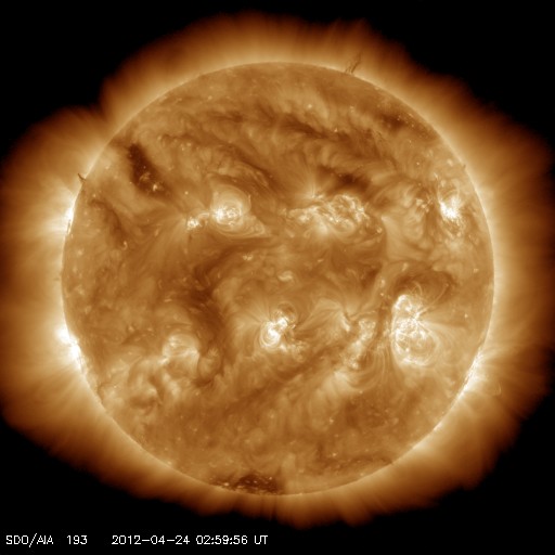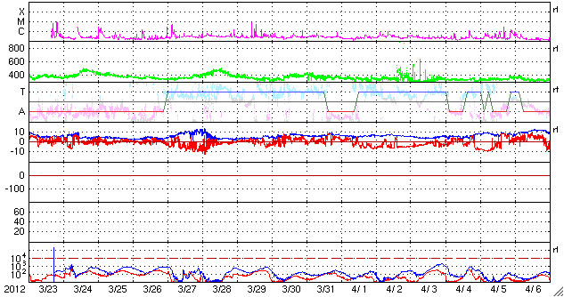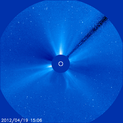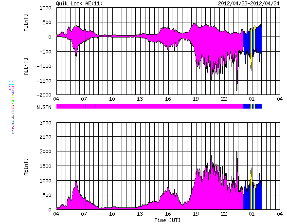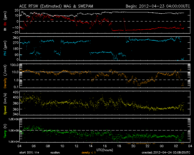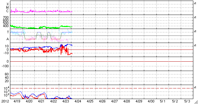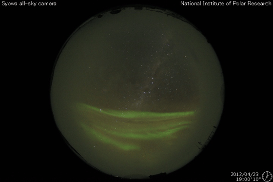 2012/ 4/24 12:08 更新 CMEの影響で太陽風の磁場が強い南向きになり、激しい磁気圏活動を起こしています。 担当 篠原 昨日の昼、23日11時半(世界時23日2時半)に、太陽風の強まりが発生しました。 速度が330km/秒から400km/秒に上昇し、 プラズマの密度は、3個/cm^3から20個/cm^3程度に増加、 磁場強度も5nTから15nTくらいに強まりました。 NOAA/SWPCのレポートによると、 19日に発生したCMEの到来だと考えられる様です。 Spaceweather.comの4月21日の記事で紹介されている 動画をご覧ください。 18日、19日頃に、地球(右寄りの黄色の丸)から見て太陽(中心の白丸)の両端で発生したCMEが、 22日、23日頃に地球に到達しています。 19日のCMEの様子を、SOHO衛星ALSCO C3の動画で紹介します。 主に南東(左下)に向かっていますが、その一部が地球方向にも飛んできたのでしょう。 太陽風の乱れの到来直後に、磁場が-10nTと強く南を向きましたが、 1時間ほどで北向きに切り替わり、 磁気圏の乱れは一時的な変化で終わりました(AE指数参照)。 しかし、半日ほど経過した24日2時(世界時23日17時)に、 磁場の南北成分が急に -15nTという強い南向きに変わりました。 この影響で、磁気圏の活動度が一気に強まり、 AE指数のグラフは1000〜1800nTに達する激しい変動が現在まで続いています。 曇っていますが、昭和基地のオーロラの様子を動画で紹介します。 雲越しに、空が明るく輝いている様子が分かります。 Dst指数(京都大学WDC)の速報値によると、 Dst指数は -101nTにまで下がっていて(下がるほど変化が激しい)、 中規模の磁気嵐が発生しています。 太陽風磁場の強い南向きは、ゆっくりと減少していますが、 現在も-10nTと強まった状態が続いています。 この後もしばらく、活発な磁気圏活動が続きそうです。 一方、太陽では1461黒点群で、C1.0、C2.0の小規模フレアが発生し、 その他の黒点群も小さな活動を続けています。 黒点としての発達は見られず、活動が特に強まることはなさそうです。 Cクラスから、Mクラスに達するフレアは発生するかもしれませんが、 今回の太陽活動の強まりは、この程度の様です。 ![]() SOHO衛星LASCO C3による、19日に太陽の南東側へ噴出したCME(4日前の現象です)。 (c) SOHO (ESA & NASA)、 (動画加工 : 宇宙天気ニュース) ![]() 南極の昭和基地で全天カメラにより撮影された、世界時23日19時のオーロラ。 (c) 国立極地研究所、(動画加工 : 宇宙天気ニュース) ![]() Dst指数(速報値)は、は -101nTまで下がって(強まって)います。 (c) 京都大学WDC ![]() SDO衛星のAIA193カメラによる太陽コロナの様子 (c) SDO (NASA) ![]() SDO衛星による太陽の可視光写真。マウスの矢印を写真に重ねると、黒点番号付きの写真に切り替わります。 (c) SDO (NASA) ![]() ACEが観測した太陽風の磁場(1番上の枠、白線は全体の強度、赤線は南北成分) および、太陽風の密度(3番目の橙線)、速度(4番目の黄線) (c) NOAA/SWPC ![]() リアルタイムAE指数 下段のAEグラフの値が高くなると、オーロラ活動が活発化しています。 (c) 京都大学, NICT ![]() 27日の太陽周期に合わせたデータプロット 太陽が同じ面を地球に向けていた27日前の変化から、今後を予想することができます。 (c) 作図:宇宙天気ニュース