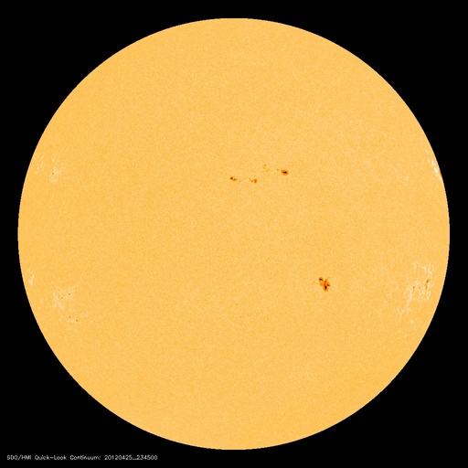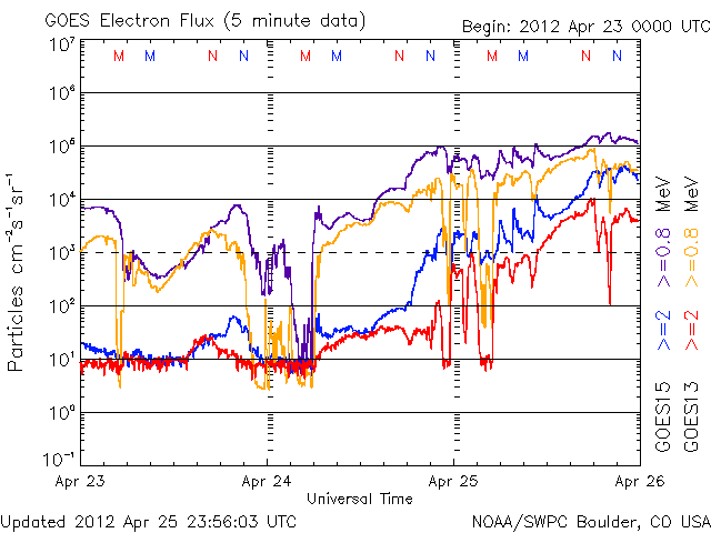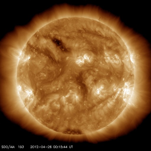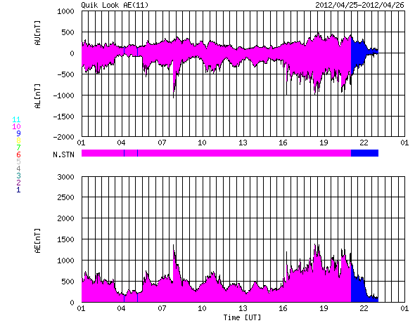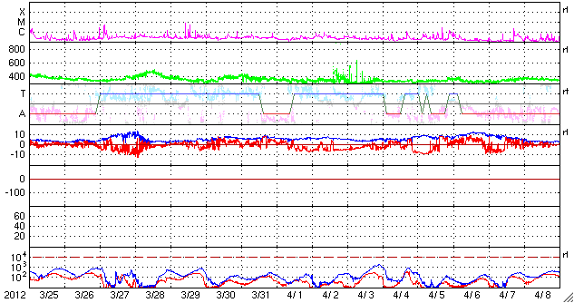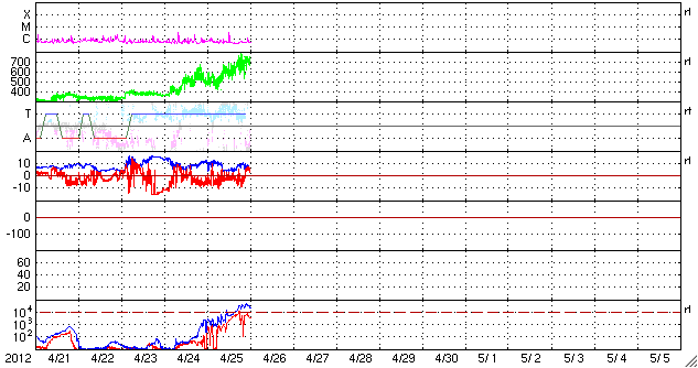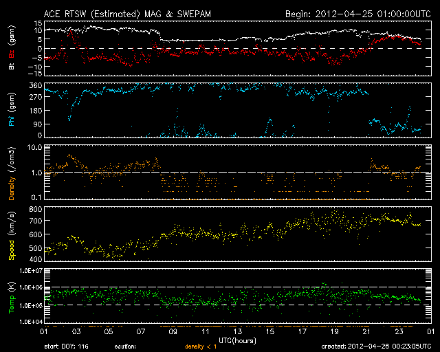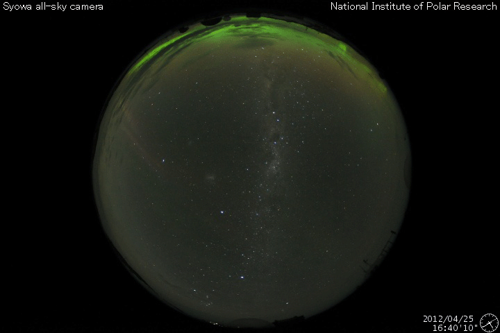 2012/ 4/26 09:23 更新 太陽風の速度は700km/秒まで上昇しています。活発なオーロラ活動も続いています。 担当 篠原 太陽風の速度が更に高まっています。 昨日のニュース以降ゆっくりと上がり続け、 今朝には700km/秒にまで達しました。 この辺りで上昇は止まりそうな様子ですが、かなり高い速度になっています。 NOAA/SWPCの報告では、コロナホールによる高速風とのことですが、 ここまで速度が上がるほどの目立ったコロナホールは見えなかったのですが、 興味深いところです。 27日周期の図を見ても、前周期はほとんど速度の変化がなかった期間です。 どこまで継続するのかなど、引き続き注目してください。 太陽風の磁場強度も、5〜10nTの間をゆっくりと変化していて、 強めの傾向が続いていました。 現在は5nTになっていますが、まだ平均的な強度です。 磁場の南北成分は、振れ幅は特に大きくはありませんが、 南寄りの傾向が続いています。 そのため、磁気圏の活動は活発で、 AE指数のグラフは、500nTから最大1000〜1300nTの変動が1日中続いています。 今日も南極・昭和基地の全天カメラの動画を紹介します。 後半は曇ってしまいますが、雲越しに明るいオーロラの活動をご覧ください。 この後も、高速風の継続とともに、オーロラの活動も注目してください。 太陽風の変動が続き、放射線帯の高エネルギー電子は一段と増加しています。 今日のグラフは10,000を超えて、警戒レベルに達しています。 高速風が続いていることから、更に上昇する可能性もあります。 太陽では、25日21時(世界時25日12時)に、 西の端の1460黒点群でC3.7の小規模フレアが発生しました。 しかし、目立った活動はこの程度で、 東から上がってきた1467、1469黒点群は、どちらもあまり勢いはないようです。 太陽のフレア活動は穏やかになるのかもしれません。