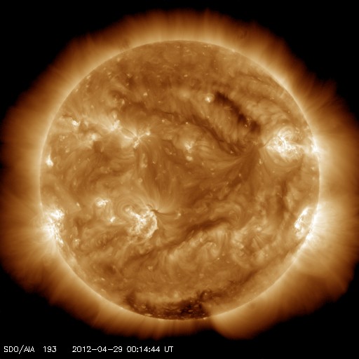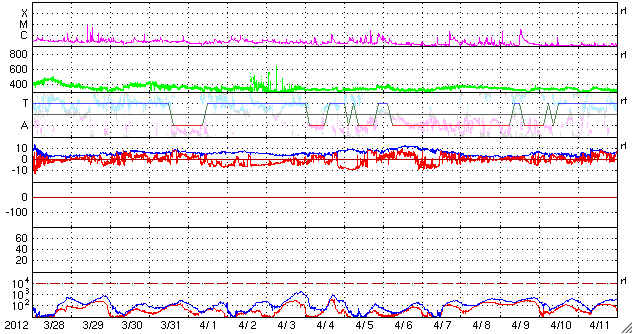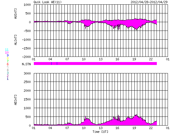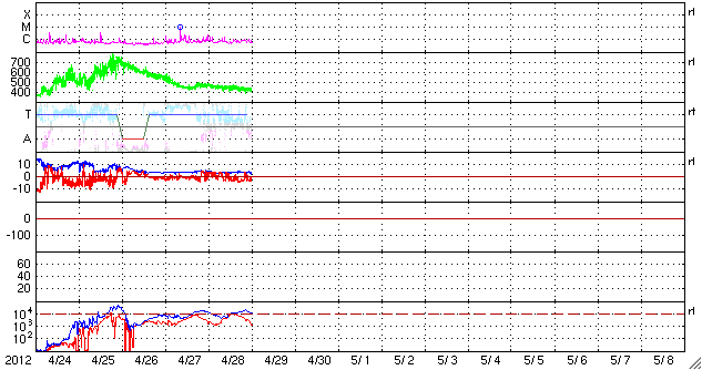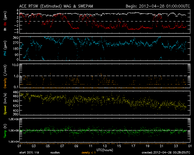 2012/ 4/29 09:28 更新 太陽風は平均的な速度に下がりました。太陽ではCクラスのフレアが発生しています。 担当 篠原 太陽風の速度は、460km/秒からゆっくりと下がり続け、 420km/秒と平均的な速さに戻りました。 磁場強度は、3〜4nTとやや弱まっています。 磁場の南北成分は南寄りに推移していて、 小幅ですが、-3nT程度の南向きになっている時間が長くなっています。 このため、AE指数では、 500nTに届く程度の小規模のオーロラ活動が観測されています。 昭和基地の様子が気になりますが、 残念なことに、この数日全天カメラのページにアクセスできなくなっています。 回復を待ちましょう。 太陽風は、今後も穏やかな状態が続き、 磁気圏の活動も穏やかに推移しそうです。 放射線帯の高エネルギー電子は、今日も10,000に達していて、 強まった状態が続いています。 太陽は、南東の端に現れた黒点群に、1470、1471群と番号が付けられています。 昨日のニュース以降も、C1.7、C1.1、C1.1などの 小さなCクラスフレアが起きていますが、 活動としてはやや弱まっている印象です。 引き続き、小中規模のフレアの発生が見られそうです。 ![]() SDO衛星のAIA193カメラによる太陽コロナの様子 (c) SDO (NASA) ![]() SDO衛星による太陽の可視光写真。マウスの矢印を写真に重ねると、黒点番号付きの写真に切り替わります。 (c) SDO (NASA) ![]() ACEが観測した太陽風の磁場(1番上の枠、白線は全体の強度、赤線は南北成分) および、太陽風の密度(3番目の橙線)、速度(4番目の黄線) (c) NOAA/SWPC ![]() リアルタイムAE指数 下段のAEグラフの値が高くなると、オーロラ活動が活発化しています。 (c) 京都大学, NICT ![]() 27日の太陽周期に合わせたデータプロット 太陽が同じ面を地球に向けていた27日前の変化から、今後を予想することができます。 (c) 作図:宇宙天気ニュース