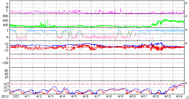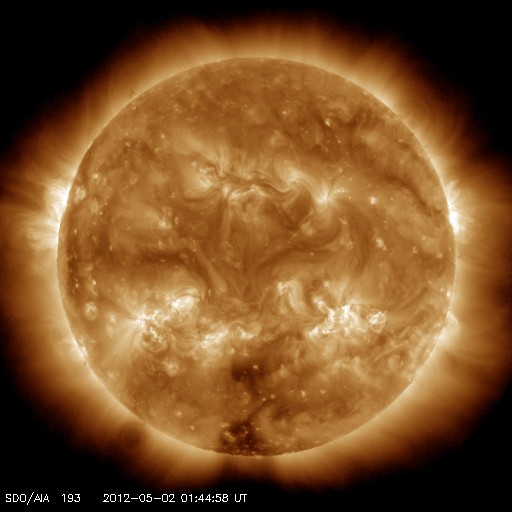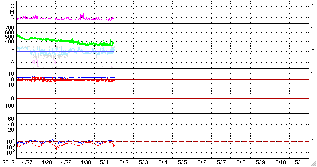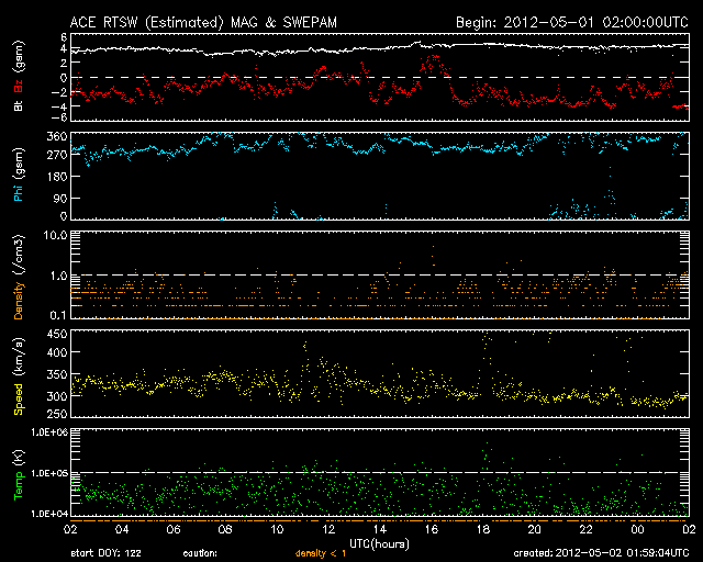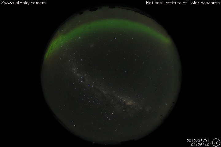 2012/ 5/ 2 10:59 更新 太陽風は300km/秒とかなり遅くなっています。太陽ではCクラスのフレアが続いています。 担当 篠原 南極の昭和基地の写真が少し復活していました。 昨日の朝(5月1日10時半)の写真ですが、ページで見られた最新の写真を紹介します。 穏やかなオーロラの光の帯が、南極方向にあたる上側に横たわり、 それを斜めに横切る様に、明るい天の川が空を覆っています。 写真の中心から左に目を向けると、天の川の中に南十字星がひっくりかえっています。 また、中心から上に進んで、オーロラの少し下には、 大小ふたつのマゼラン雲が見えます。 また、中心から下に降りた天の川の濃いあたりには、 ひっくりかえったさそり座も見えていますが、ちょっと難しいかもしれません。 南極大陸の星空です。 月のない夜の全天カメラは、オーロラがなくても楽しめます。 穏やかな太陽風が続いています。 速度は、330km/秒から300km/秒へ更に下がり、 300km/秒台を割りそうな様子です。 磁場強度は、4nTを少し越えたくらいで、平均的な強さです。 磁場の南北成分は、-1〜-3nTと弱い南向きが続いています。 速度が遅いこともあり、地球への影響度は小さく、 AE指数のグラフでは、小さな変化が時々見られる程度です。 ただし、現在の様に太陽風が穏やかな時は、オーロラの活動領域が極側に寄るので、 AE指数の観測点では変動が捉えきれないということも注意が必要です。 (掲載の昭和基地の写真でも、オーロラは南極側に遠ざかっています) 太陽風は、今後も低速風が続きそうです。 SDO衛星AIA193では、東端近くのコロナホールはまだ見えません。 放射線帯の高エネルギー電子は、今日も高い状態が続いています。 減少はゆっくりです。 太陽では、昨日の昼に、C3.9、C1.2の小規模フレアが発生し、 今朝も、C1.2、そしてちょうど今、C1.8の小規模フレアが発生しています。 小規模の活動ばかりですが、ある程度の活動度が続いています。 この傾向はまだしばらく続きそうです。 黒点は、南西(右下)に1473黒点群が発生しています。