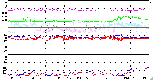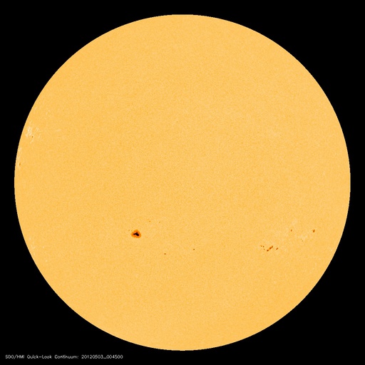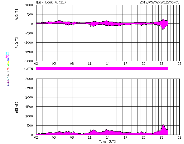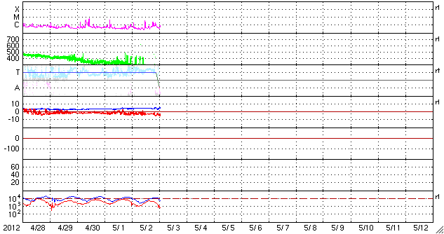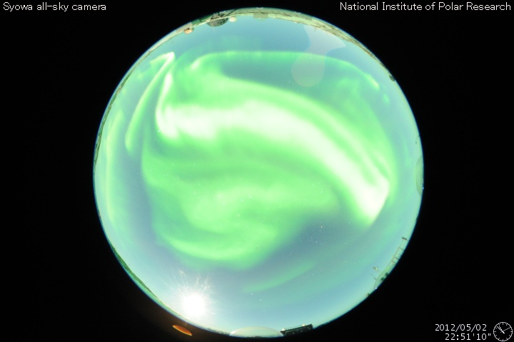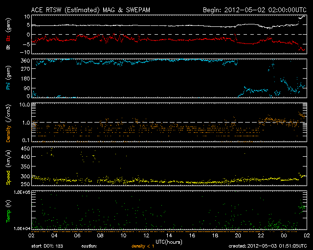 2012/ 5/ 3 10:52 更新 太陽の東端にコロナホールと新しい黒点群が見えてきました。太陽風磁場の南向きが強まっています。 担当 篠原 太陽の東端に、南北に伸びるコロナホールが見え始め、 更にその向こうからは、新しい黒点群が顔を出しています。 コロナホールは、太陽が一回自転した27日前よりも、 やや北寄りに見えている様です。 東西方向への大きな移動はなさそうなので、 太陽風に影響が見られるのは、前周期の4月12日の27日後にあたる 5月9日前後になりそうです。 もう2〜3日すると、より詳しく分かる様になるでしょう。 前周期は、最高600km/秒に達する高速の太陽風が3日ほど続きました。 太陽の東端の北半球側から、2つの黒点群が顔を出しています。 北寄りの黒点群には1474黒点群という番号が付いています。 フレアの活動も見られ、今後注目して下さい。 太陽では、西の端や、1469黒点群などでも小規模のフレアが発生し、 C3.2、C2.2、C2.1、C1.9、などが記録されています。 黒点の変化も見られ、小中規模のフレアの活動はこのまま続きそうです。 太陽風の速度は、300km/秒を割って、270km/秒くらいまで下がっています。 ここまで速度がしっかり下がるのは、 昨年の12月末以来、4ヶ月ぶりのことです。 磁場強度は、5nTと平均的な強さに戻っています。 南北成分の南寄りの傾向も続いていて、 ACEの赤線は、ずっと -3nT付近を上下しています。 ACEのグラフの後半を見ると、太陽風磁場のセクター境界が来た様です。 この関係で、磁場の南向きが少し強まり、 また、最新のデータは磁場強度が10nT近くに強まっています。 南向きも強まっているので、今後の変化に注目して下さい。 磁気圏の活動は比較的穏やかでしたが、 後半に太陽風の変化に対応して、AE指数で500nTの変動が起きています。 この時間帯に、昭和基地でもにぎやかなオーロラの活動が撮影されています。 磁場の南向きは強まっているので、これから活動が大きくなりそうです。 放射線帯の高エネルギー電子は、やや下がりながら、 今日も高いレベルに達していました。 しかし、太陽風、磁気圏の弱い乱れが影響して、 この後大きく減少するのではないかと思います。 ![]() 南極の昭和基地で全天カメラにより撮影された、世界時5月2日23時頃のオーロラ。 (c) 国立極地研究所 ![]() SDO衛星のAIA193カメラによる太陽コロナの様子 (c) SDO (NASA) ![]() SDO衛星による太陽の可視光写真。マウスの矢印を写真に重ねると、黒点番号付きの写真に切り替わります。 (c) SDO (NASA) ![]() GOES衛星の太陽X線データ (c) NOAA/SWPC ![]() ACEが観測した太陽風の磁場(1番上の枠、白線は全体の強度、赤線は南北成分) および、太陽風の密度(3番目の橙線)、速度(4番目の黄線) (c) NOAA/SWPC ![]() リアルタイムAE指数 下段のAEグラフの値が高くなると、オーロラ活動が活発化しています。 (c) 京都大学, NICT ![]() 27日の太陽周期に合わせたデータプロット 太陽が同じ面を地球に向けていた27日前の変化から、今後を予想することができます。 (c) 作図:宇宙天気ニュース