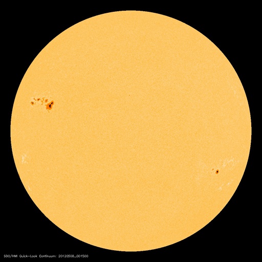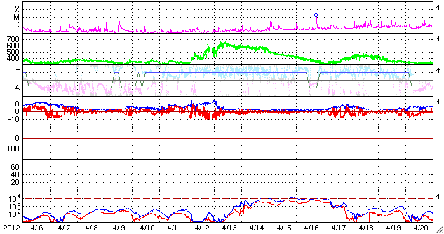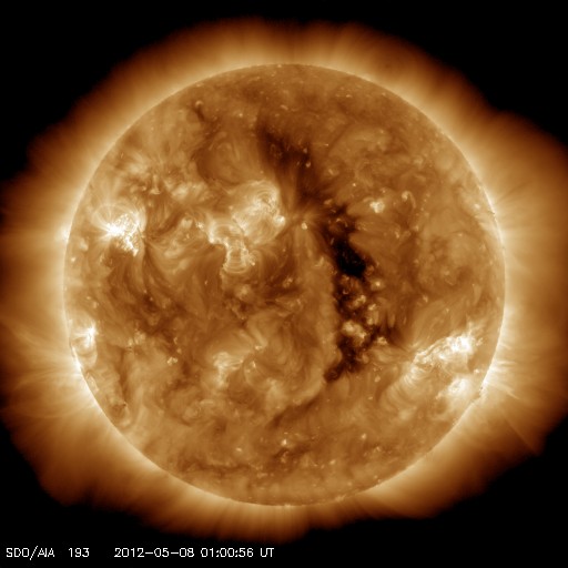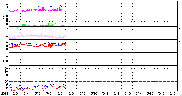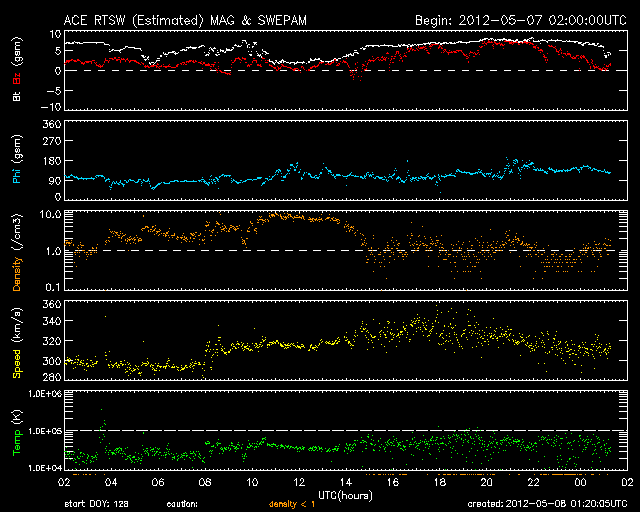 2012/ 5/ 8 10:21 更新 M1.9の中規模フレアが発生してCMEも噴出しています。明日くらいから高速の太陽風が到来しそうです。 担当 篠原 活発にフレアの発生が続いています。 昨日のニュース以降は、 太陽の北東の1476黒点群で、 7日11時半(世界時7日2時半)にC7.1、 7日20時(世界時7日11時)にC7.9、 8日2時半(世界時7日17時半)にC7.4、 などの大きめのCクラスフレアが発生し、 太陽の南西の1471黒点群でも、 7日23時(世界時7日14時)にM1.9の中規模フレアが発生しています。 M1.8の中規模フレアの様子を、GOES衛星のX線カメラの動画で紹介します。 このフレアに伴って、CME(太陽ガスの放出現象)も発生しているようで、 太陽を左奥側から見ているSTEREO Behind衛星のコロナグラフでは、 太陽全体を包むように白いガスが広がっている様子を見ることが出来ます。 このガスは、衛星からは太陽の向こう側に噴き出していると思われます。 やや斜め方向ですが、3日後の11日頃に、地球にもある程度の影響が及びそうです。 太陽の北東の1476黒点群は、大きくて複雑な姿を保っています。 今後もフレアの発生が続きそうです。 太陽風は、穏やかな状態が続いています。 速度(ACEの図の黄色線)は、300〜320km/秒と遅い状態で安定しています。 磁場強度(白線)は、3nTから8nTの間をゆっくりと変化していますが、 南北成分(赤線)は北向き(プラス方向)に向いているため、磁気圏への影響は小さく、 オーロラの活動度を示すAE指数のグラフは全く変化していません。 今日はこのまま穏やかに経過して、 明日くらいからコロナホールによる高速の太陽風に変わりそうです。 SDO衛星AIA193の太陽コロナ写真を見ると、 太陽の中心部に南北(縦方向)に広がるコロナホール(薄暗い領域)は、 太陽の中心線を過ぎて、西半球に移っています。 このコロナホールが太陽の右側に半分ほど動いた頃が、 高速太陽風が地球に到達する目安です。 ![]() GOES-15のX線カメラによる、太陽の南西、1471黒点群で発生したM1.9のフレア。 (c) NOAA/SWPC 、(動画加工 : 宇宙天気ニュース) ![]() STEREO Behind衛星による、M1.9のフレアに伴って発生したCME。 (c) STEREO (NASA)、 (動画加工 : 宇宙天気ニュース) ![]() SDO衛星のAIA193カメラによる太陽コロナの様子 (c) SDO (NASA) ![]() SDO衛星による太陽の可視光写真。マウスの矢印を写真に重ねると、黒点番号付きの写真に切り替わります。 (c) SDO (NASA) ![]() GOES衛星の太陽X線データ (c) NOAA/SWPC ![]() ACEが観測した太陽風の磁場(1番上の枠、白線は全体の強度、赤線は南北成分) および、太陽風の密度(3番目の橙線)、速度(4番目の黄線) (c) NOAA/SWPC ![]() リアルタイムAE指数 下段のAEグラフの値が高くなると、オーロラ活動が活発化しています。 (c) 京都大学, NICT ![]() 27日の太陽周期に合わせたデータプロット 太陽が同じ面を地球に向けていた27日前の変化から、今後を予想することができます。 (c) 作図:宇宙天気ニュース