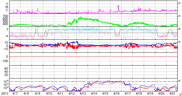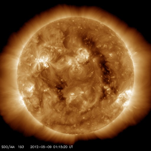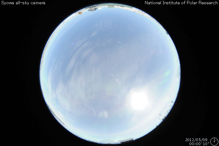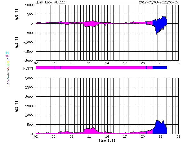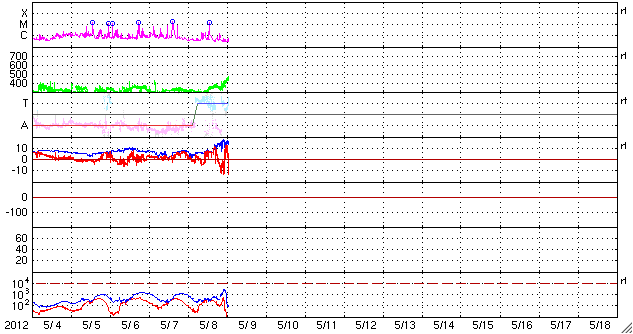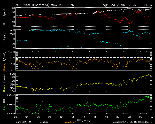 2012/ 5/ 9 10:56 更新 コロナホールによる太陽風の乱れが始まりました。オーロラの活動も強まっています。 担当 篠原 太陽風の乱れが始まりました。 昨夜から、太陽風の磁場強度は10nTを超えて強まり、 現在も15nT付近で推移しています。 速度も、今朝から上昇を始め、 現在、470km/秒と高速状態に変わりつつあります。 SDO衛星AIA193の太陽コロナ写真に見えていたコロナホールの影響が 地球に及び始めたのだと思われます。 27日周期の図で前周期と比較すると、半日ほど早まったくらいで、 ほぼ、自転周期通りに回帰した印象です。 磁場強度が強まっていることから、速度は更に上昇すると思われます。 前周期も600km/秒台まで高まっていました。 今後の変化に注目して下さい。 磁場強度の強まりとともに、磁場の南北成分も大きく振れています。 -10nTと強く南を向くことも度々で、この影響で磁気圏の活動も強まっています。 AE指数のグラフは、700nTくらいの中規模の変化を記録しています。 まだ、データがそろっていない状況ですので、今後のアップデートにも注目です。 南極の昭和基地で、この擾乱による活発なオーロラが観測されています。 月が明るく光っているため、観測条件は厳しいですが、 空を覆うようにオーロラのにぎやかな輝きを見ることができます。 太陽風の速度が次第に高まっているため、 今後も磁場が大きく南向きに振れると、 一段と活発な磁気圏活動が発生するでしょう。 太陽は、1476黒点群が昨日よりも大きくなっている様です。 昨夜、8日22時(世界時8日13時)にM1.4の中規模フレアを起こしていますが、 X線グラフの変化は弱まっている様に見えます。 しばらく休んで、再び活動を強めるということも良く見られるので、 引き続き太陽の活動には注目してください。 また、南東から1477黒点群が顔を出しています。 どの様な活動を見せるでしょうか。 ![]() 南極の昭和基地で、全天カメラにより撮影されたオーロラの活動。 (c) 国立極地研究所、(動画加工 : 宇宙天気ニュース) ![]() SDO衛星のAIA193カメラによる太陽コロナの様子 (c) SDO (NASA) ![]() SDO衛星による太陽の可視光写真。マウスの矢印を写真に重ねると、黒点番号付きの写真に切り替わります。 (c) SDO (NASA) ![]() ACEが観測した太陽風の磁場(1番上の枠、白線は全体の強度、赤線は南北成分) および、太陽風の密度(3番目の橙線)、速度(4番目の黄線) (c) NOAA/SWPC ![]() リアルタイムAE指数 下段のAEグラフの値が高くなると、オーロラ活動が活発化しています。 (c) 京都大学, NICT ![]() 27日の太陽周期に合わせたデータプロット 太陽が同じ面を地球に向けていた27日前の変化から、今後を予想することができます。 (c) 作図:宇宙天気ニュース