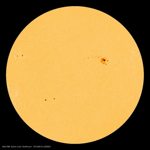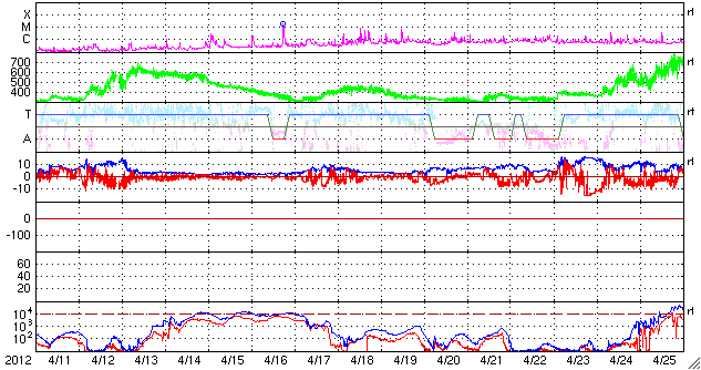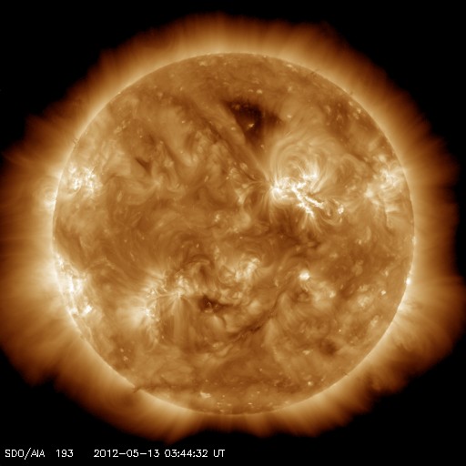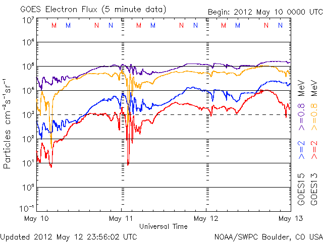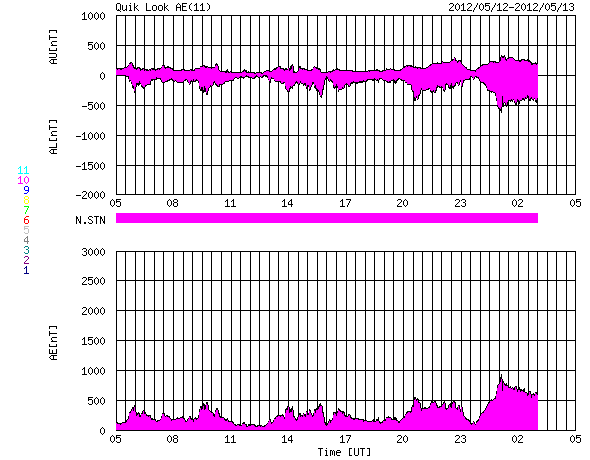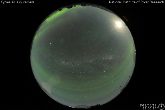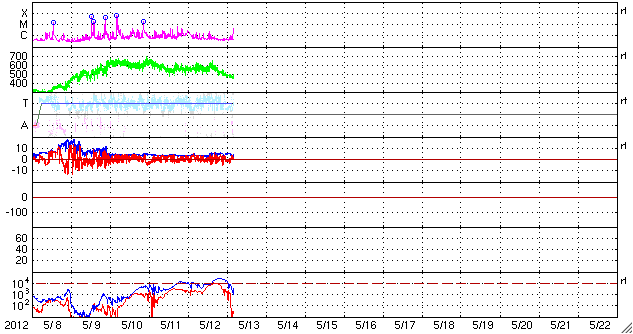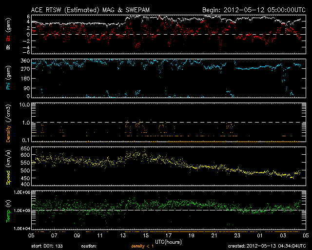 2012/ 5/13 13:32 更新 速度はやや下がりましたが、高速太陽風が続いています。フレアの活動は弱まっています。 担当 篠原 太陽風の速度は、550km/秒から470km/秒ほどへ、 ゆっくりと下がっています。 変化の幅はそれほど大きくなく、太陽風はまだ高速の状態が続いています。 ACEの図の前半、12日22時(世界時12日13時)頃に、 磁場強度の小さな強まり(4nTから6nT弱へ)と、 速度の小さな変化(550km/秒から600km/秒弱へ)が起きています。 この辺りから、小さなコロナホールの影響が及び始めたのかもしれません。 磁気圏では、小規模や中規模のオーロラ活動が続いている様です。 AE指数のグラフは、前半は300〜500nTの変化が、 後半からは500nT以上の変化が頻繁に起きています。 この活動の一部、世界時12日22〜24時の昭和基地の様子を動画で紹介します。 月が小さくなってきたこともあり、空全体を覆うようなオーロラの輝きが 美しく記録されています。 速度の高い太陽風は、明日くらいまで続くかもしれません。 放射線帯の高エネルギー電子は、昨日よりももう一段上昇して、 GOES13の赤線も10,000の線を超えています。 一方、その後の磁気圏の活動に伴って、大きく減少している様です。 明日はもう10,000の線を割っているかもしれません。 昨日のニュース以降、太陽の活動は落ち着いています。 C1からC2の小さな小規模フレアが数回起きた程度で、 1476黒点群の勢いが弱まった様です。 可視光線の写真でも、黒点は小さくなっている様です。 つい先ほど、C4.5とやや大きめの小規模フレアが発生しました。 発生地点は1476黒点群の様です。 このまま単発で終わるのか、再び活動度が上がるのか、 この後の変化も注目してください。 ![]() 南極の昭和基地で、全天カメラにより撮影されたオーロラの活動。 (c) 国立極地研究所、(動画加工 : 宇宙天気ニュース) ![]() SDO衛星のAIA193カメラによる太陽コロナの様子 (c) SDO (NASA) ![]() SDO衛星による太陽の可視光写真。マウスの矢印を写真に重ねると、黒点番号付きの写真に切り替わります。 (c) SDO (NASA) ![]() ACEが観測した太陽風の磁場(1番上の枠、白線は全体の強度、赤線は南北成分) および、太陽風の密度(3番目の橙線)、速度(4番目の黄線) (c) NOAA/SWPC ![]() リアルタイムAE指数 下段のAEグラフの値が高くなると、オーロラ活動が活発化しています。 (c) 京都大学, NICT ![]() 27日の太陽周期に合わせたデータプロット 太陽が同じ面を地球に向けていた27日前の変化から、今後を予想することができます。 (c) 作図:宇宙天気ニュース