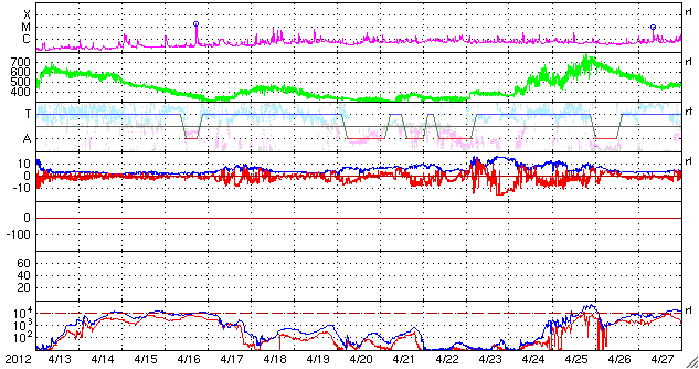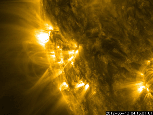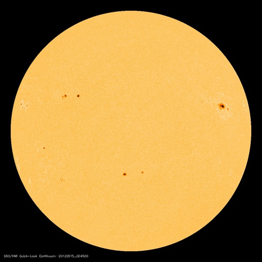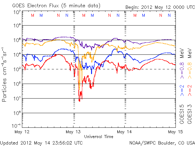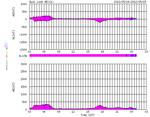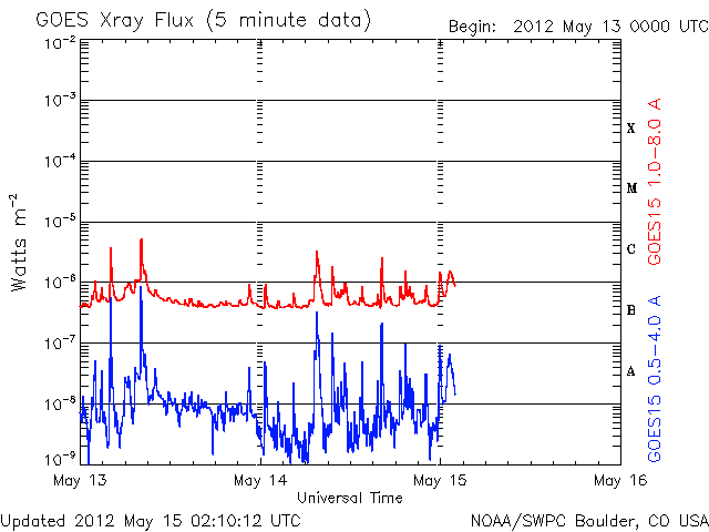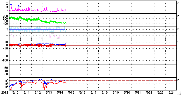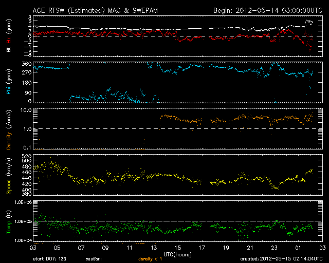 2012/ 5/15 11:14 更新 太陽ではCクラスのフレアが度々発生しています。太陽風の速度は下がりつつあります。 担当 篠原 太陽の可視光写真を見ると、 1476黒点群はだいぶ小さくなってしまいました。 それでも、小規模のフレア活動は続いていて、 C4.1、C2.5などのCクラスフレアや、 GOES衛星のX線動画を見ていると、小さな活動が頻繁に起きています。 また、東端に現れた黒点群でも、小さな変動が良く見られています。 南東の1483黒点群では、C1.7のフレアも発生しました。 この領域の太陽コロナの様子を、SDO衛星AIA171の動画で紹介します。 ループプロミネンスの輝きや、暗いガスが噴き上がって行く様子など、 様々な変動を見ることができます。 太陽の東側は、黒点は小さいですが、活動的な領域が多く、 今後の活動に注目してください。 太陽風は、昨日の午後に速度が480km/秒から440km/秒に一段下がり、 高速状態は終わりつつある様です。 この後、12日のCMEの影響で、太陽風の弱い乱れが到来する可能性がありますが、 全体としては、太陽風は次第に穏やかな風に変わって行くでしょう。 磁気圏の活動も弱まっています。 AE指数のグラフは、変化の幅が小さくなり、 300nT程度の小規模の乱れが部分的に見られる程度です。 太陽風が更に穏やかになれば、磁気圏も穏やかな状態が続くでしょう。 放射線帯の高エネルギー電子は、 昨日と同程度で、GOES-15(青線)は10,000の線に達しています。