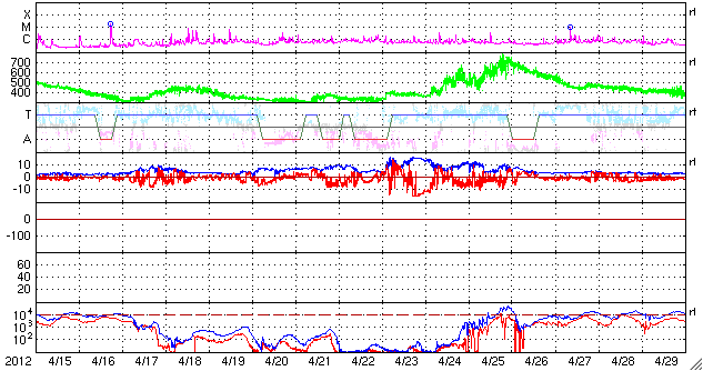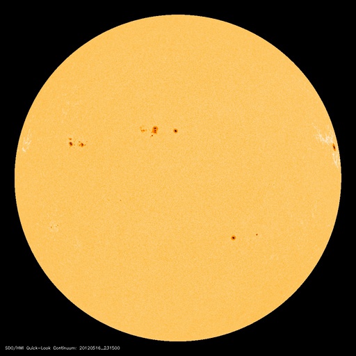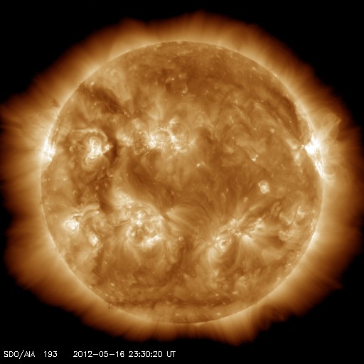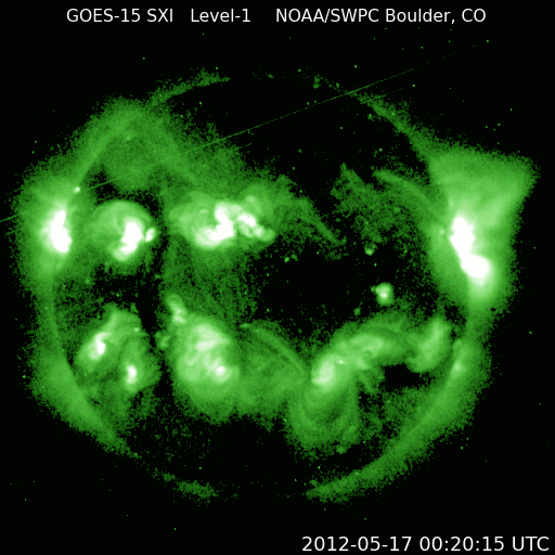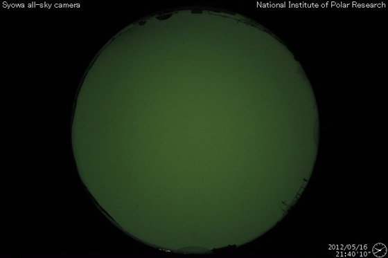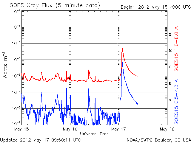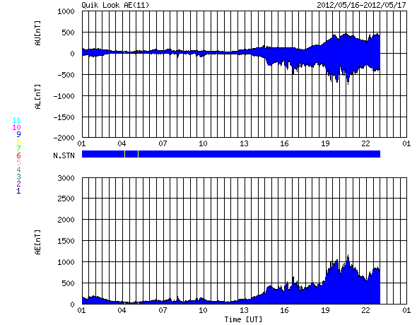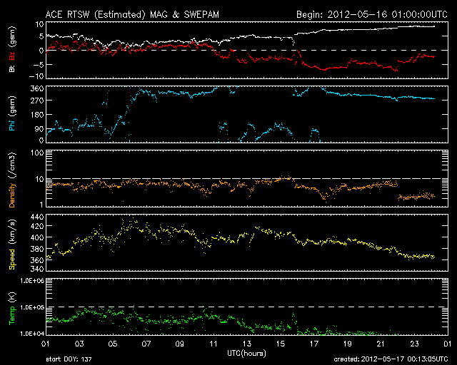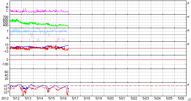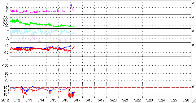 2012/ 5/17 09:12 更新 太陽風磁場の南向きが強まり、オーロラの活動を強めました。太陽のフレア活動は落ち着いています。 2012/ 5/17 18:54 追加 1476黒点群でM5.1の中規模フレアが発生しました。 担当 篠原 太陽風の磁場強度がやや強まり、南向きに振れてオーロラ活動を強めています。 昨夜、16日21時(世界時16日12時)頃から、 太陽風の磁場が強まり始め、南北成分は南向きに振れる様になりました。 磁場強度は半日かけて、現在8nTくらいまで強まっています。 大きさとしては、平均的な状態よりもやや強まっているくらいの値です。 また南向きの磁場も同程度に強まり、 17日2時(世界時16日17時)くらいからは、 -7nTに振れた状態が5時間ほど続きました。 現在は-2nTと南向きの振れは弱まっています。 太陽風の速度は、磁場の強まりに先立つように400km/秒に高まり、 その後、360km/秒に下がっています。 磁場が南向きに強まった影響で、磁気圏の活動が強まりました。 AE指数のグラフは、500nTから1000nT程度の変動が発生しています。 残念ながら曇っていたのですが、この頃の昭和基地の全天カメラの様子を紹介します。 雲越しに、活発にオーロラが発生していたことが分かります。 27日周期の図を見ると、 今回の太陽風の乱れが特に大きなものではないことが分かります。 この後は、乱れは次第に弱まって、太陽風は低速の風が続くと思われます。 太陽は、1476黒点群がいよいよ西に没しようとしています。 昨日も、C2.5の小規模フレアを起こしましたが、 活動もこのあたりまでの様です。 今後は東半球に見えている黒点群の活動に注目ですが、 今のところ、活動の規模は小さく、 X線のグラフには目立った変化は起きていません。 2012/ 5/17 18:54 追加 (篠原) 関連の図はページの最後にあります 今日のお昼前、17日10時半(世界時17日1時半)に、 太陽の西の端近くの1476黒点群で、M5.1の中規模フレアが発生しました。 GOES衛星X線カメラによる発生時の様子と、 SOHO衛星LASCO C2、C3カメラによる、その後のCMEの噴出を、 速報として紹介します。 どちらも、肝心の時間帯の写真が欠けていたりしますが、 リアルタイムのデータでは仕方ありません。 X線グラフの変化は、長時間型のフレアとなっています。 CMEは地球からは横方向に噴き出していますが、 地球への影響はどうなるでしょうか。 また、フレアが西側で発生したため、 太陽からの放射線(非常に高速の陽子)も急に増加しています。 1476黒点群は向こう側に回って行きますが、裏側でも活発な活動を見せるかもしれません。